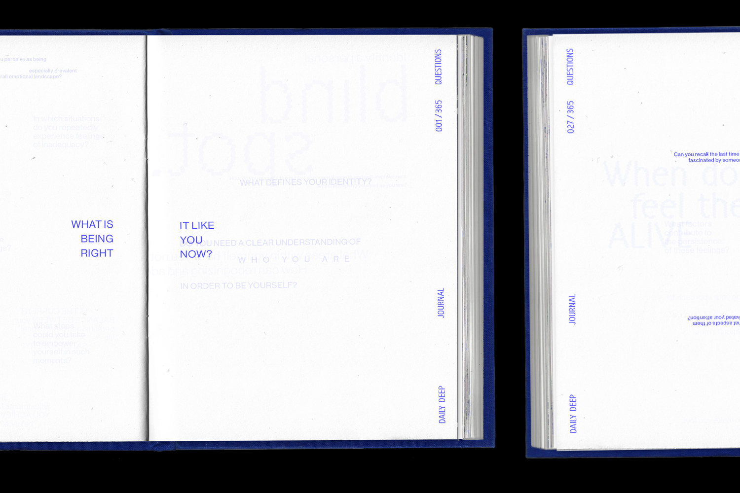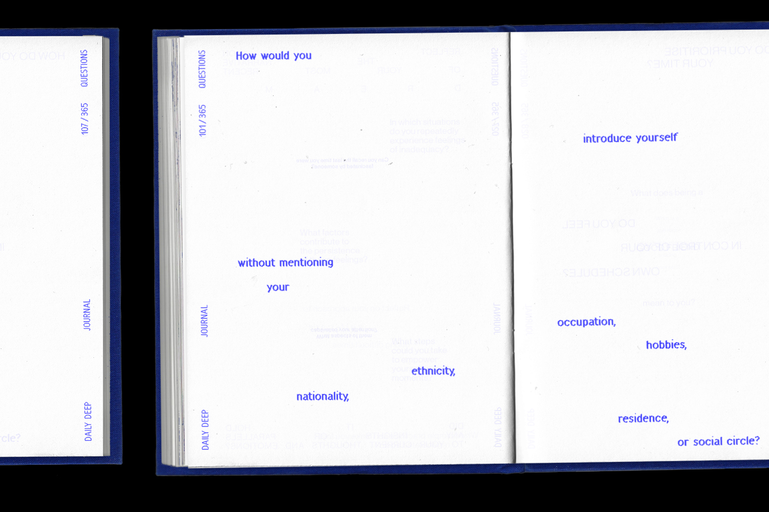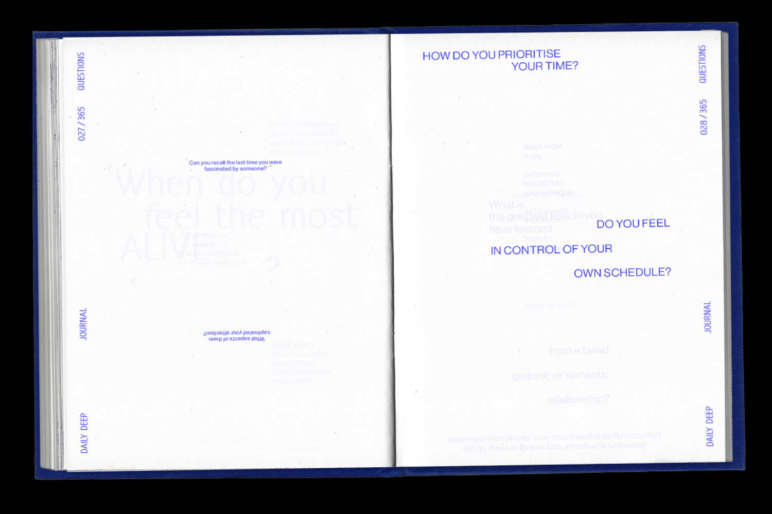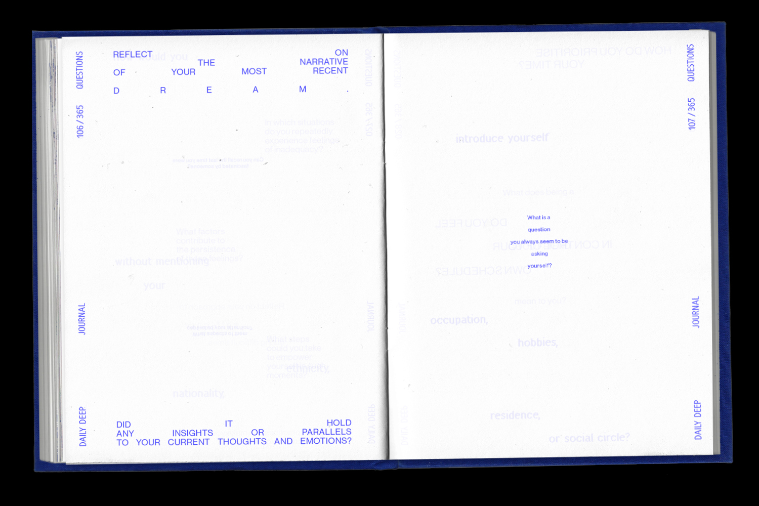 dailydeep is a self-reflection project disguised as a journal. It compiles 365 questions to deepen your relationship with yourself – on 365 individually designed pages. The journal creates a frame for self-discovery – leaving space to grow into. Every blank becomes a personal trace, turning each copy into a unique reflection of its user.