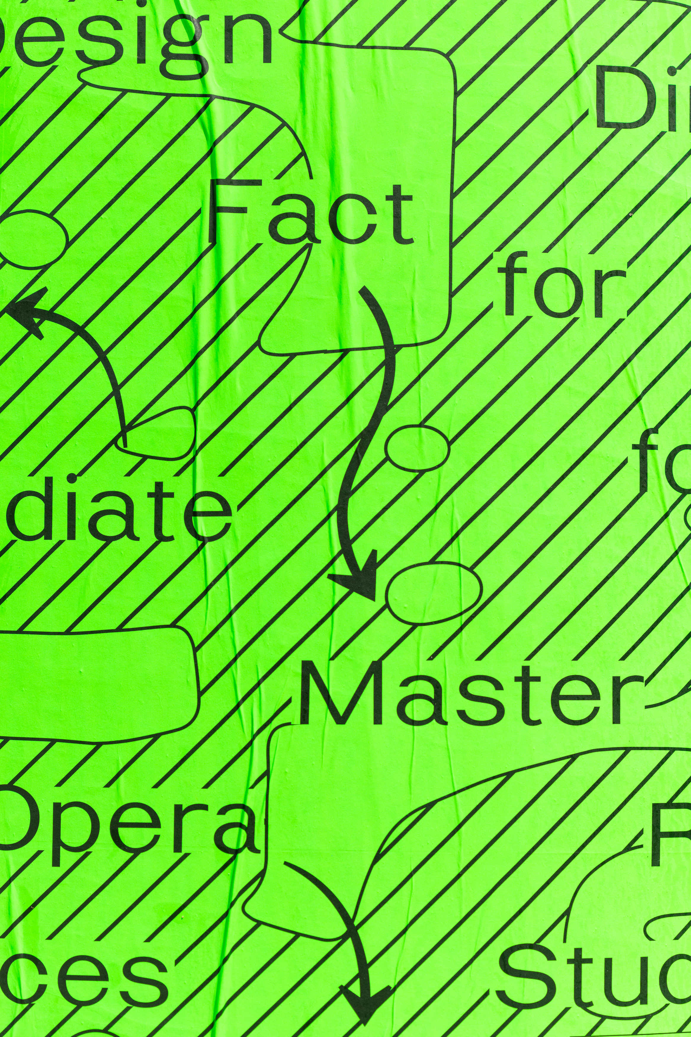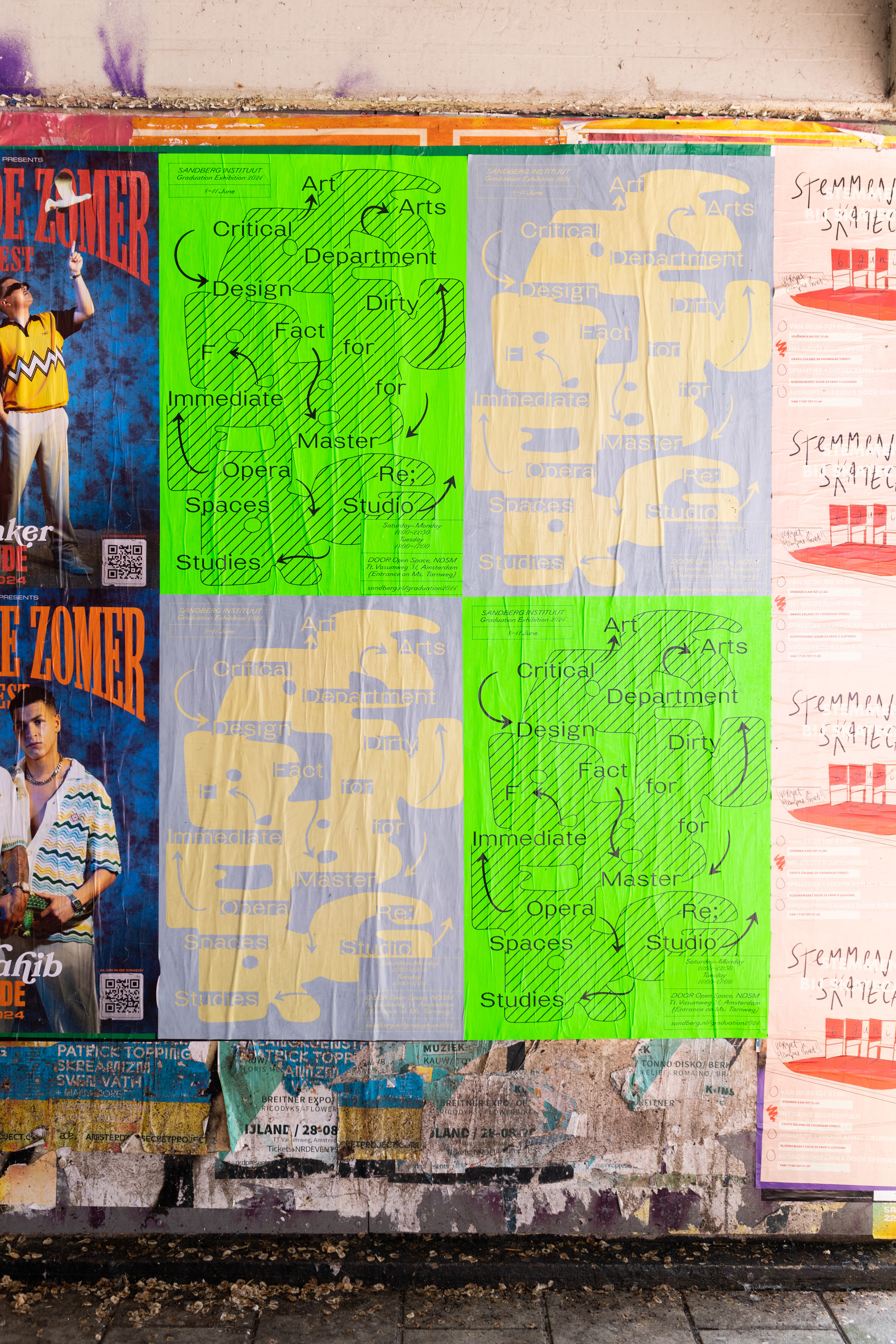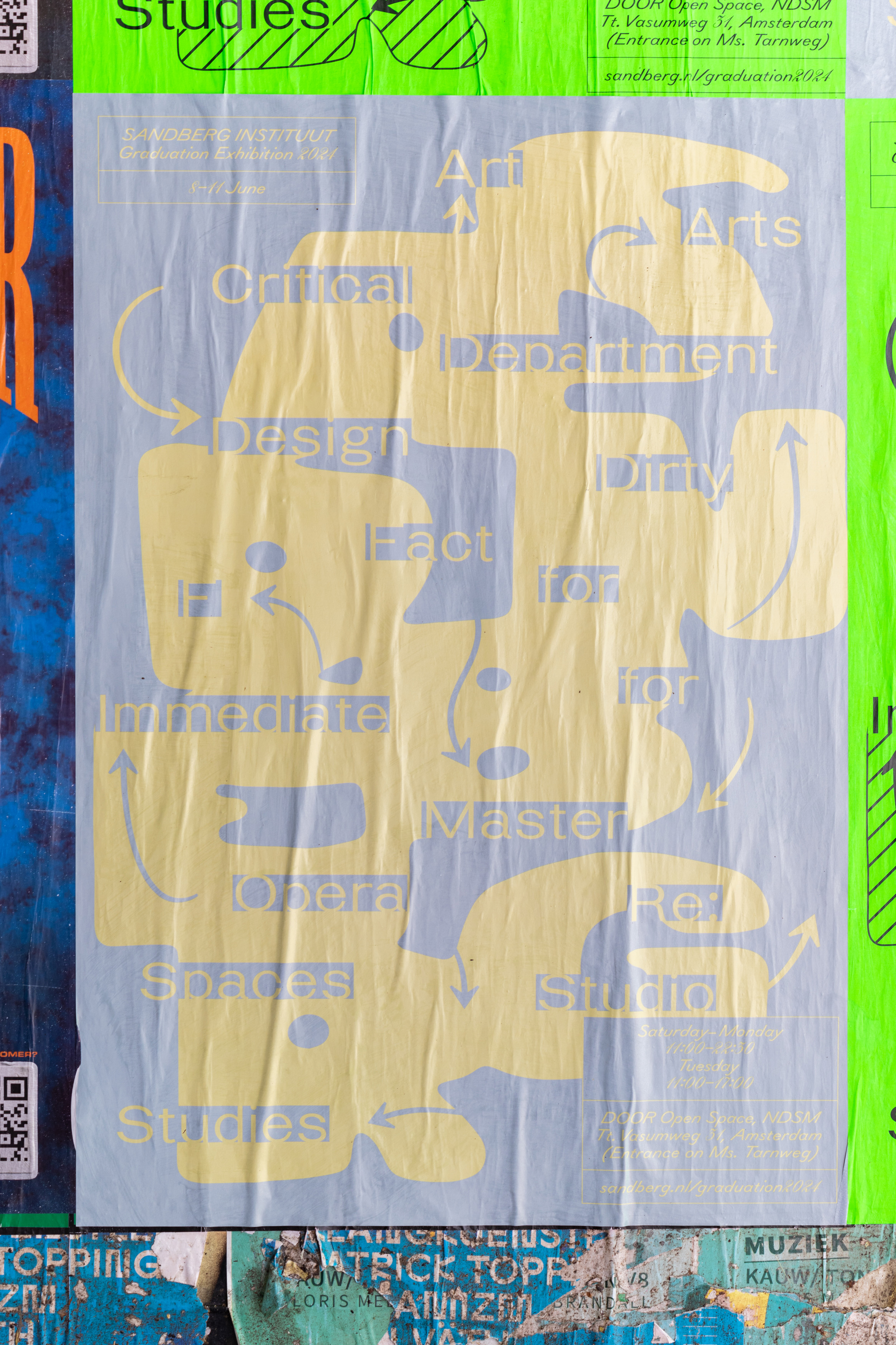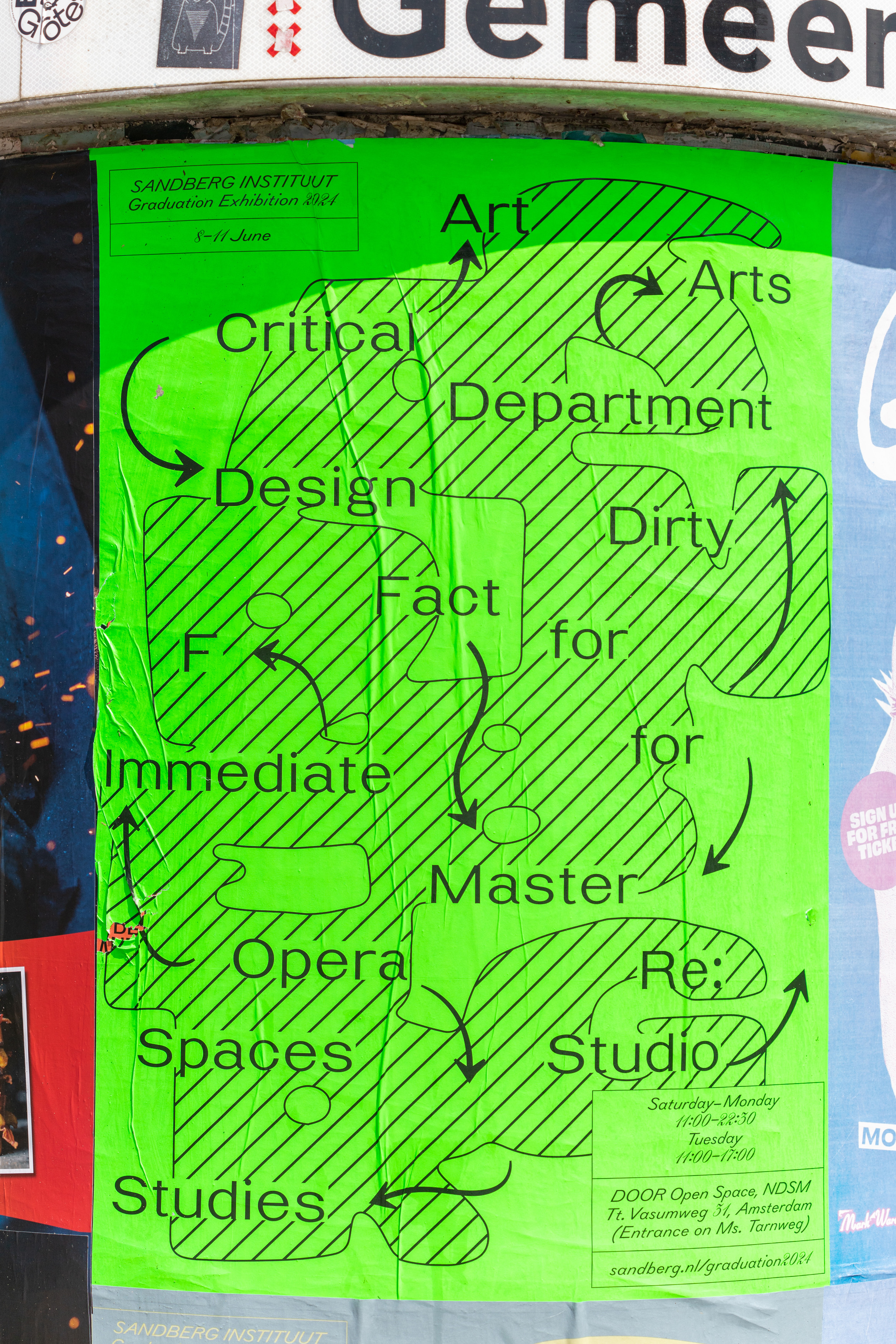 Poster campaign for the 2024 graduation exhibition of the Sandberg Instituut in Amsterdam. Designers Katherina Gorodynska and Jan Egbers started out from looking at weather maps, and ended up developing a typographic system of (mis)direction, inviting visitors to meander and get sidetracked in the show. On the posters, the names of the different Sandberg MA programmes are cut up and rearranged, suggesting new departments for study. All text is set in Gauche, a typeface Jan developed together with Céline Hurka, making full use of the typeface’s baseline-shifted italic and the “fancy” numerals provided via an OpenType feature.