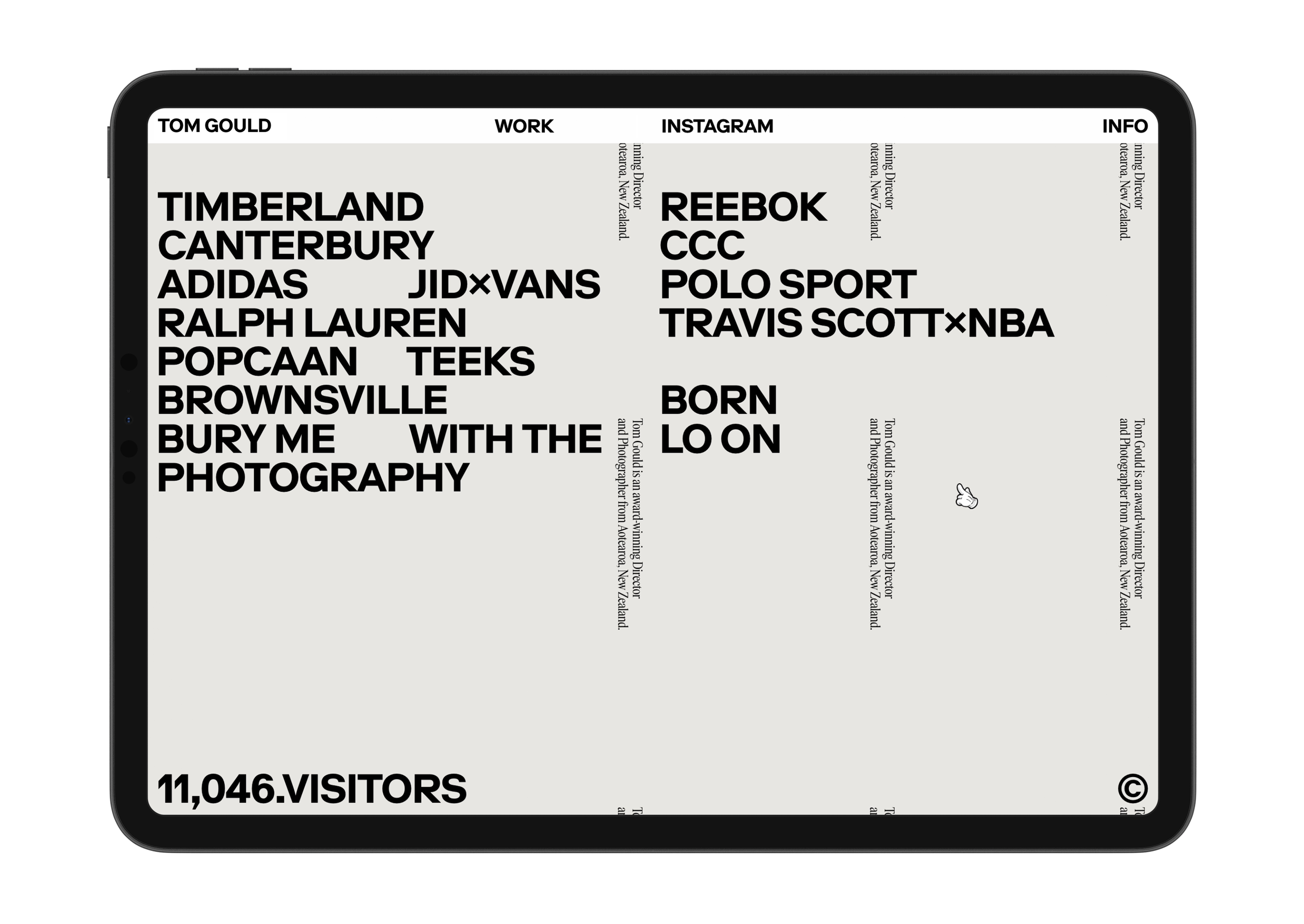 Tom Gould Contributed by Nick de Jardine on Jan 23rd, 2025. Artwork published in circa 2024. Grafik. License: All Rights Reserved. Website and identity design for Tom Gould, a director from New Zealand, pairing all caps LL Riforma with Items Condensed. Grafik. License: All Rights Reserved. Grafik. License: All Rights Reserved. Grafik. License: All Rights Reserved. Grafik. License: All Rights Reserved. Typefaces More about LL RiformaGet LL RiformaMore about ItemsGet Items Formats Web (5571) Branding/Identity (8372) Topics Film/TV (2012) Designers/Agencies Grafik (23) Tagged withfilm directors (20)websites (3521)identities (2321)typeface combinations (3903)all caps (7521)rotated type (2206)menus (UI) (557)business cards (1523)animated type (427)portfolios (760) Artwork location New Zealand (184) In Setsweb (miguel anønimo) (135)GEN Z branding (Michael Nassef) (10)UI design (Philippe Lepilleur) (14)business cards (Philippe Lepilleur) (38) Post a comment Name Email – will not be published Website Your response Submit Comment More LL Riforma in use Gabriele Basilico. ROMA2025Tomo TomoContributed by Sophia Tai Staff Pick Lausanne Underground Film & Music Festival 20182018Dimitri JeannottatPierre CharmillotTiphaine AllemannContributed by Ali Rasheed Staff Pick MUBI identity2019SpinMubiContributed by Lineto Staff Pick Sponsor More in Film/TV Loaded: Lads, Mags and Mayhem documentary2024BBC TelevisionAna ProjectsContributed by Gareth Hague Crossword movie posterc. 2024YENCE StudioContributed by Jens Wagner The Hit titles1984unknownContributed by David Smith Bring On The Night (1985) teaser poster1985Contributed by Garrison Martin More in Branding/Identity The Black School identity2016Joseph Cuillier IIIShani PetersMitchell Reese JohnsonContributed by Stephen Coles Fanta international websitesc. 2017KotoCoca-ColaContributed by Darden Studio Staff Pick Théâtre en mai 20232022Brest Brest BrestContributed by Benoît Bodhuin Wieniawski Society rebranding2025TOFU StudioContributed by Daniel Naborowski More Fonts In Use “The frost won’t bite!” – Gilbey’s Gin ad1977Contributed by Garrison Martin Staff Pick Robert Thorne and the origin of the ‘modern’ fat face, Poem Pamphlet No. 22020Jérôme KnebuschContributed by Jérôme Knebusch Staff Pick Nomadic Furniture 1 and 21973James HennesseyVictor PapanekContributed by Robert Beatty Staff Pick West Quay stair screen, Poole2023Dallas–Pierce–QuinteroStephen BarrettContributed by Benoît Bodhuin Staff Pick