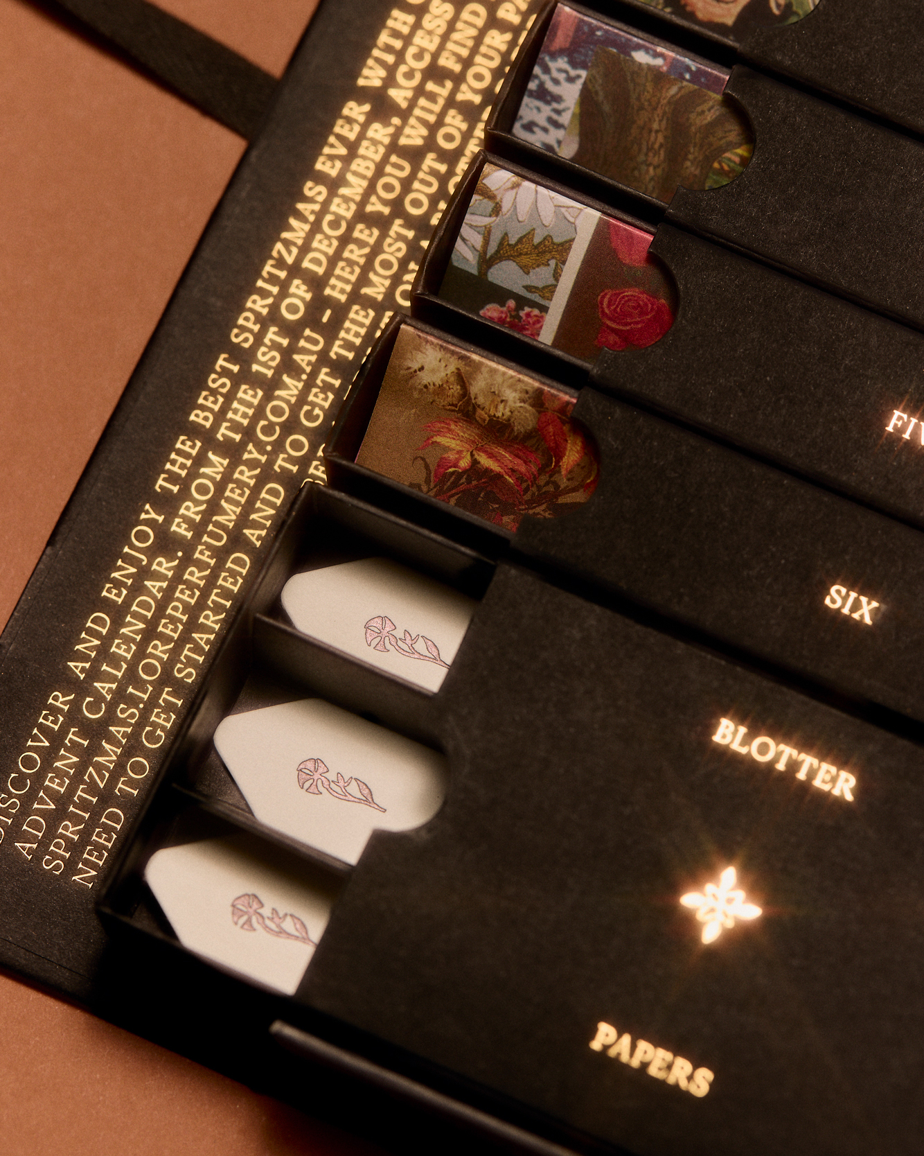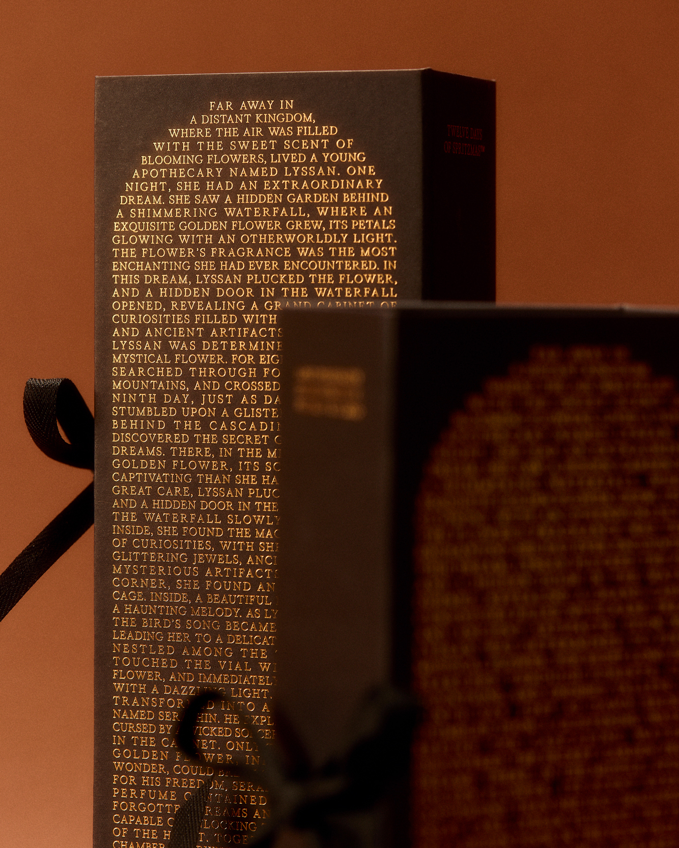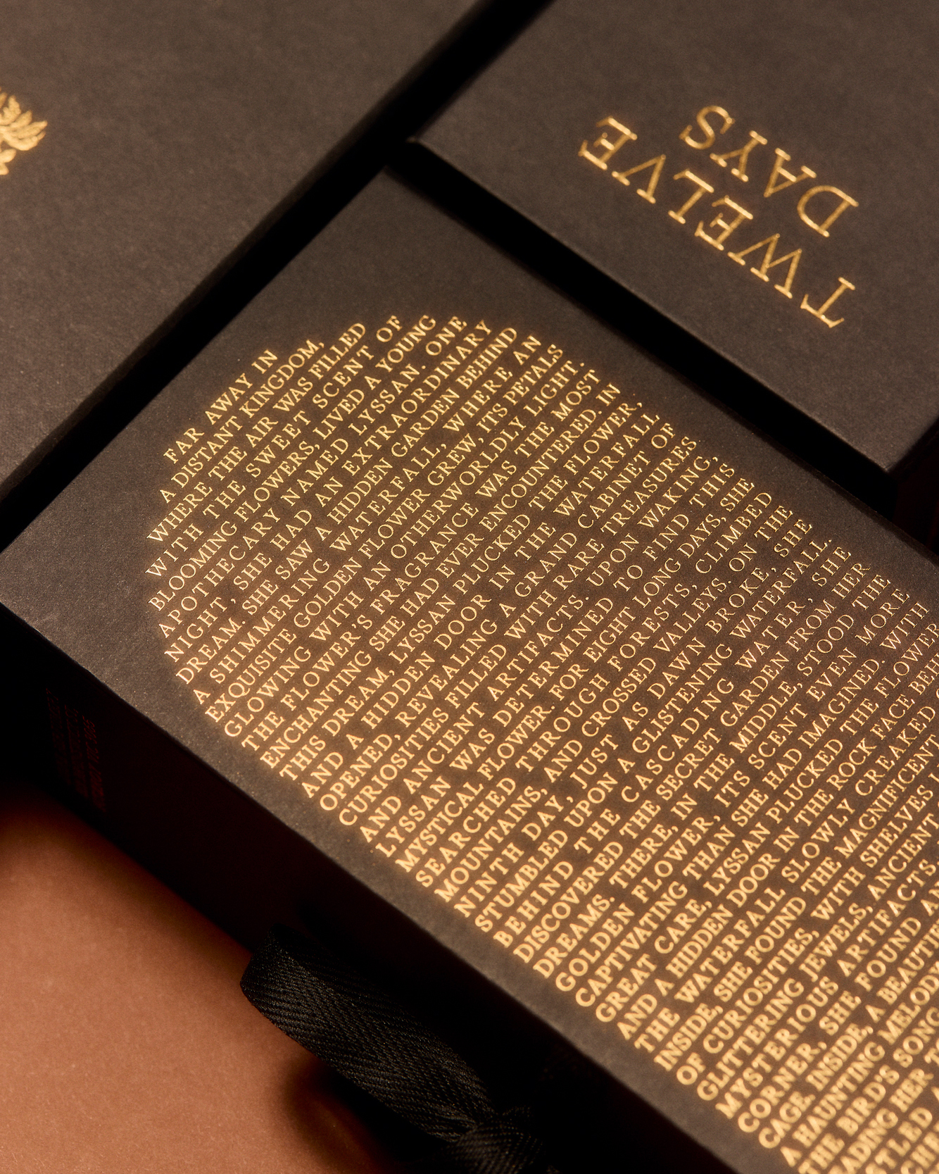 Over twelve days and nights, the narrative unfolds, with each drawer and chapter revealing a curated scent sample, a scent card, a blotter, and detailed accompanying videos hosted on an online digital storybook.