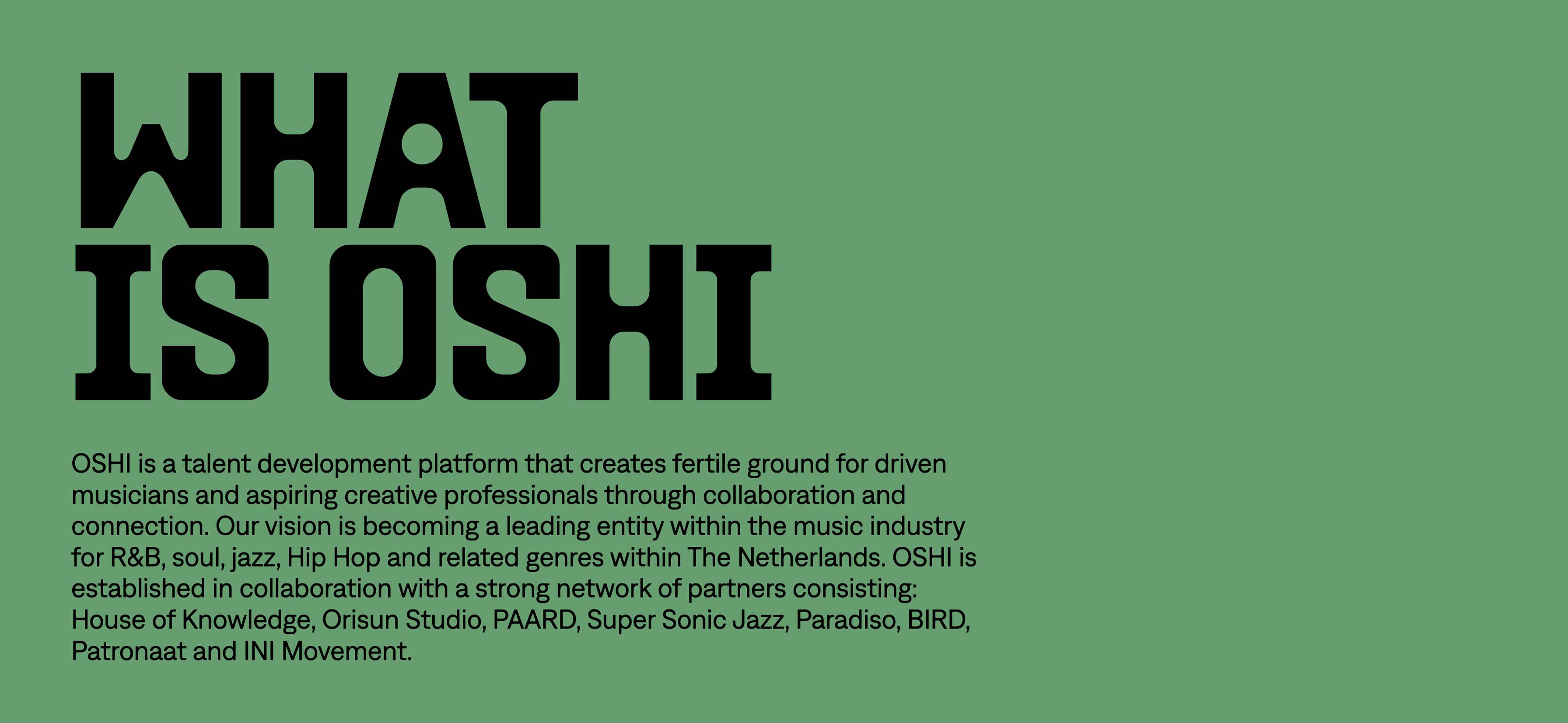 OSHI is a talent development platform that creates fertile ground for driven musicians and aspiring creative professionals through collaboration and connection. Inspired by R&B, soul, jazz, hip hop and related genres cultures, the visual identity of OSHI is based on a colorful and impactful graphic system.