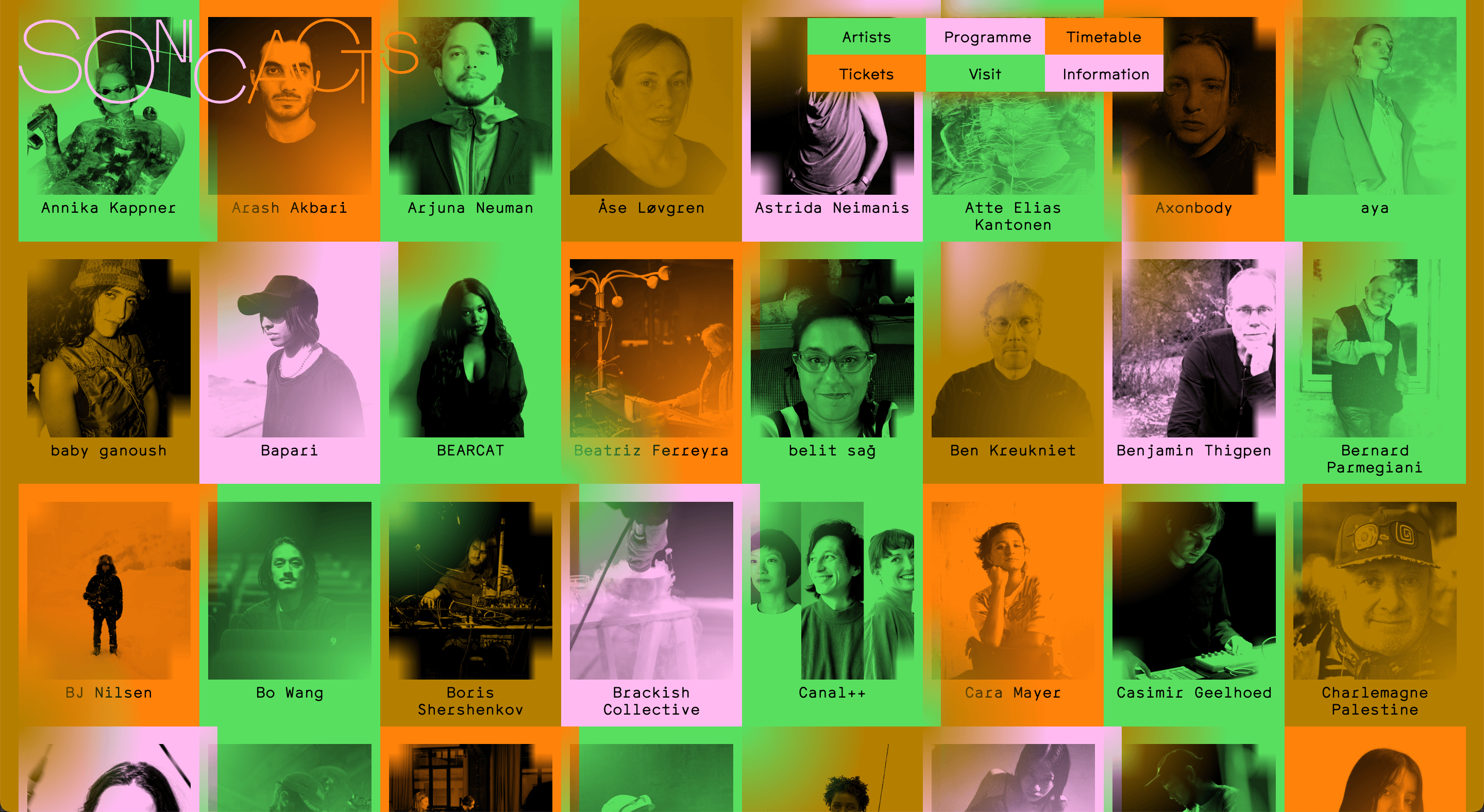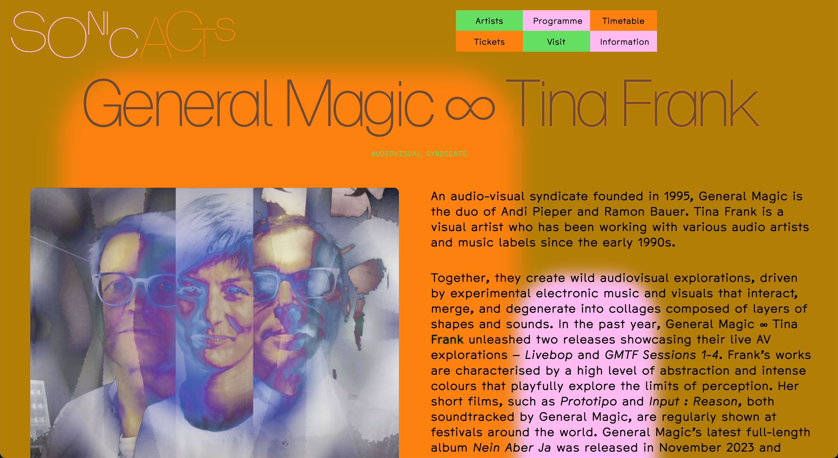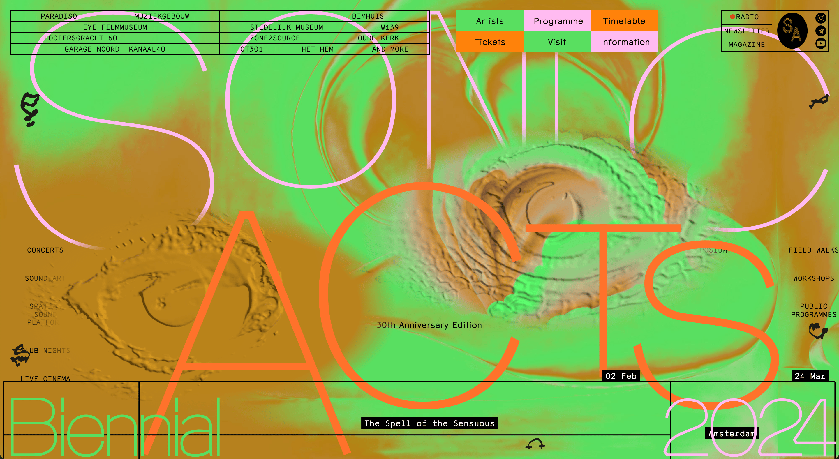 The visual identity for Sonic Acts 2024 edition “The Spell of the Sensuous” was designed by Anja Kaiser and Knoth & Renner, who also programmed the accompanying website. The design pays homage to Georgia O’Keeffe, an artist renowned for her mythic and uninhabited landscape masterpieces. Channeling her distinctive palette, the visuals employ earthly and lively hues hinting at images beyond human senses – a mystical entrancement in O’Keeffe’s landscapes or the liquid interconnectedness of (non)beings.