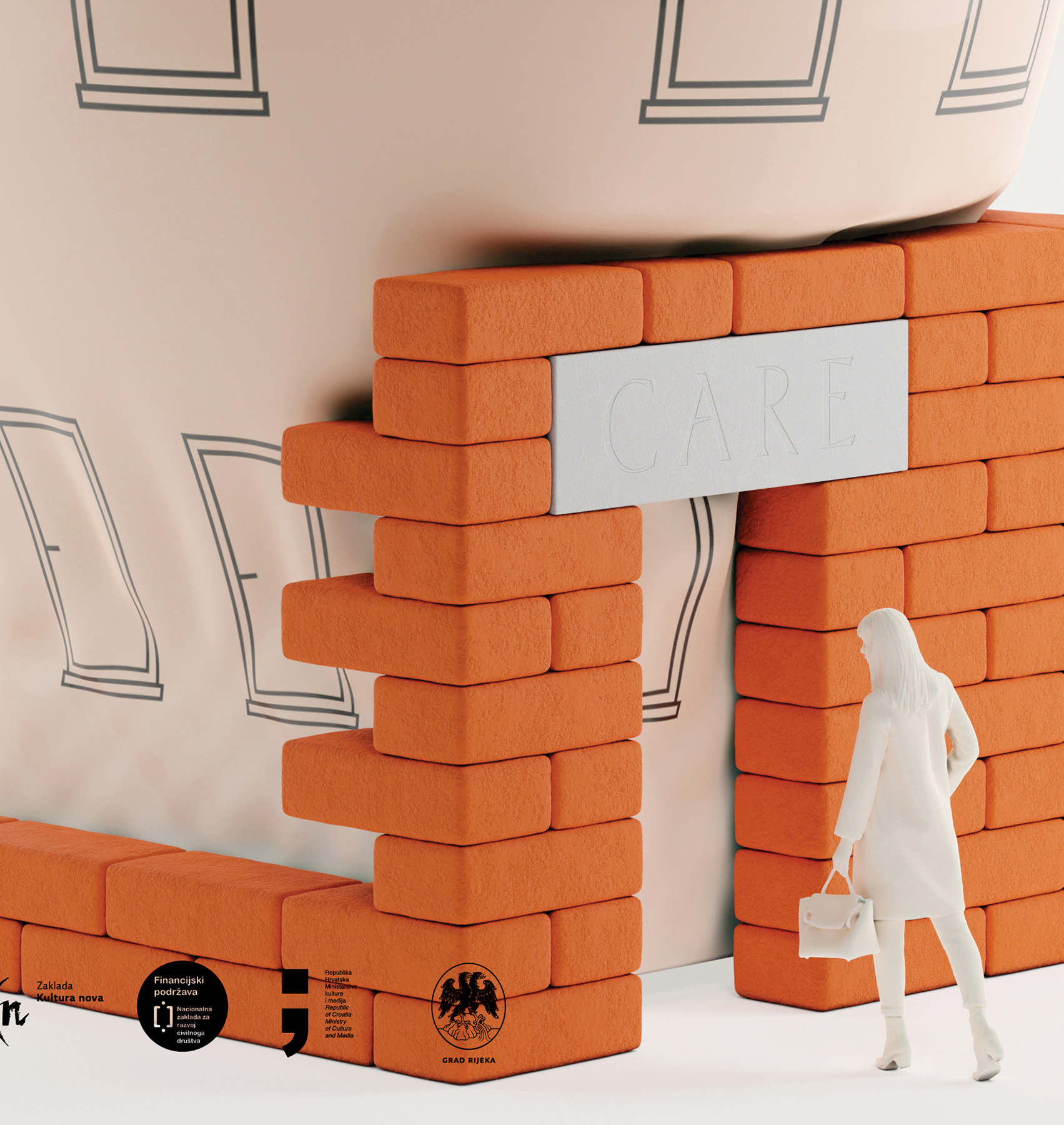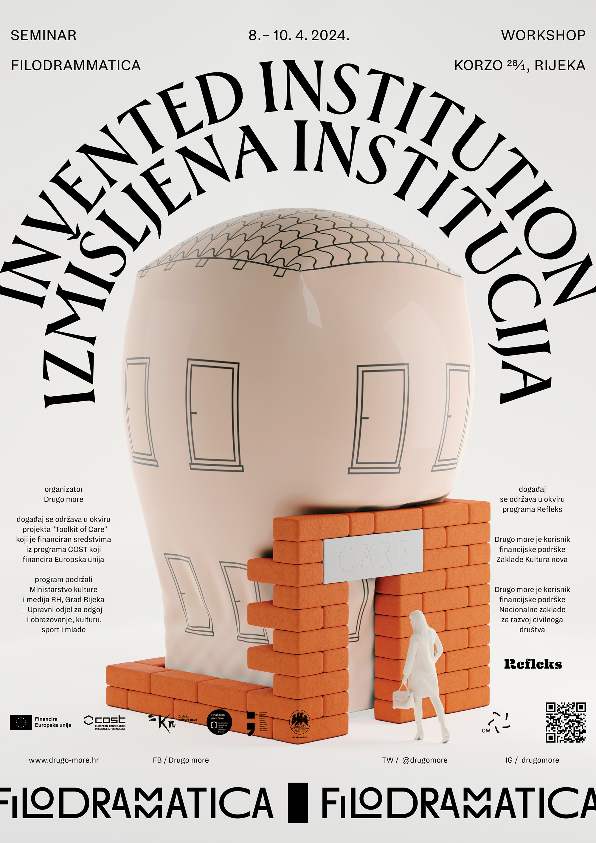 This poster is a part of series, designed by Oleg Šuran for Drugo more – a non profit organisation that produces, promotes, researches and disseminates culture. The posters are treated fairly loosely as series, each one using different colors, typefaces and images. For this specific event, seminar on the theme of “Invented institutions”, the designer chose to accompany his illustration of an inflatable institution with Rector, a display typeface reminiscent of stone carving and roman capitals. Contrasting the illustration, Rector was used to evoke an atmosphere of seriousness and tradition.