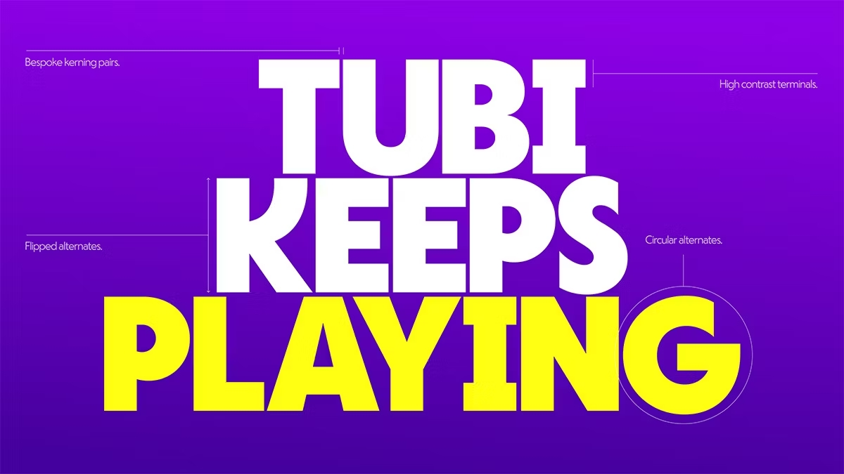 Although the Tubi wordmark is custom lettering, DixonBaxi collaborated with Central Type to create a brand typeface called Tubi Stans (yes, Stans not Sans). The design is a customized version of Central Type’s superfamily Deacon. The name of the custom typeface is a play-on-words based on the slang term “Stan”.