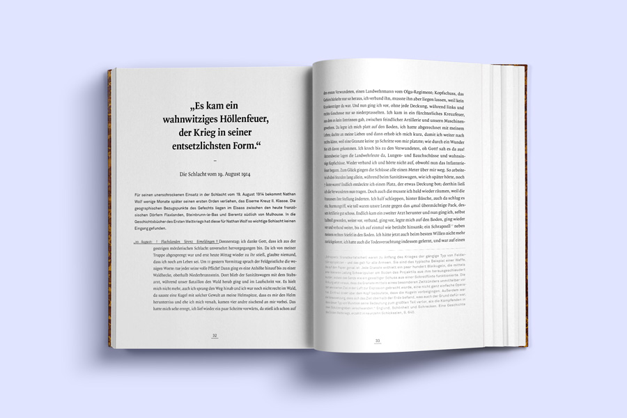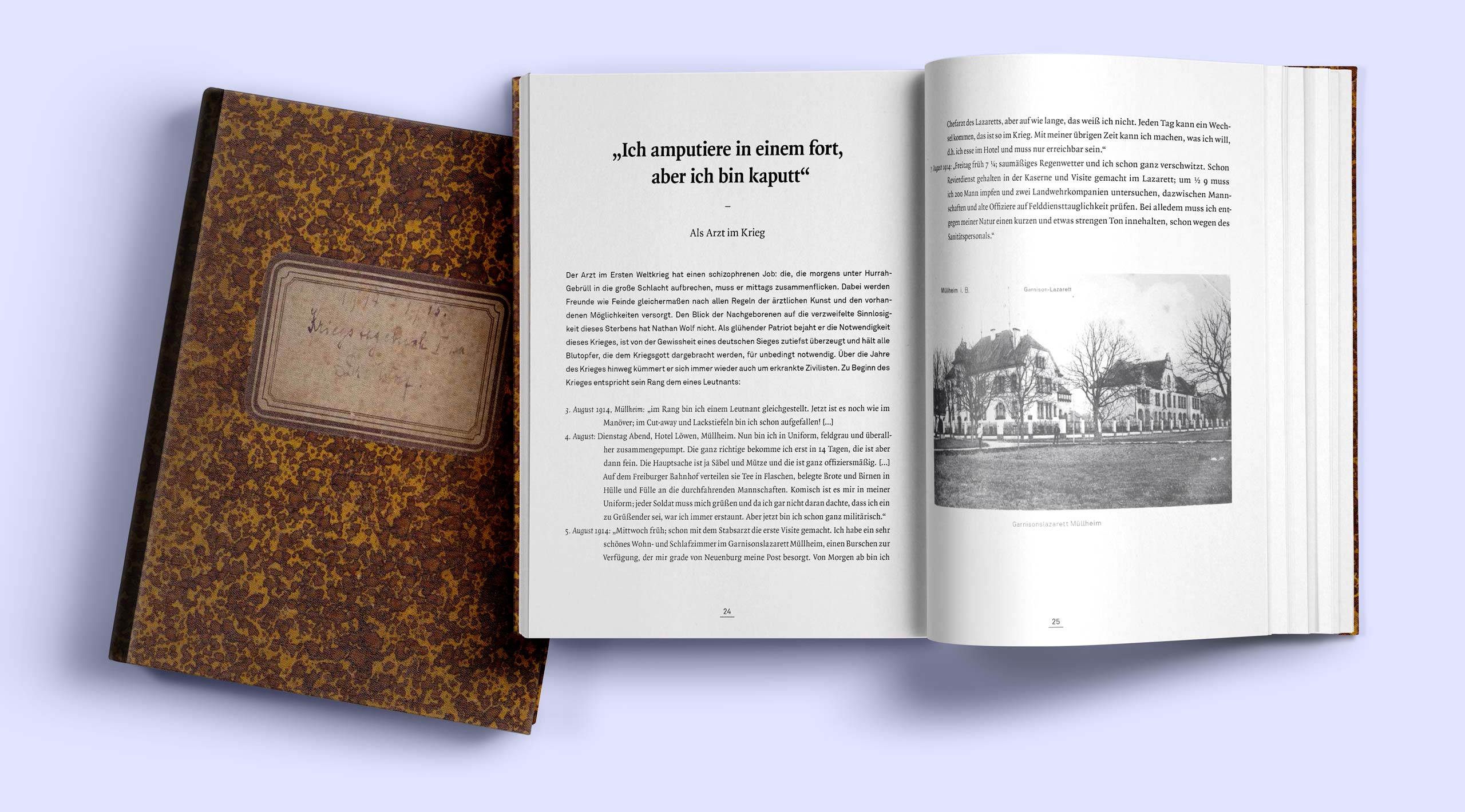 Edition of the war diaries of the Jewish doctor Nathan Wolf covering the years 1914 to 1917, selected and annotated by Anne Overlack with a foreword by Aleida Assmann. When typesetting the book, the special features of the original texts were taken into account. Indents and markings were adopted, and postcards and memorabilia were reproduced.