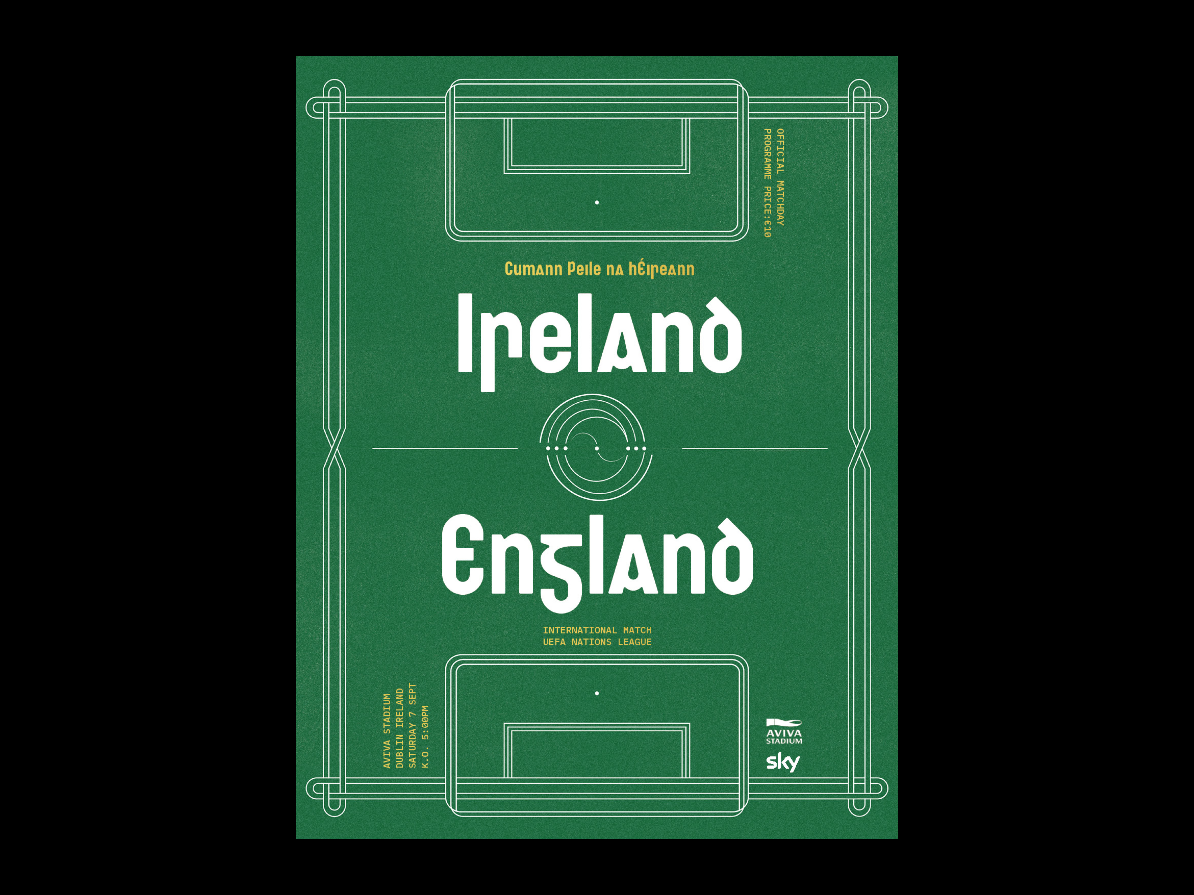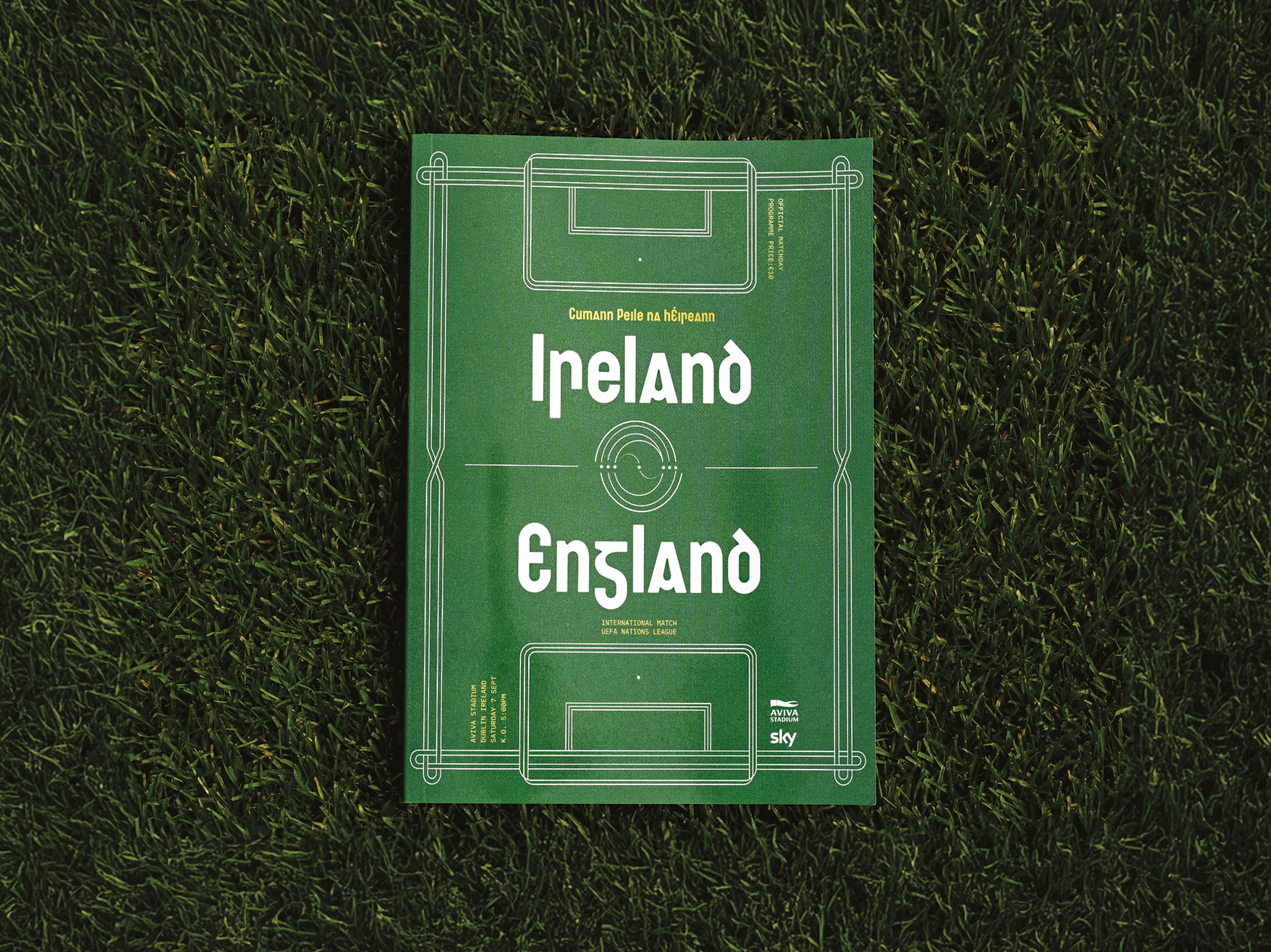 a Belfast-based type foundry. The typeface is inspired by Belfast’s distinctive tiled bilingual street signage, which displays both Irish and English translations of street names. Feirste reflects the Gaelic version of this iconic signage. IBM Plex Mono is used for the matchday details.