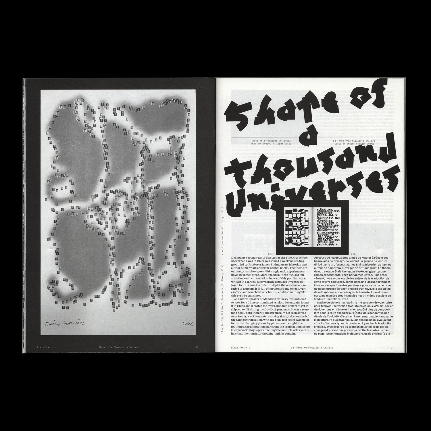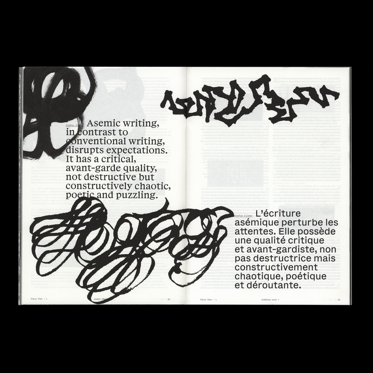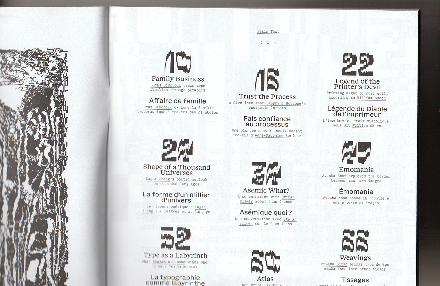 From fiction to theory, from mystical analyses to visual works, Plain Text aims at exploring typographic imaginaries, moving beyond a strictly historical and technical framework, with a taste for the unknown and the dormant potential of writing. The first issue of Plain Text features voices from various backgrounds and generations, many offering a personal, even intimate or spiritual, approach to letters.