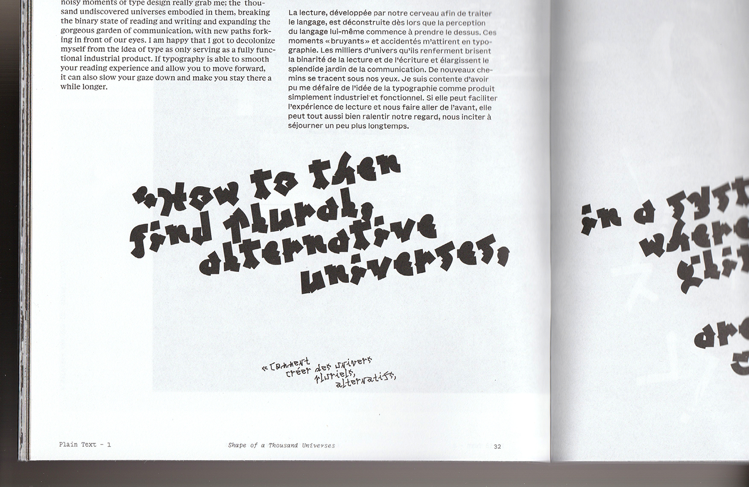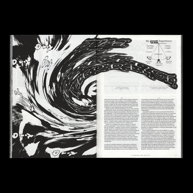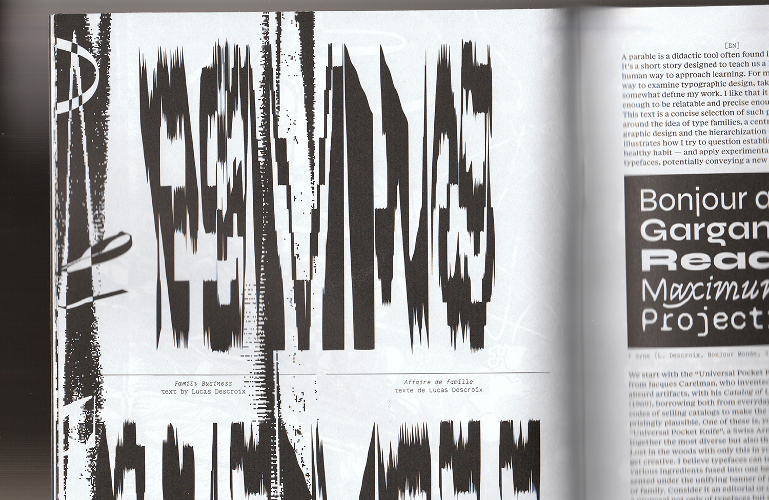 A number of display typefaces designed by Lucas Descroix and/or Benjamin Dumond are used throughout, for the title of each contribution as well as various emphasis moments. These include: Jester (in several styles), Michaux, Nostra Sett and Stream, Ready Active, Bygone and Clouded. Some unreleased display typefaces, either old or future, are also used but not shown here in the pictures.