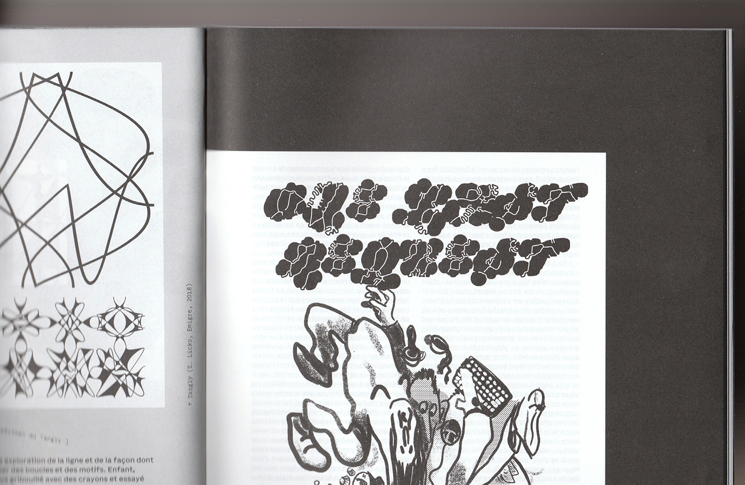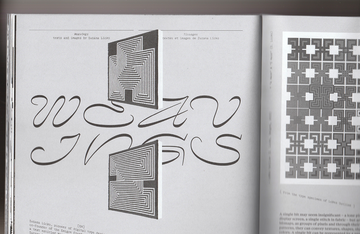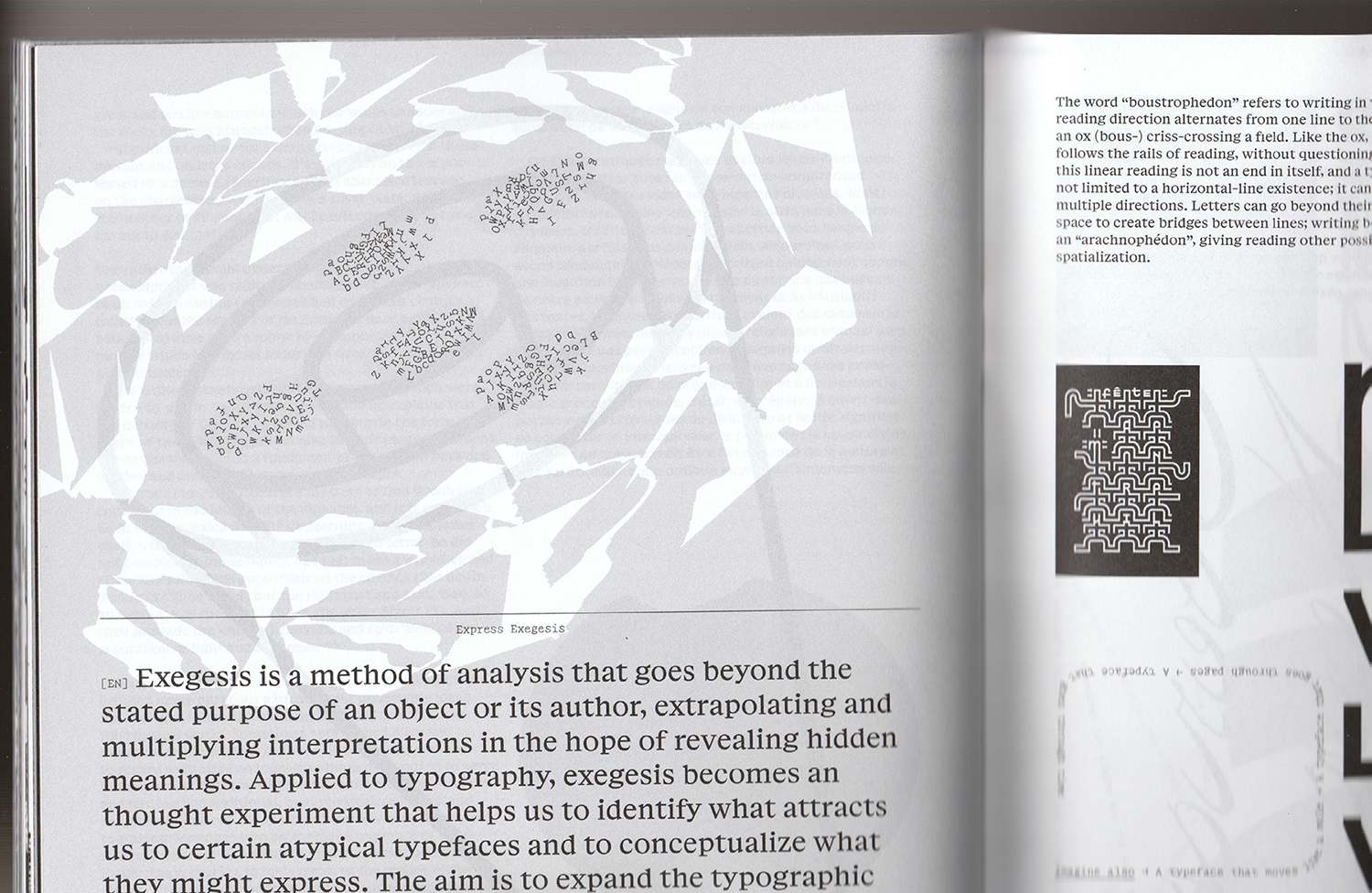 A number of display typefaces designed by Lucas Descroix and/or Benjamin Dumond are used throughout, for the title of each contribution as well as various emphasis moments. These include: Jester (in several styles), Michaux, Nostra Sett and Stream, Ready Active, Bygone and Clouded. Some unreleased display typefaces, either old or future, are also used but not shown here in the pictures.