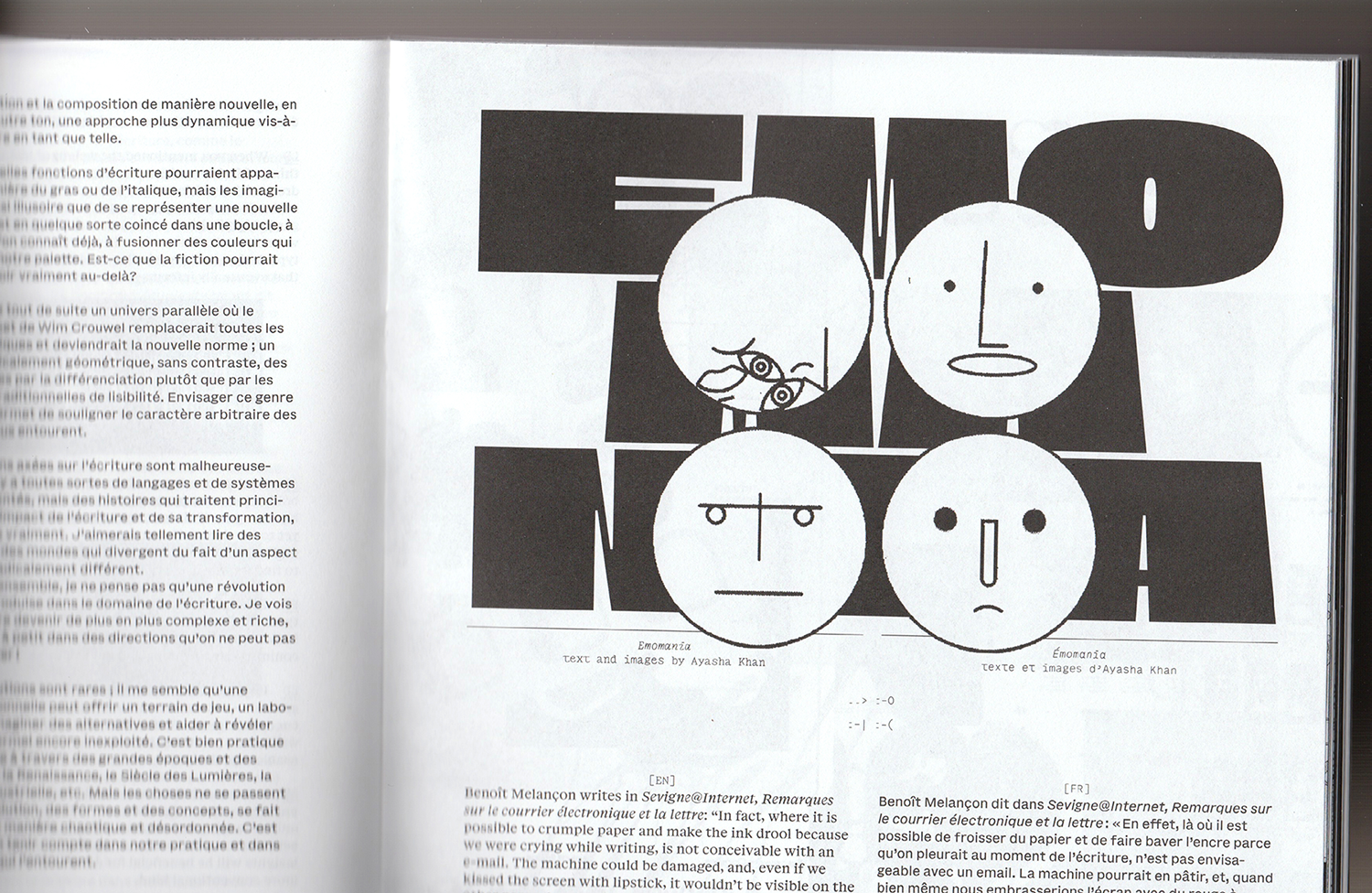 The texts of this black-and-white, bilingual publication are all set in the unreleased duo Basically Serif for the English and Basically Sans for the French. Additional information is set in Baskemo, also Serif and Sans, an automatically monospaced-and-skelefont’ed companion to Basically.