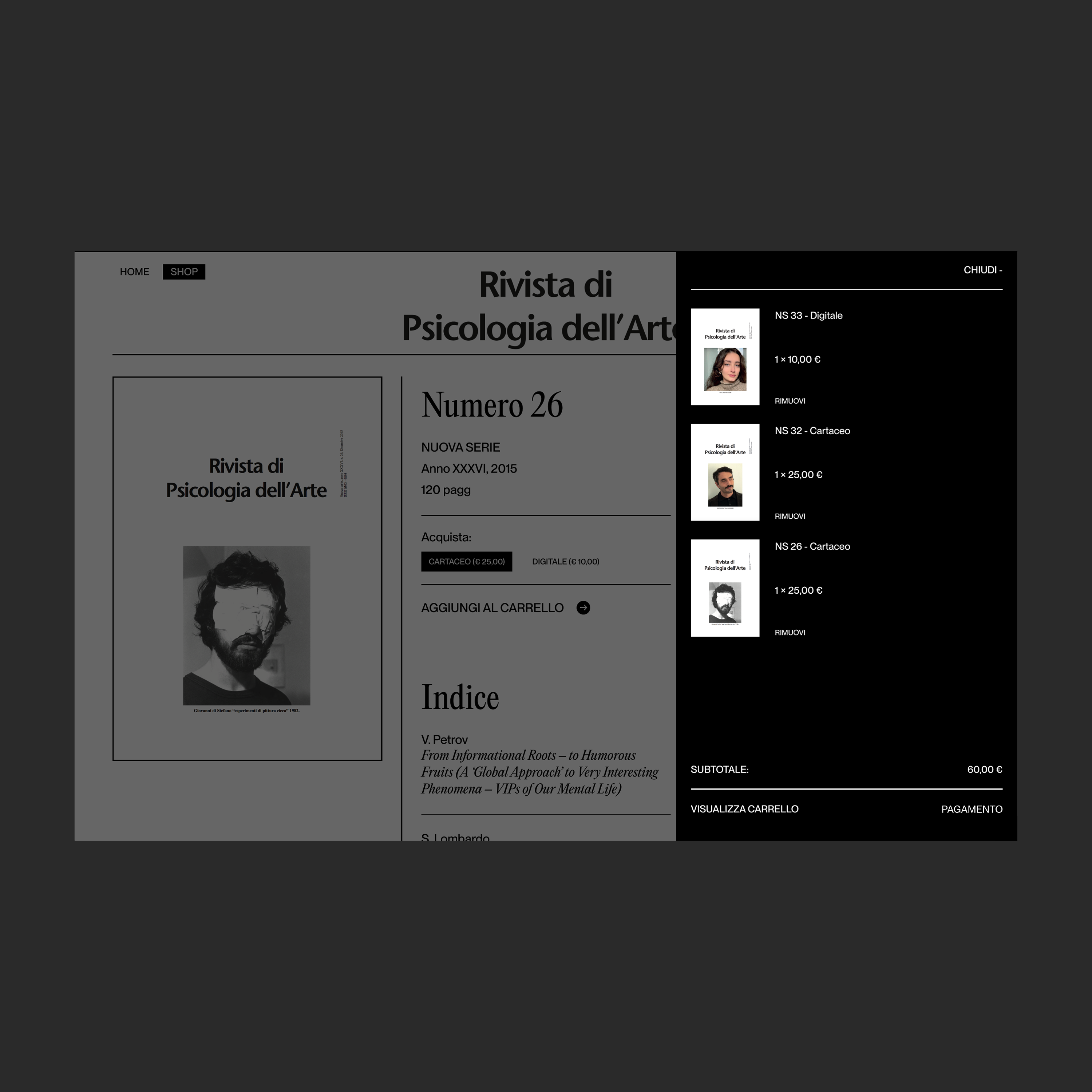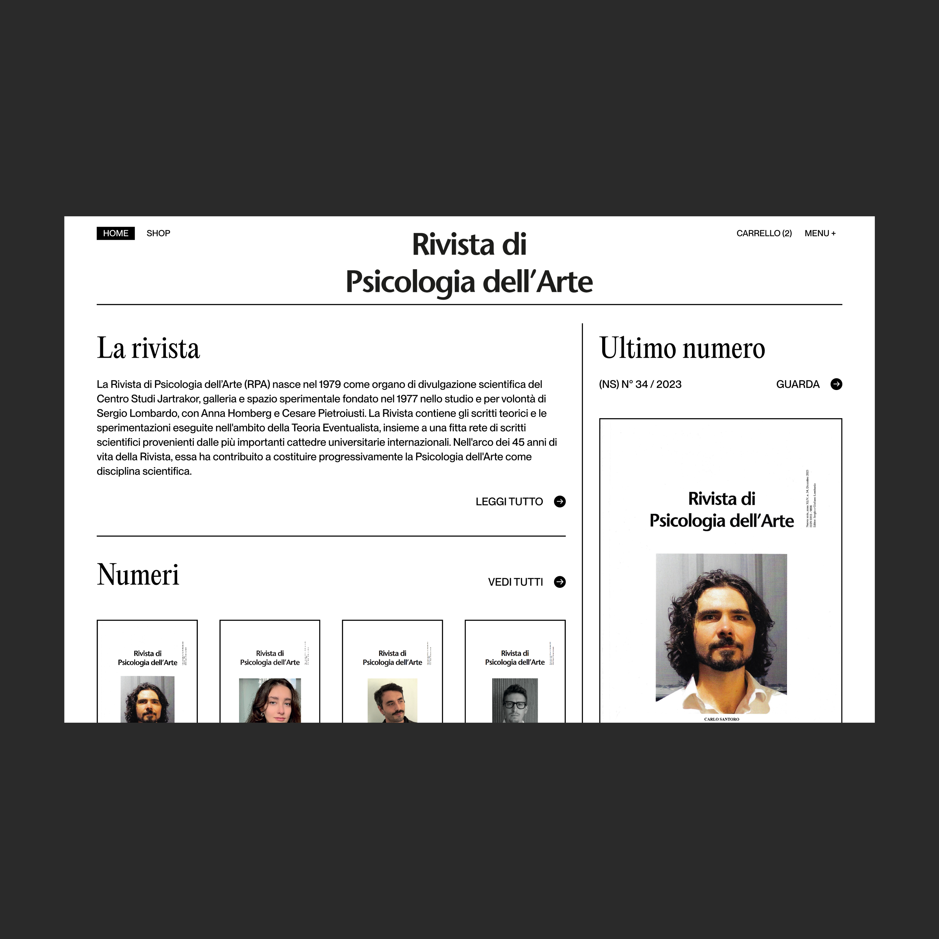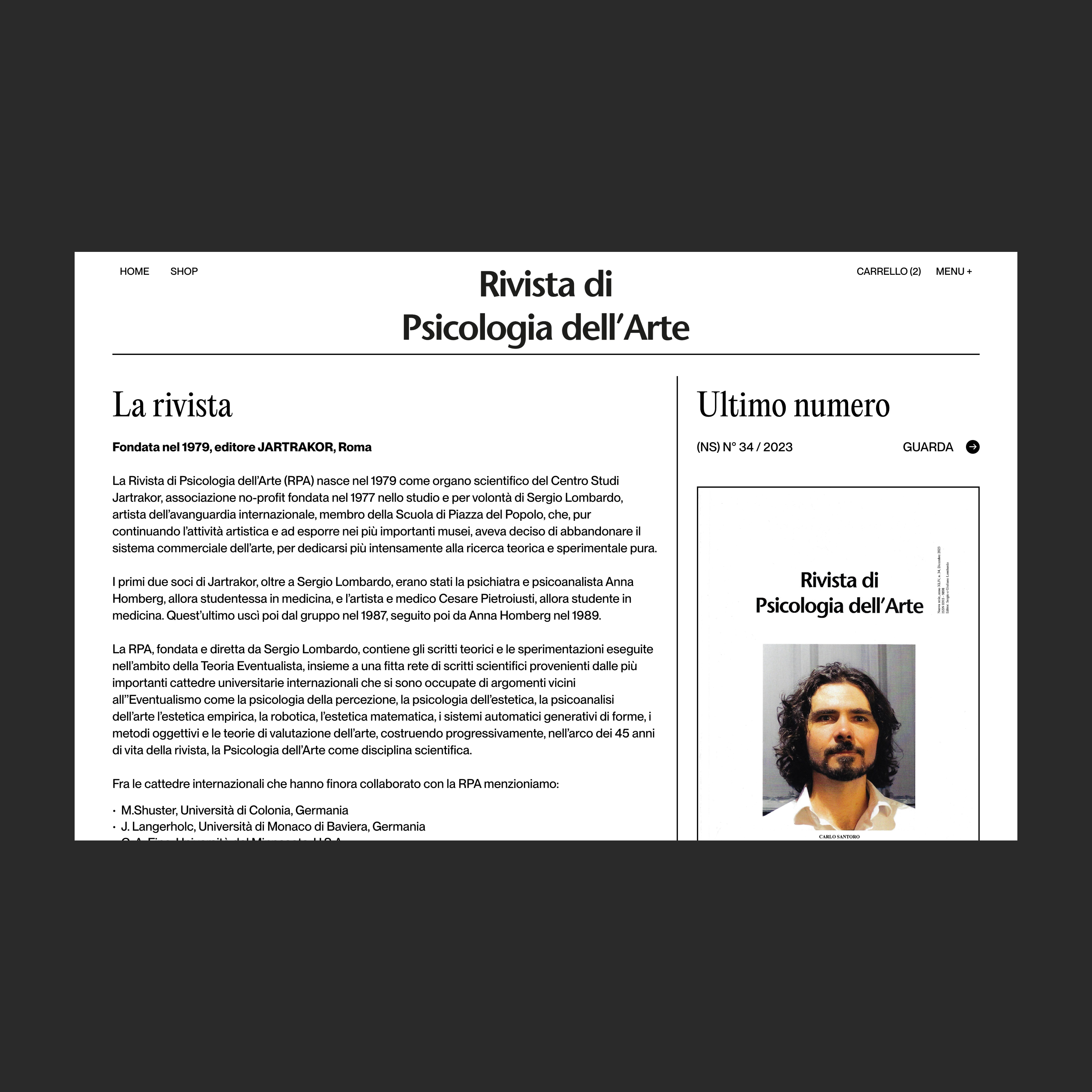 Rivista di Psicologia dell’Arte (“Journal of Psychology of Art”) launched a brand new website with an integrated shop. The journal was founded in 1979 as the scientific body of the Jartrakor Study Center – established two years earlier by international avant-garde artist Sergio Lombardo, who, while continuing his artistic activity, had decided to abandon the commercial art system to dedicate himself more intensely to theoretical and experimental research. Over the 45 years of its life, the journal has progressively built the Psychology of Art as a a scientific discipline through theoretical and experimental writings carried out within the framework of the Eventualist Theory, crossing various areas of study such as the psychology of perception, the psychoanalysis of art, empirical aesthetics, robotics, mathematical aesthetics, automatic form-generating systems, objective methods and theories of art evaluation.