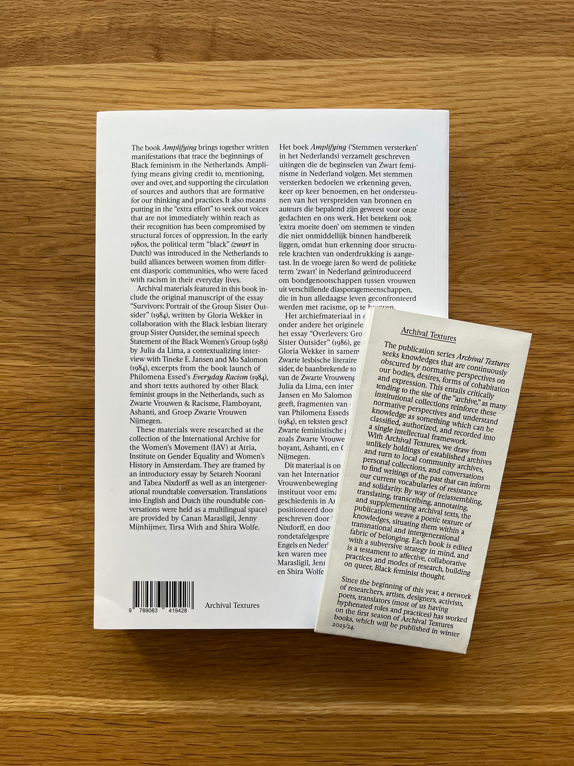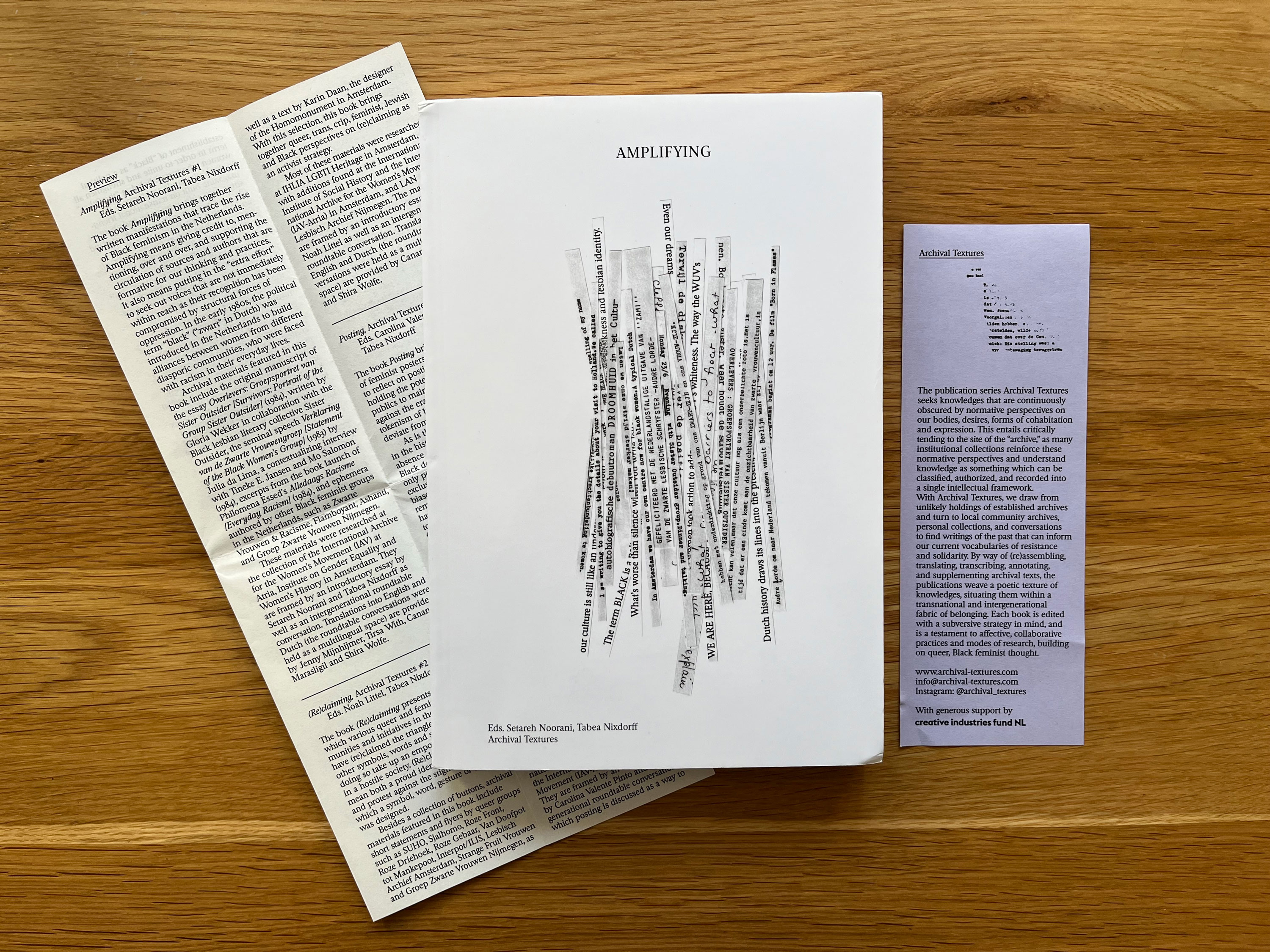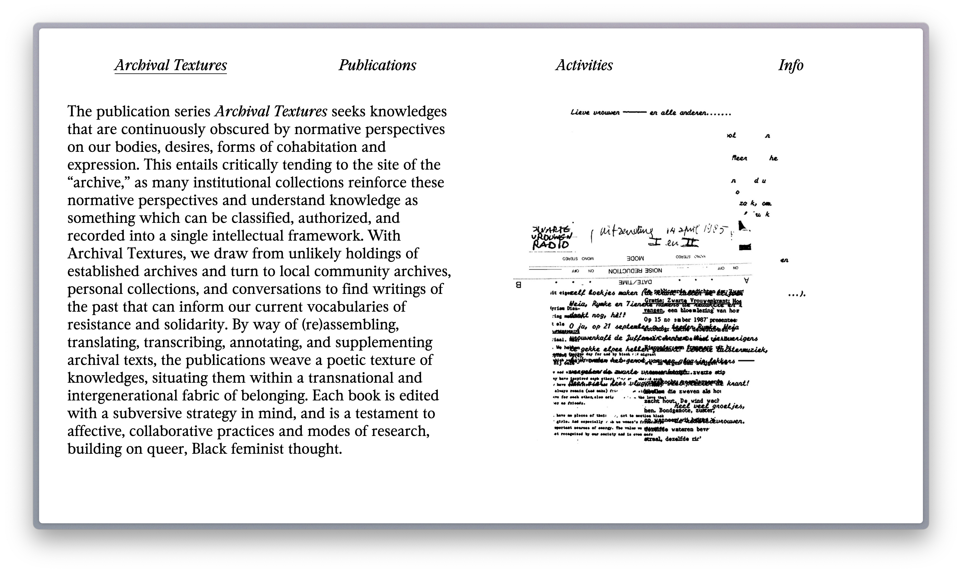 The publication series Archival Textures seeks knowledges that are continuously obscured by normative perspectives on our bodies, desires, forms of cohabitation and expression. This entails critically tending to the site of the “archive,” as many institutional collections reinforce these normative perspectives and understand knowledge as something which can be classified, authorized, and recorded into a single intellectual framework. With Archival Textures, we draw from unlikely holdings of established archives and turn to local community archives, personal collections, and conversations to find writings of the past that can inform our current vocabularies of resistance and solidarity. By way of (re)assembling, translating, transcribing, annotating, and supplementing archival texts, the publications weave a poetic texture of knowledges, situating them within a transnational and intergenerational fabric of belonging. Each book is edited with a subversive strategy in mind, and is a testament to affective, collaborative practices and modes of research, building on queer, Black feminist thought.