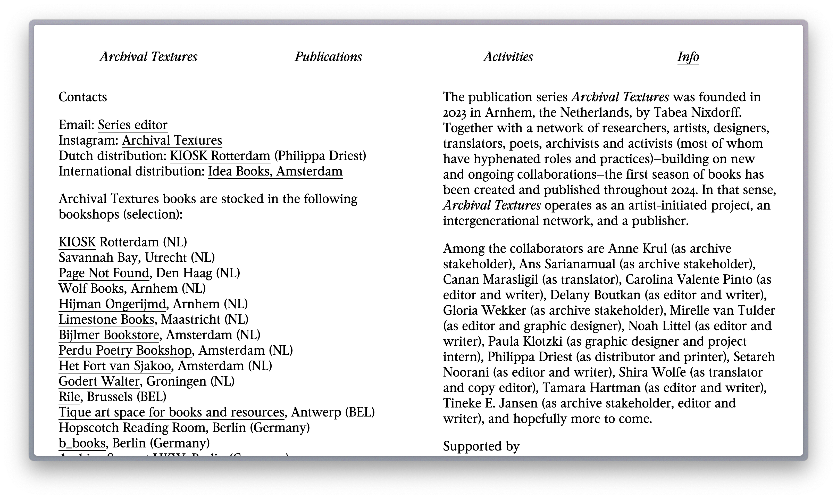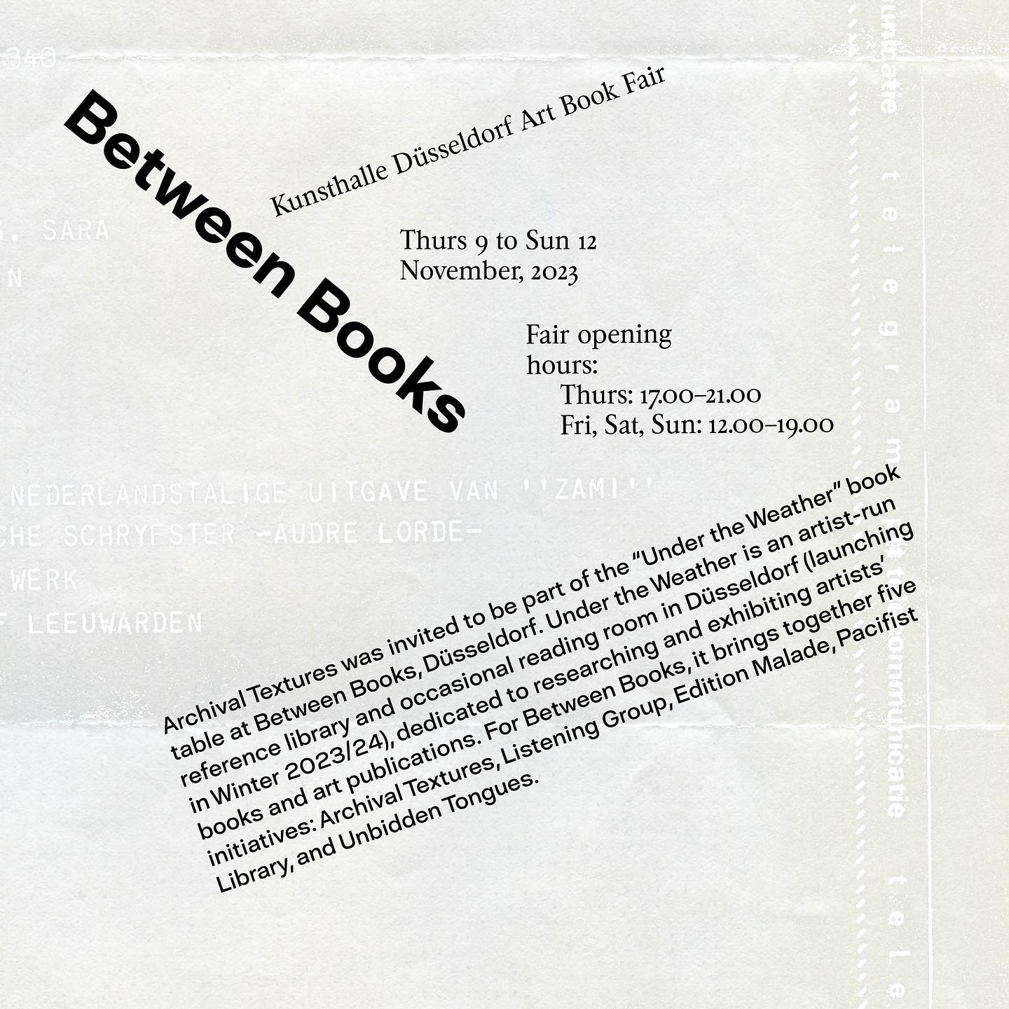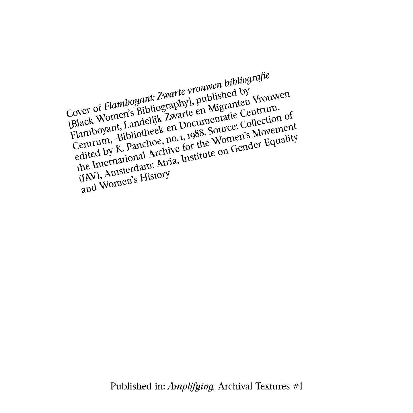 The publication series Archival Textures seeks knowledges that are continuously obscured by normative perspectives on our bodies, desires, forms of cohabitation and expression. This entails critically tending to the site of the “archive,” as many institutional collections reinforce these normative perspectives and understand knowledge as something which can be classified, authorized, and recorded into a single intellectual framework. With Archival Textures, we draw from unlikely holdings of established archives and turn to local community archives, personal collections, and conversations to find writings of the past that can inform our current vocabularies of resistance and solidarity. By way of (re)assembling, translating, transcribing, annotating, and supplementing archival texts, the publications weave a poetic texture of knowledges, situating them within a transnational and intergenerational fabric of belonging. Each book is edited with a subversive strategy in mind, and is a testament to affective, collaborative practices and modes of research, building on queer, Black feminist thought.