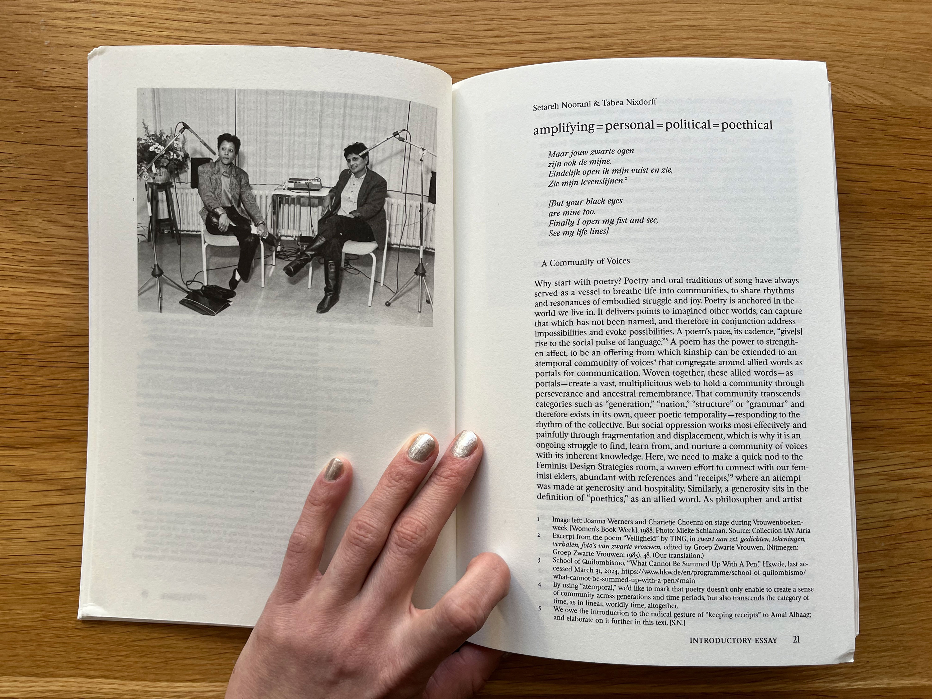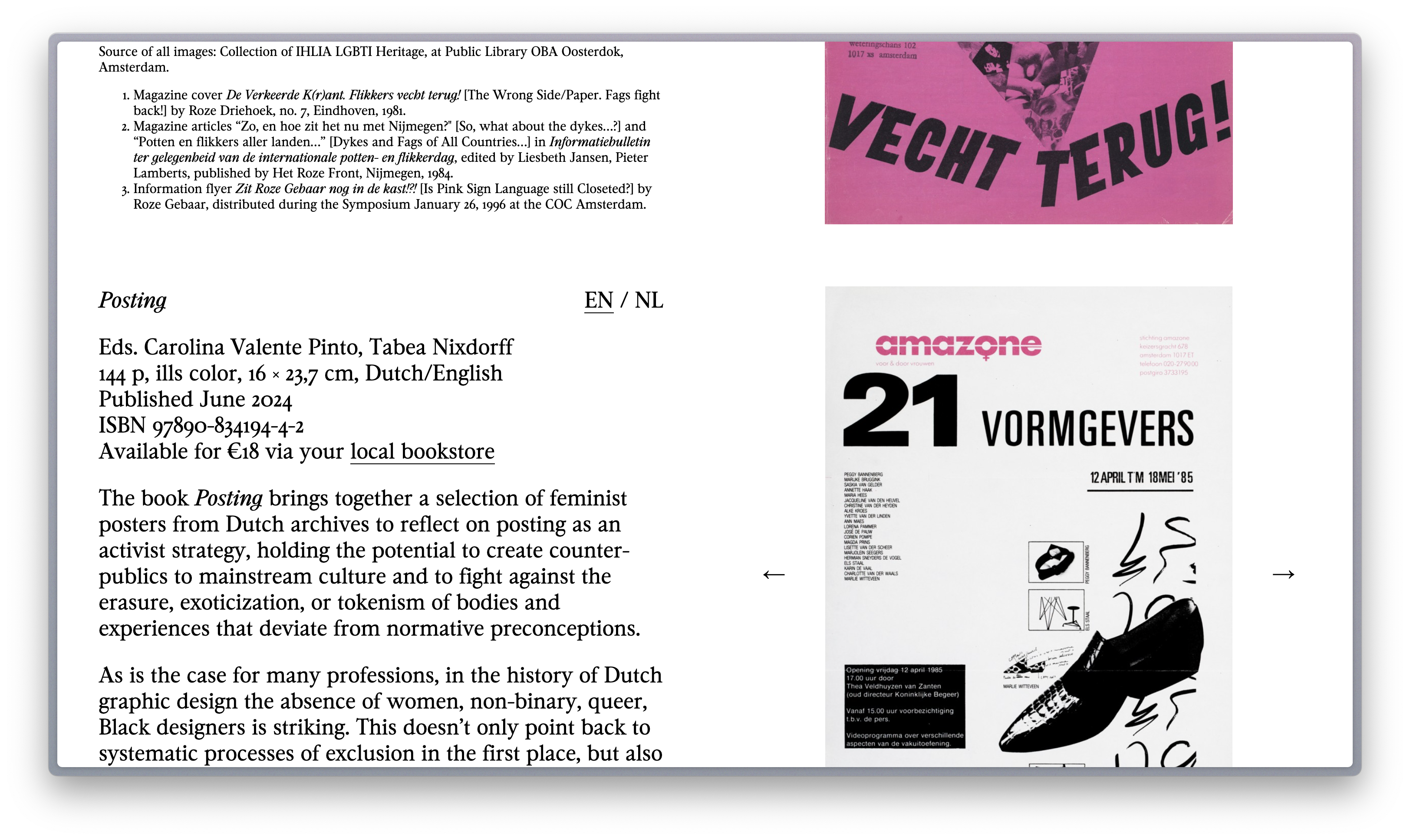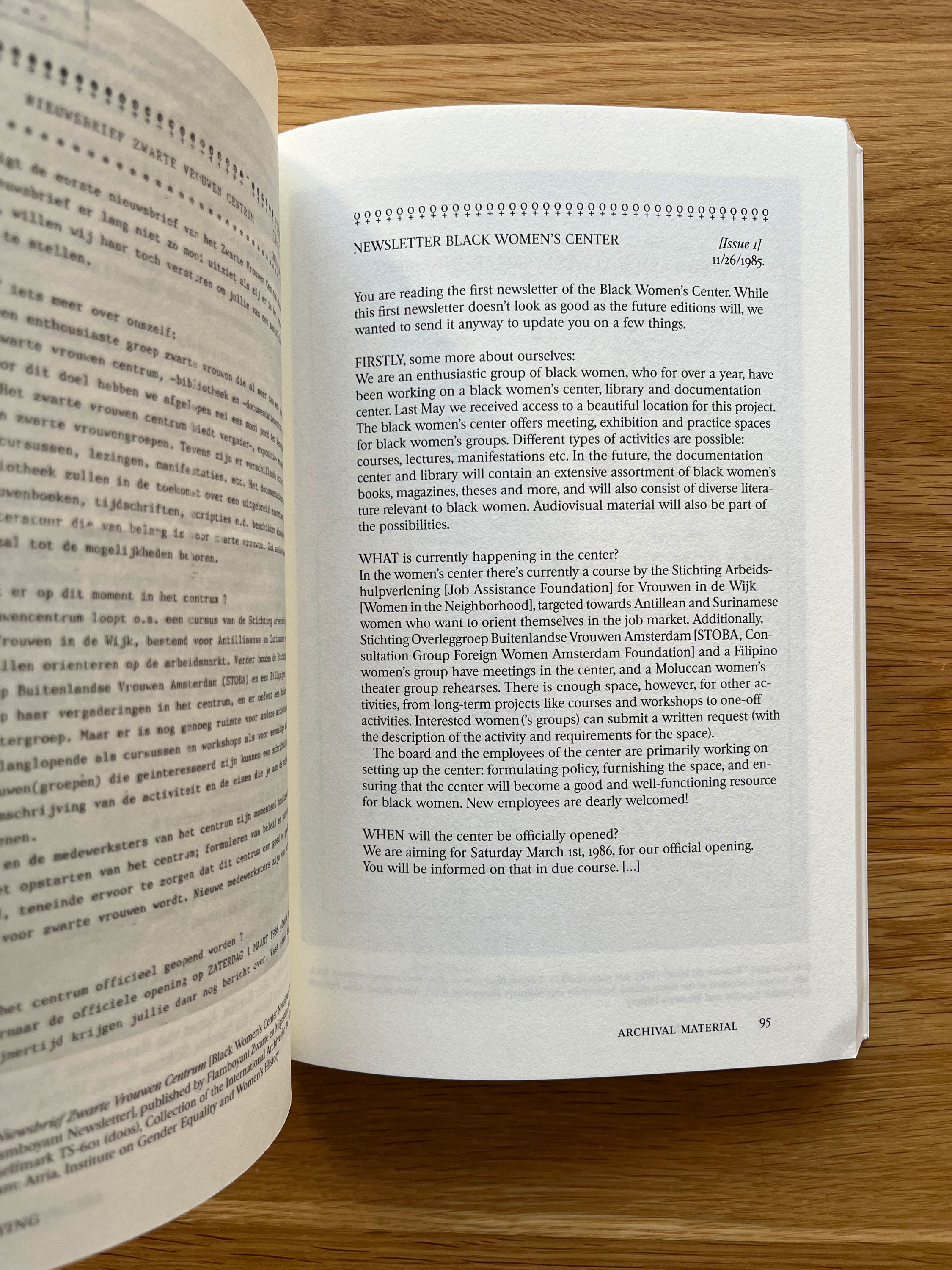 With Archival Textures, they aim to make archival research on feminist design strategies – as developed and employed by previous generations in the Netherlands and through transnational solidarity – available in print and in English translation. Several small printed publications are focusing on a strategy such as ‘amplifying’, ‘(re)claiming’, ‘building’ or ‘mapping’, through the lens of archival textual and visual material from the so-called Second Wave Feminist Movement, with a focus on queer, anti-racist, intersectional initiatives. Reproductions of the archival materials are accompanied by English translations, editorial notes and transcriptions of intergenerational conversations.