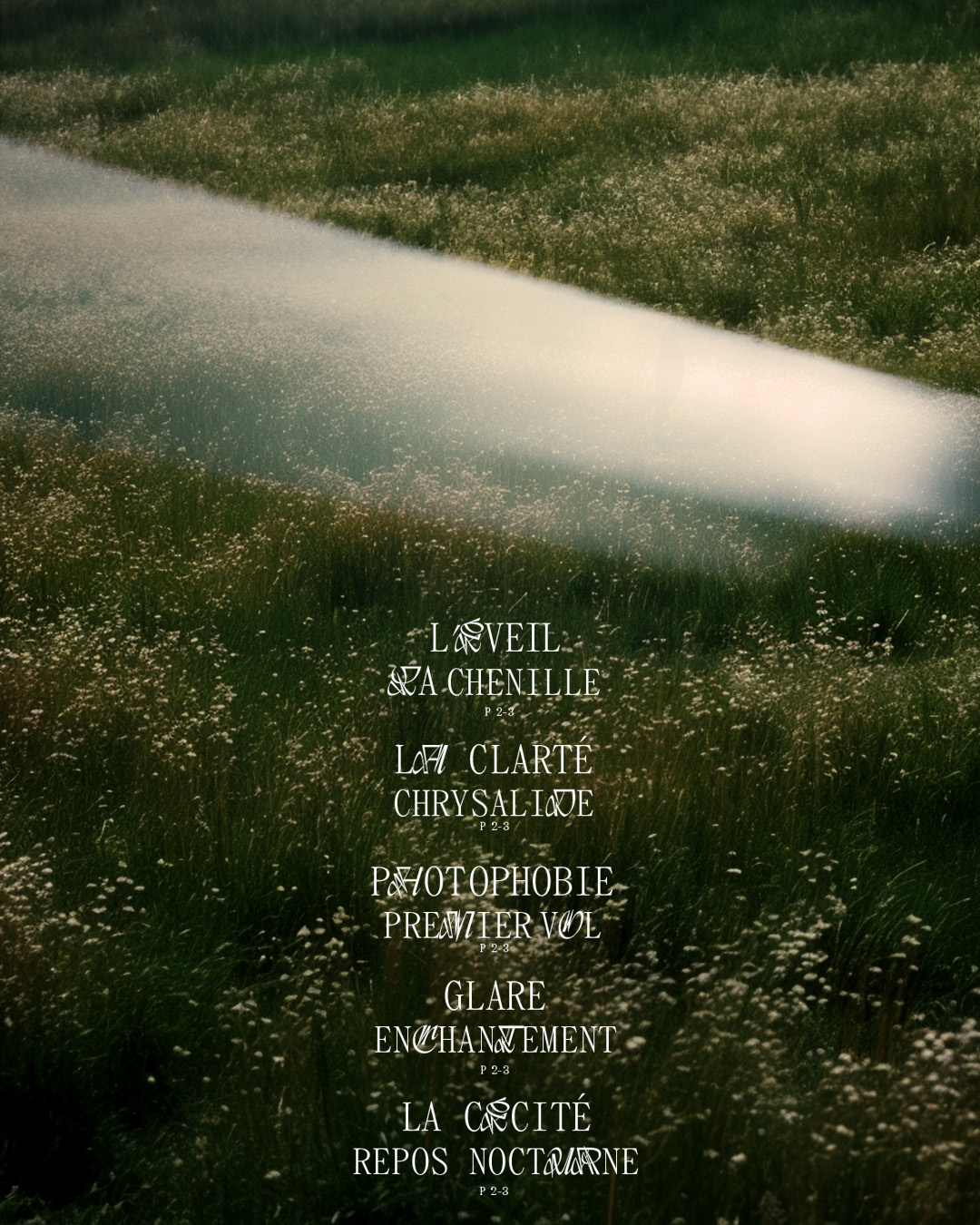 The text was written by Houessou and is set using Panama Monospace Regular, with Panama and the White Wild style of Boogy Brut Poster for headings. Images were created experimentally with AI using Midjourney, then refined in Adobe Photoshop.
