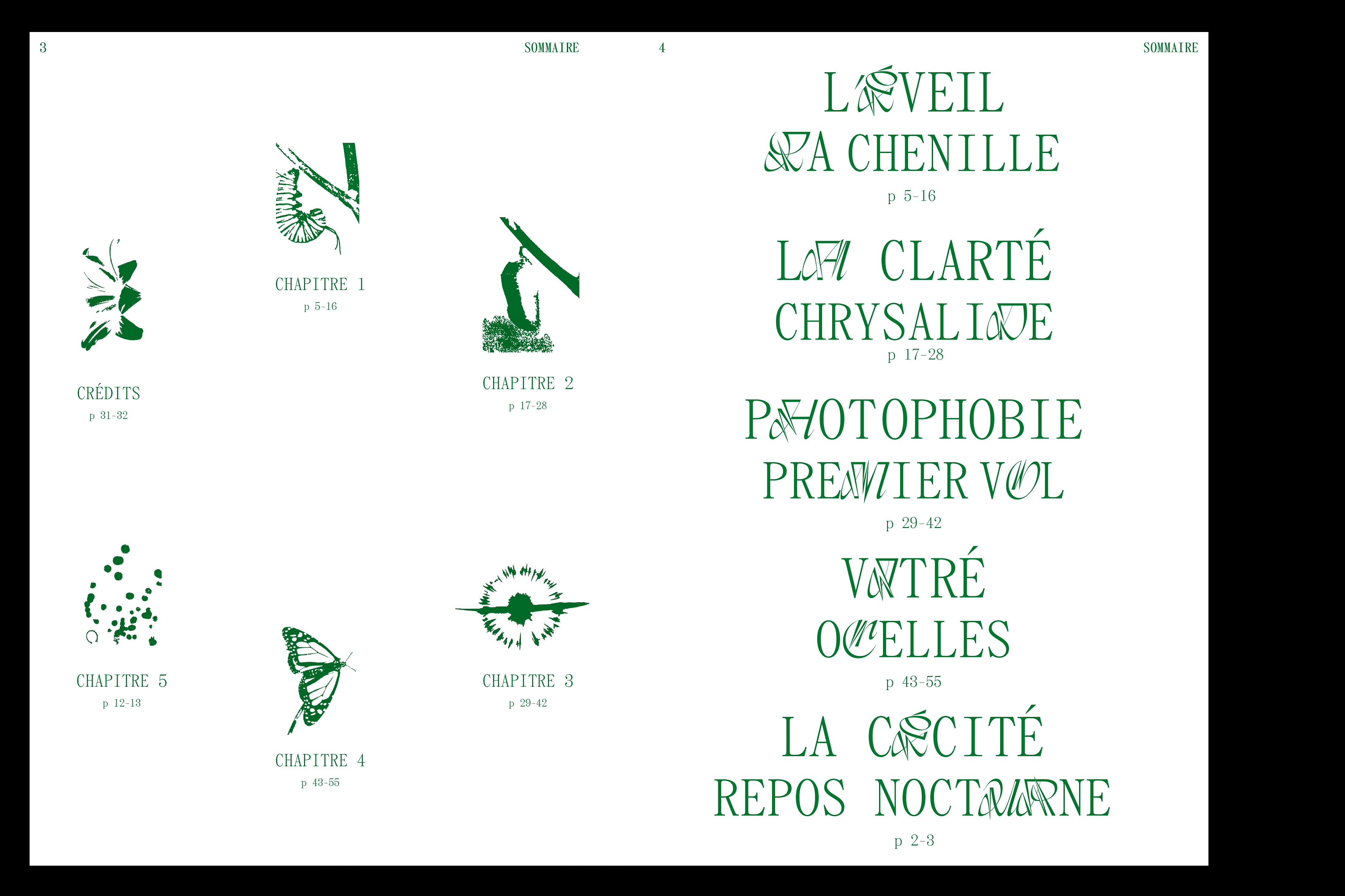 The main part measures A3+, with A5 green inserts dedicated to the scientific section. Printed on textured off-white + Colorplan Forest papers and bound using Japanese binding.