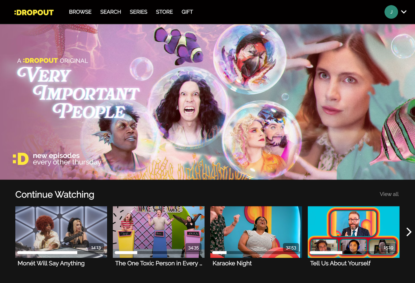 Dropout TV—owned by Dropout, previously known as CollegeHumor—is an independent comedy-focused streaming service that hosts their wide variety of television shows and previous internet content.