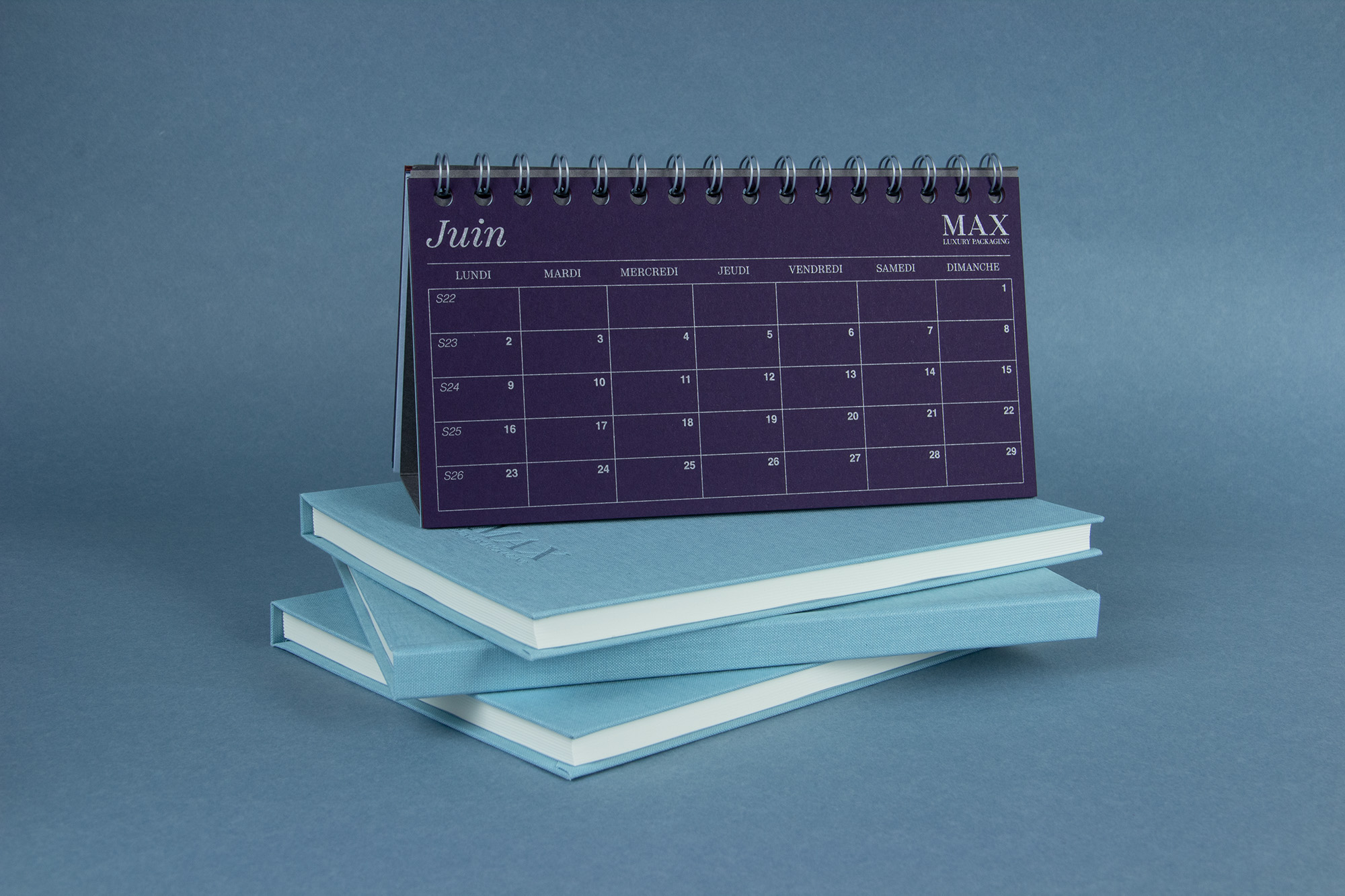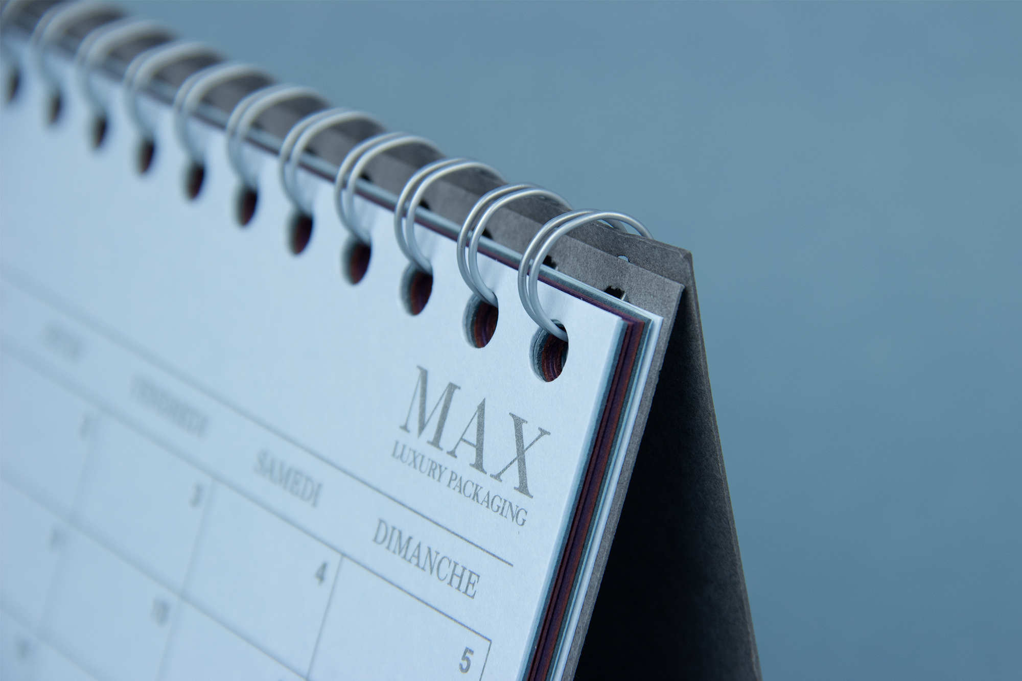 The Max Luxury Packaging logo is set in all-caps New Caslon, while Helvetica Bold is used for the day’s digits.