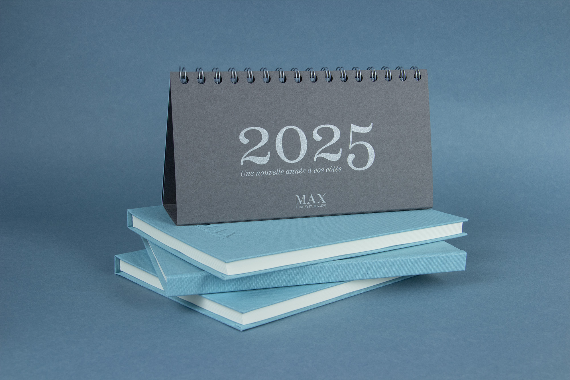 To celebrate 2025, Max Luxury Packaging sent a colorful calendar to its customers. Each month comes with a different Gmund Colors Matt shade, associated with a silver metallic offset ink. The typeface used for the cover, the months and the days is Scotch Text, created by Neil Summerour and released by Positype in 2017.