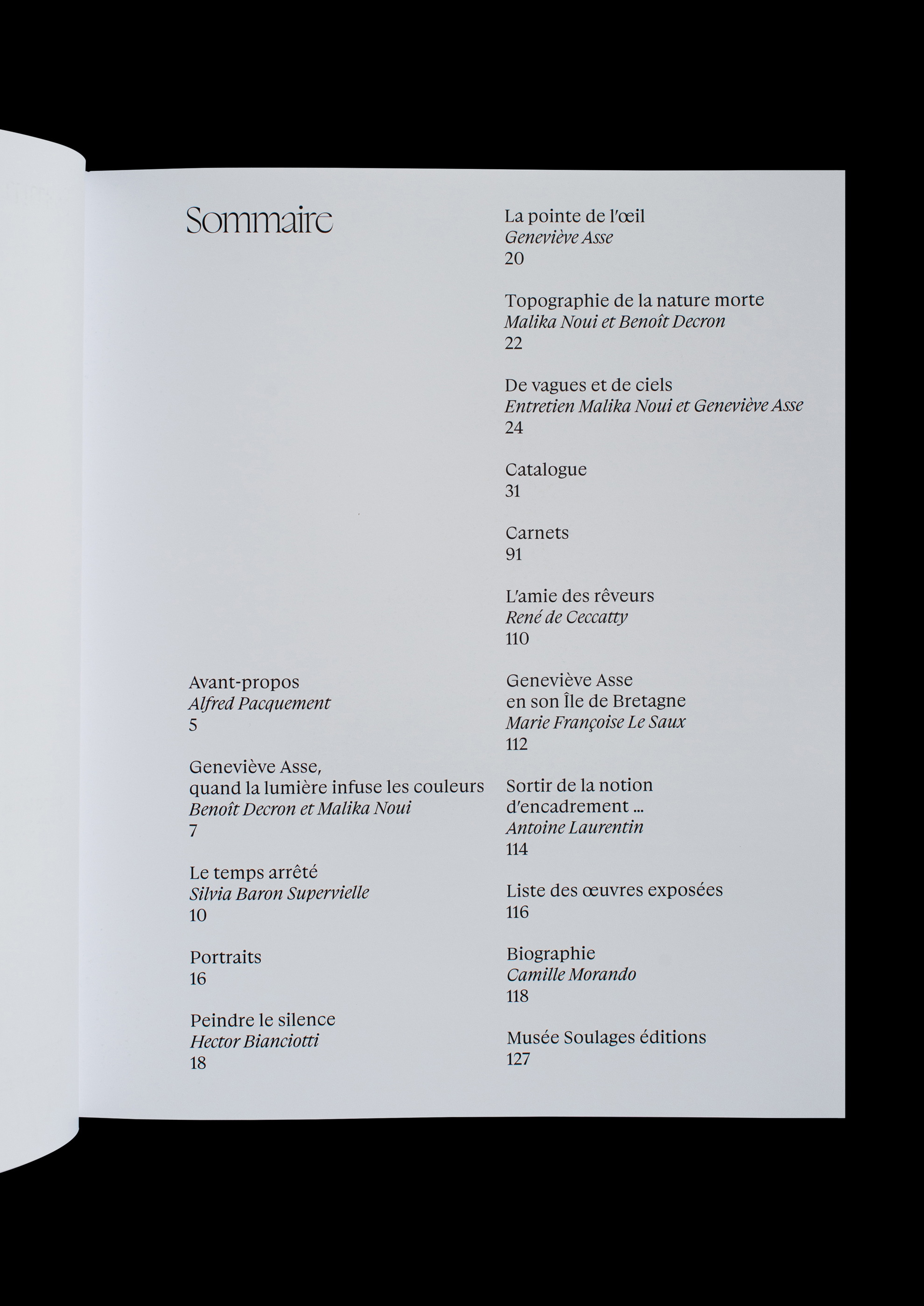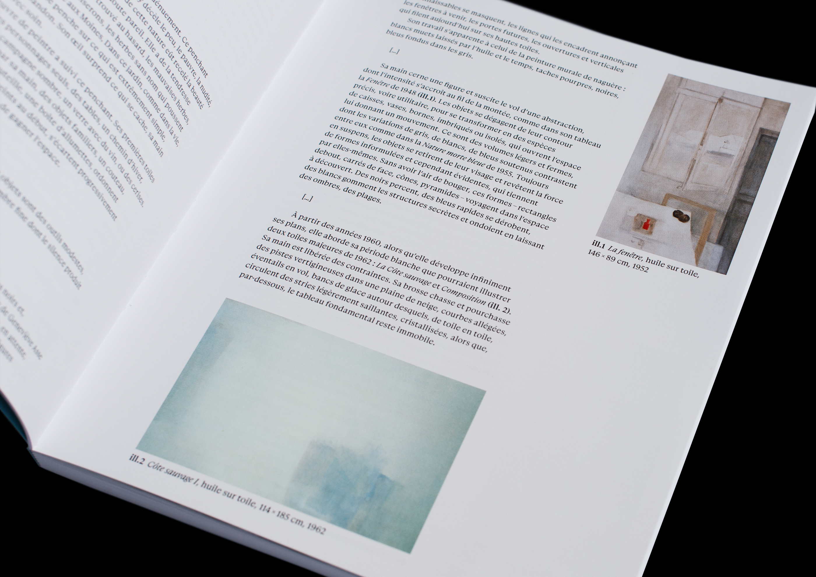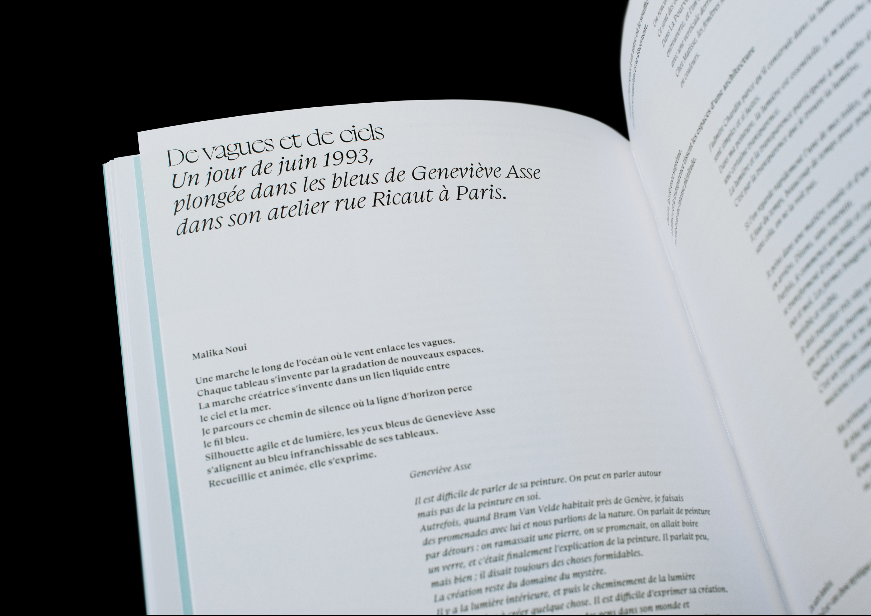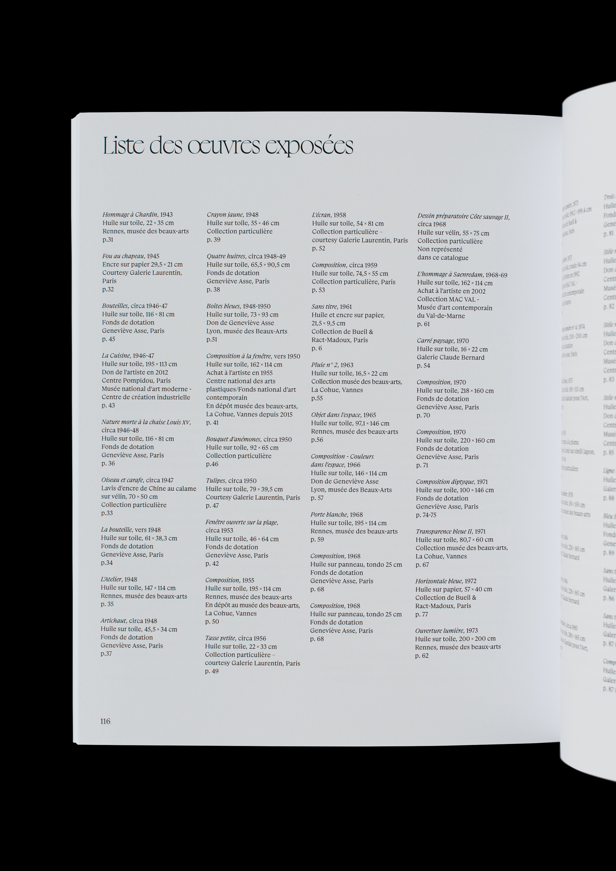 The catalog was laid out by Cécile Joly, a graphic designer based in Montreuil. The texts were written by Alfred Pacquement, Benoît Decron, Malika Noui, Silvia Baron Supervielle, Hector Bianciotti, René de Ceccatty, Marie-Françoise Le Saux, Antoine Laurentin, and Camille Morando. The catalog is composed in Boogy Brut, designed by Bureau Brut and Julien Priez. It was printed on Arctic Volume White matte 170 g/m² (interior), Freelife Vellum Premium White 120 g/m² (interior insert), Sirio Color Celeste 290 g/m² (cover). The photoengraving was done by Comme Pour Moi in Montreuil (Philippe Guilvard), and the printing by Mérico, France. The supporting sans is Saans by Displaay Type Foundry.