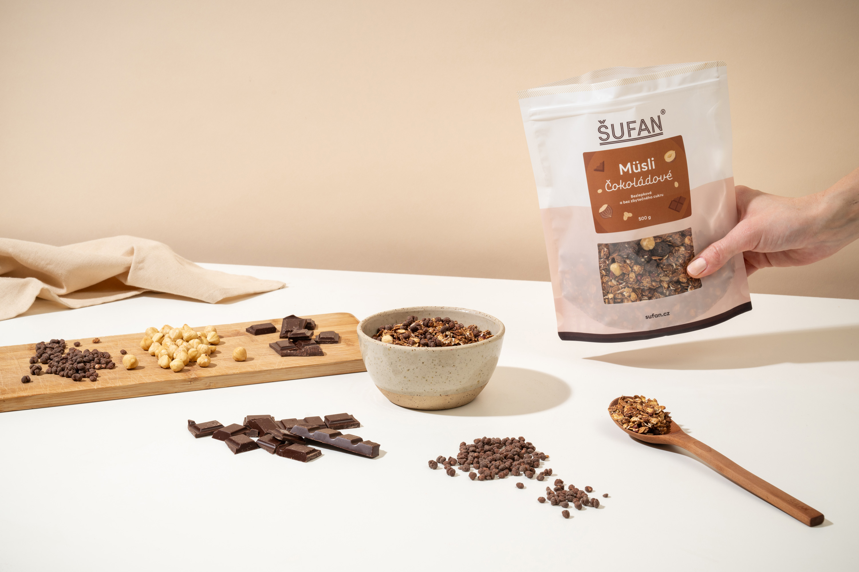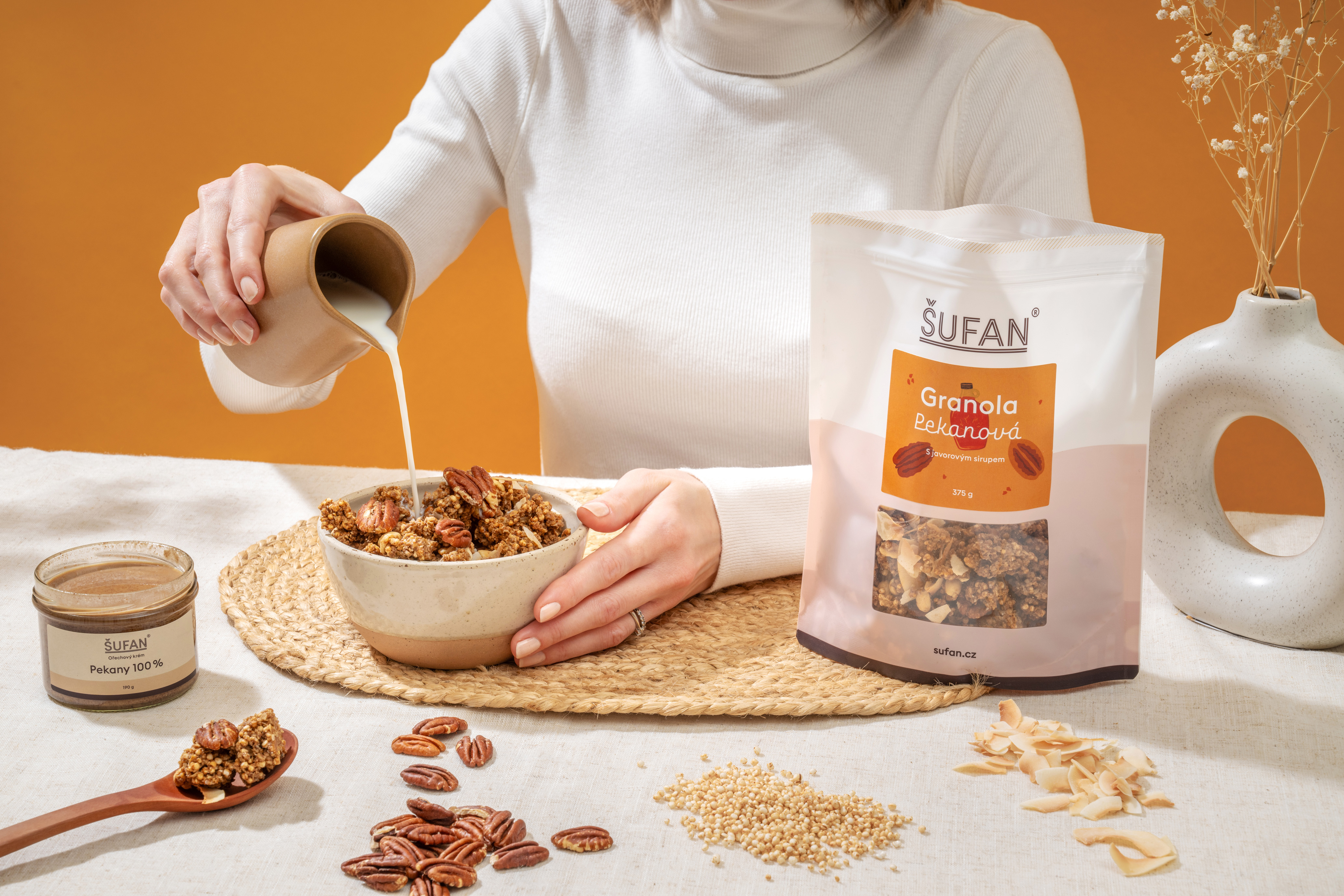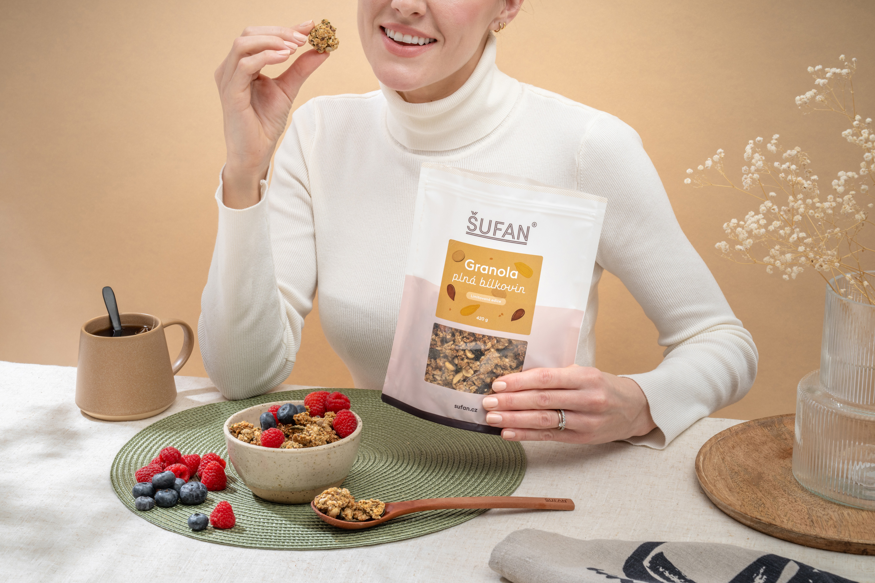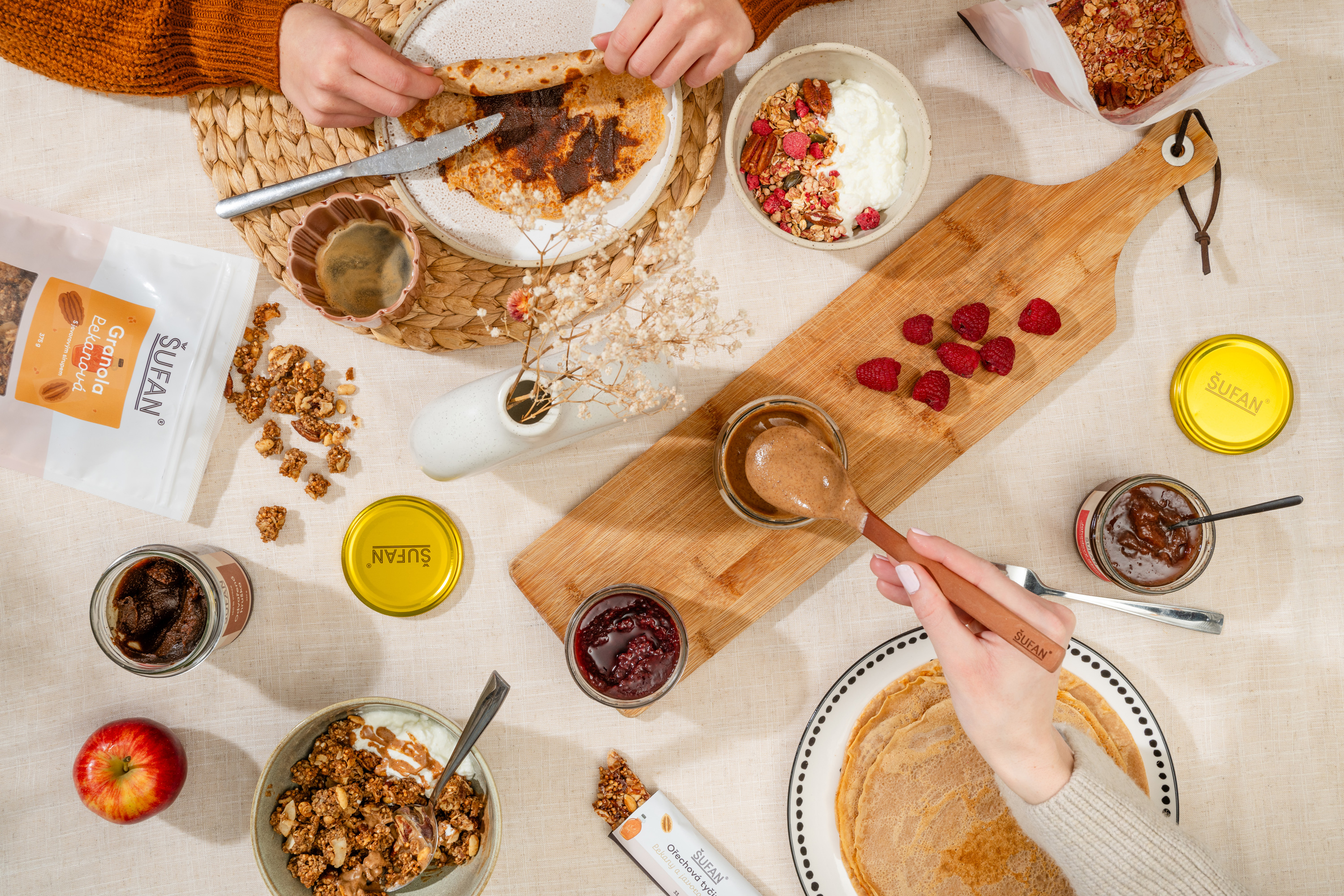 Šufan is a Czech producer of nut butters, granola and other tasty treats for breakfast or snacks, all produced with pure ingredients without added sugar or chemicals. The brand has been on the market since 2014 and launched a new phase of its entire portfolio in 2024. With an emphasis on natural honesty, the redesign presents products with hand-drawn illustrations plus Euclid Square and Benda as brand typefaces.