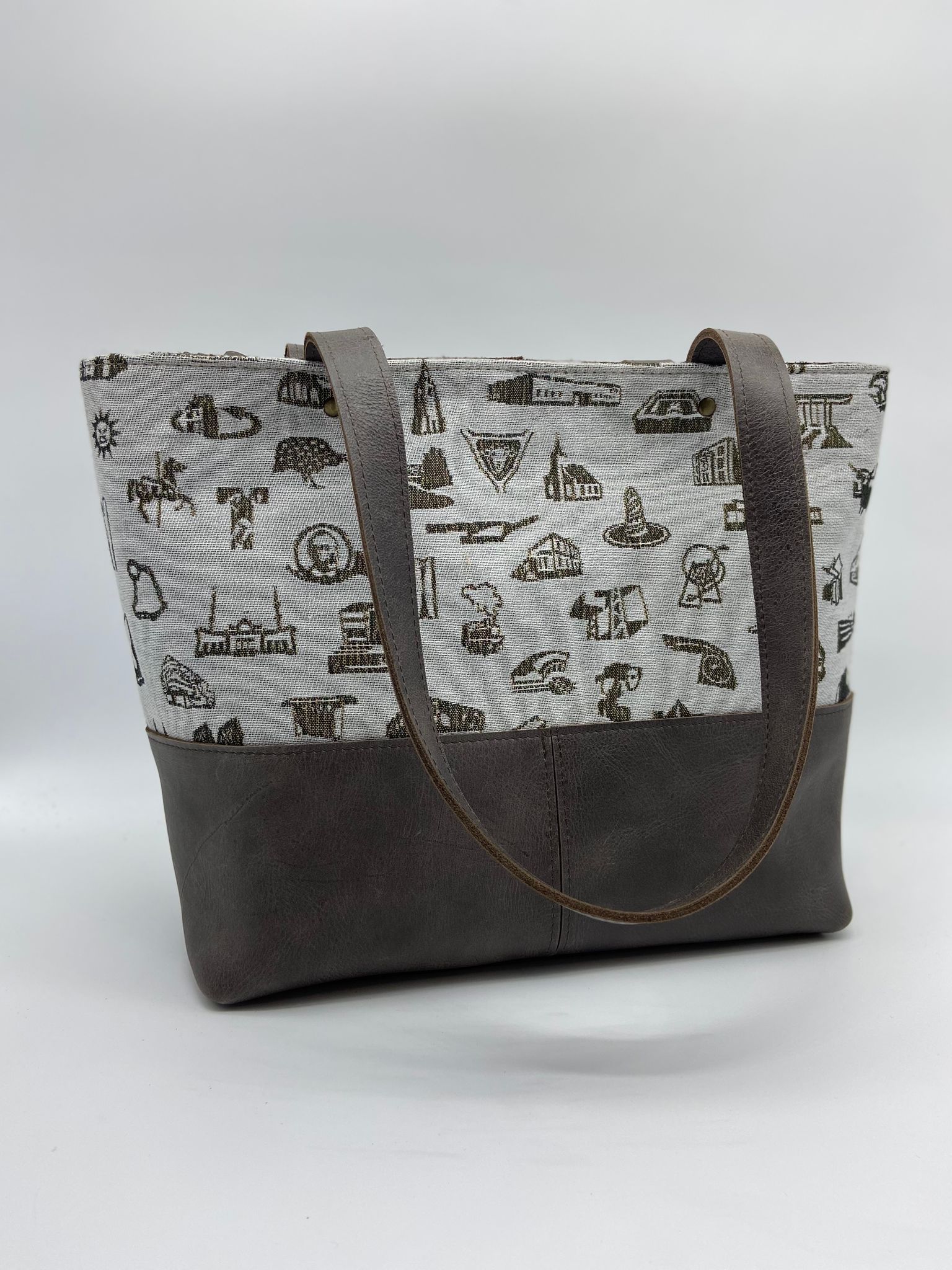TilburgsAns is a typeface inspired by the city of Tilburg, the Netherlands. It not only contains letters, but also a set of 123 icons picturing the local heritage as buildings, stories, events and dialect words. These icons are applied by the TextielMuseum Tilburg in woven fabric. The resulting textiles are sold in the museum shop. The first product in which this TilburgsAns textile was used is an iconic handbag.