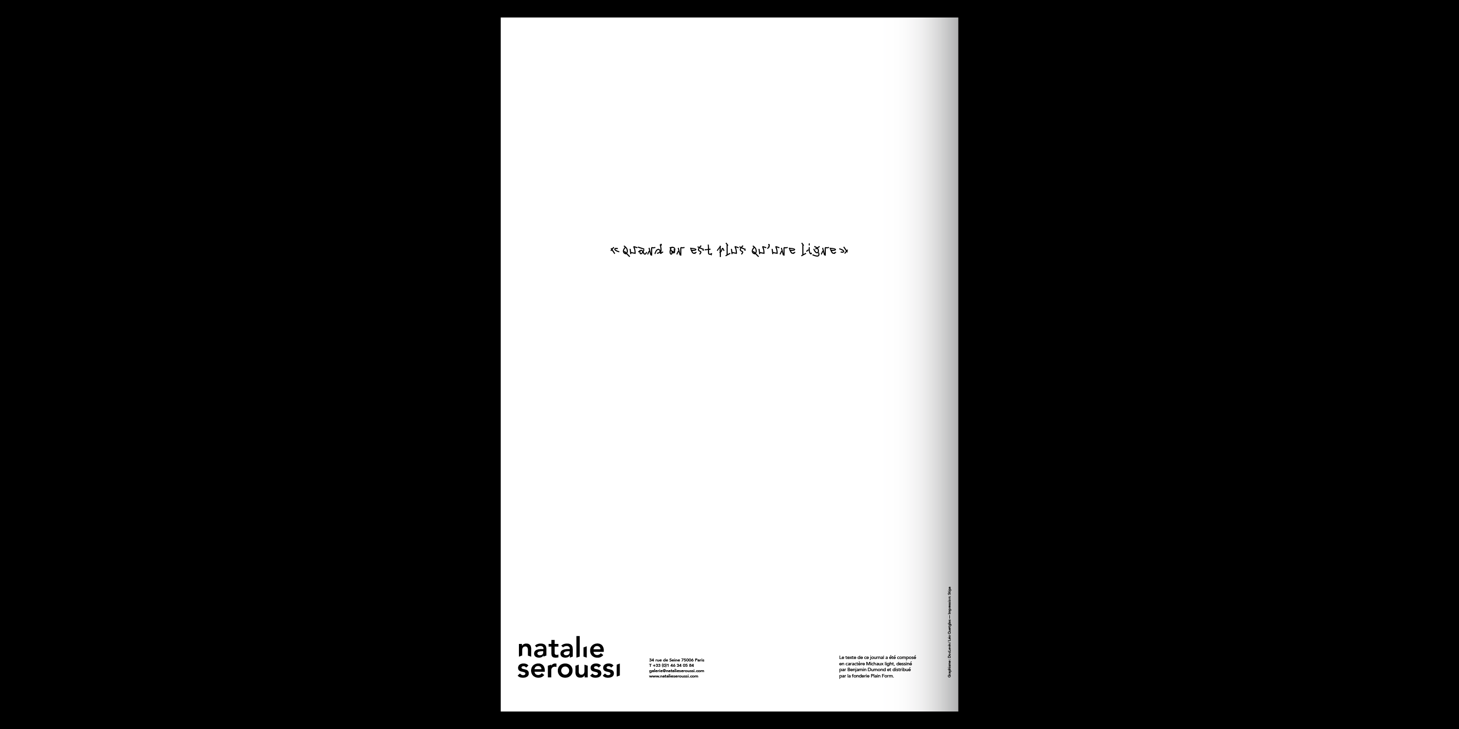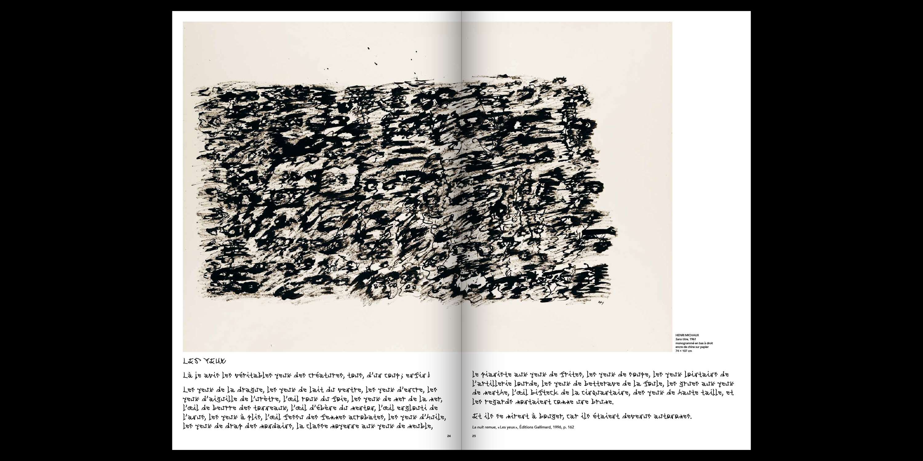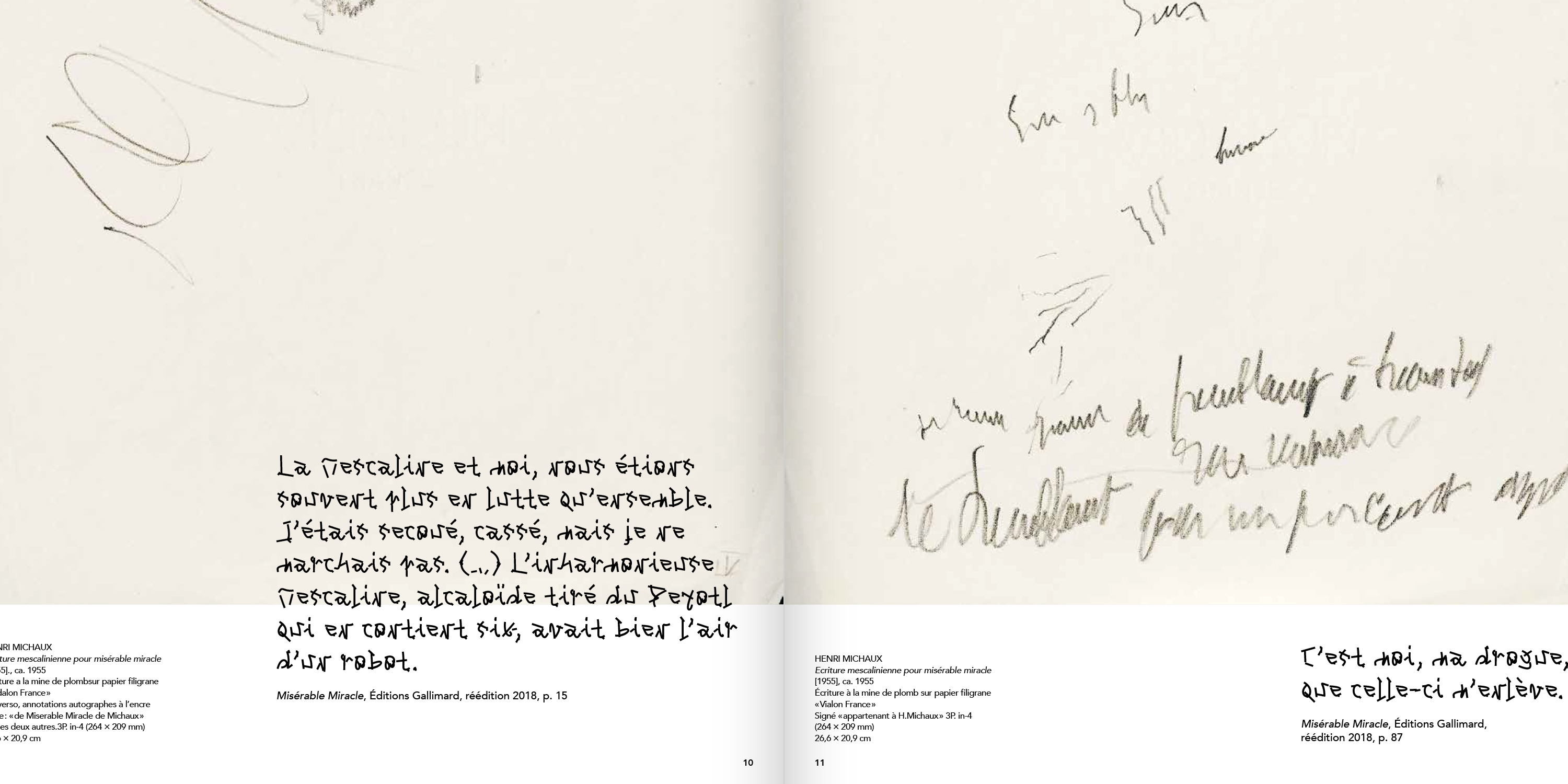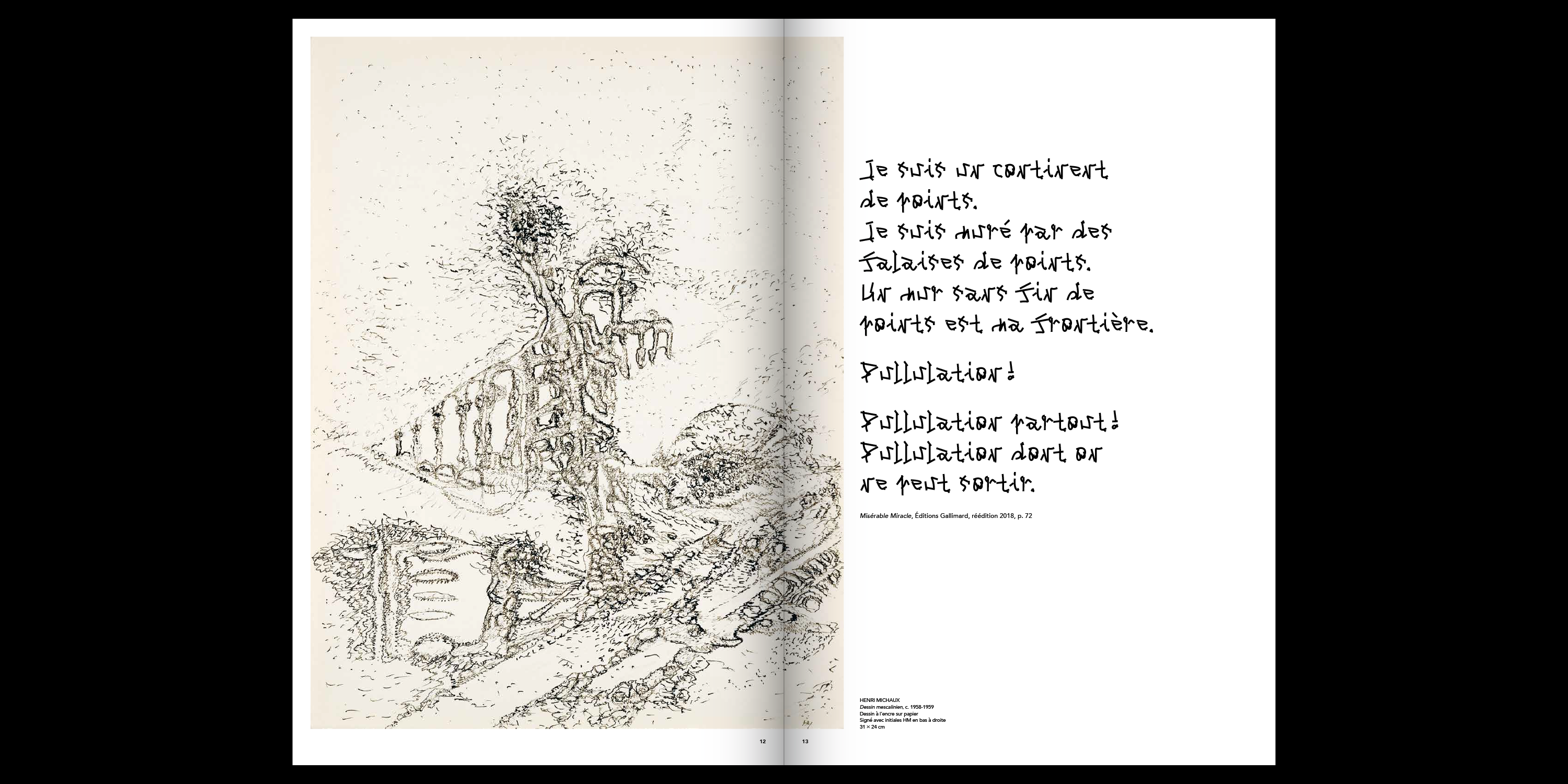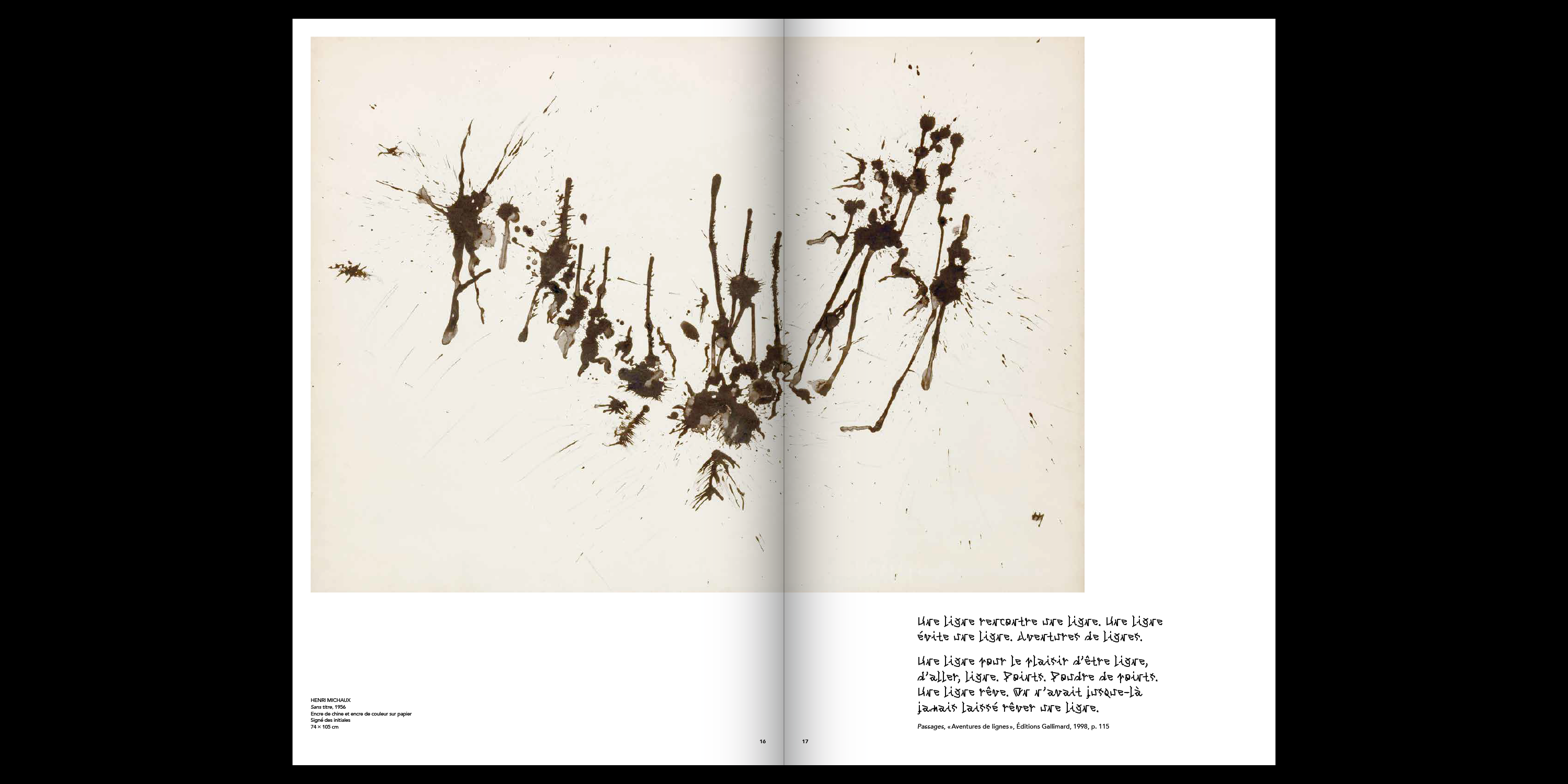 The exhibition communication and accompanying printed catalog were designed by Doc Levin / Léo Quetglas. The title as well as all texts and poems from Henri Michaux are set in Benjamin Dumond’s Michaux, an homage to the artist’s work. When Henri Michaux explored a loss of control in the production of written shapes through the use of narcotics, the typeface relies on computer scripts for the same purpose. Benjamin Dumond wrote a program to generate thousands of random three-stroke signs, then proceeded to subjectively select those which looked most like letters, numbers and other glyphs.