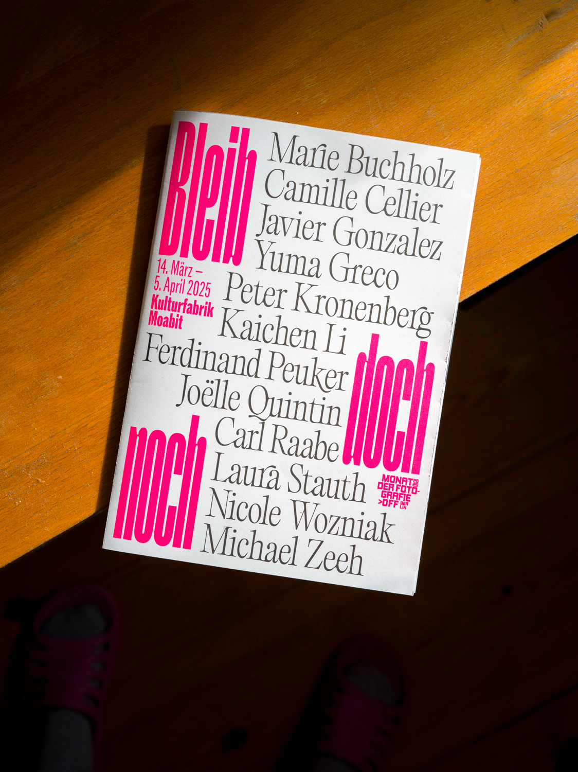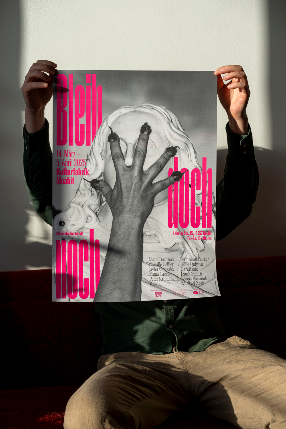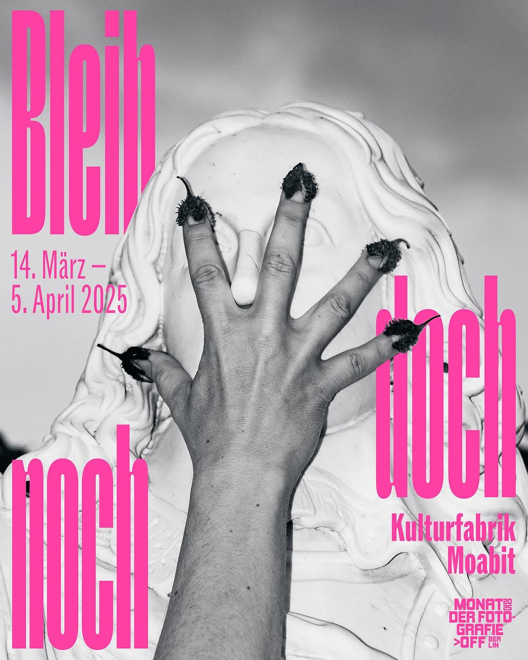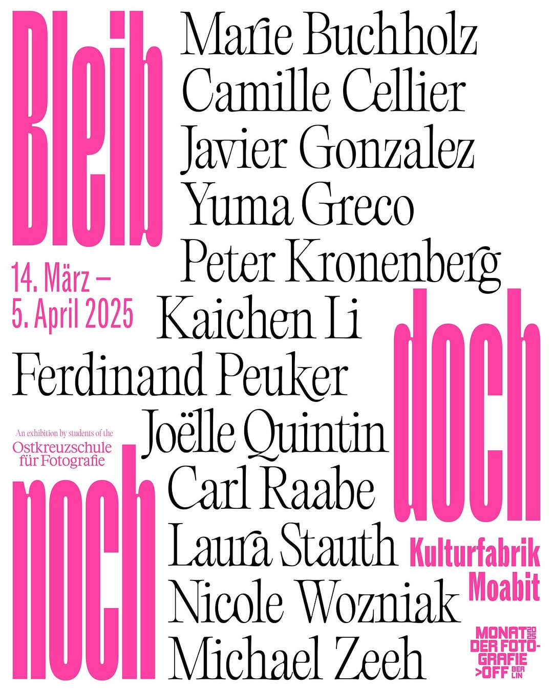 Bleib doch noch is a photography exhibition by twelve students of the Ostkreuzschule für Fotografie, taking place between March and April 2025 at Kulturfabrik, a culture center in the neighborhood of Moabit in Berlin, Germany.