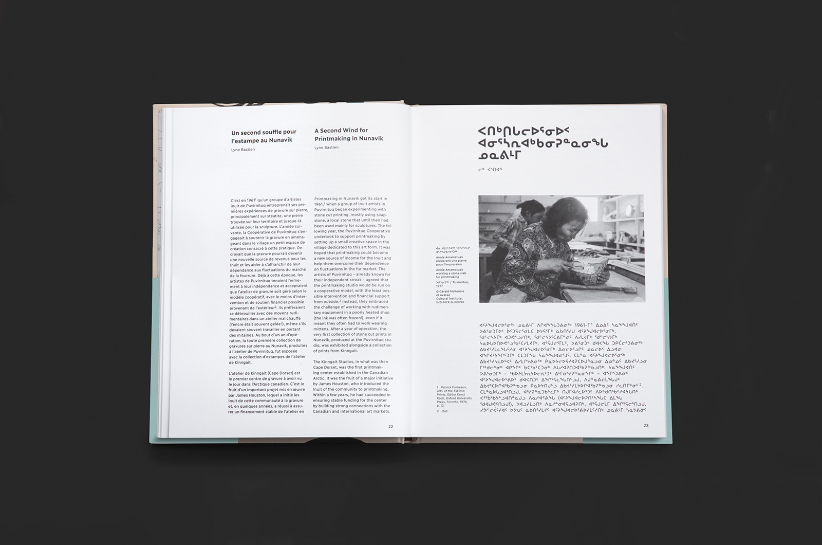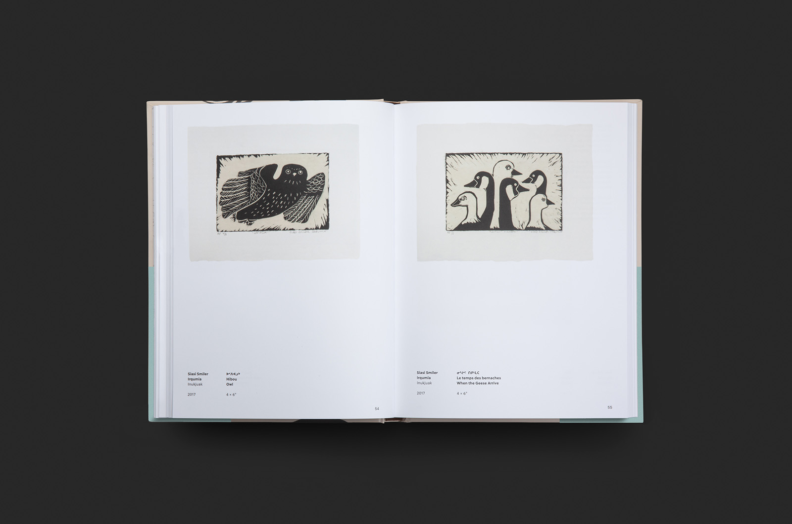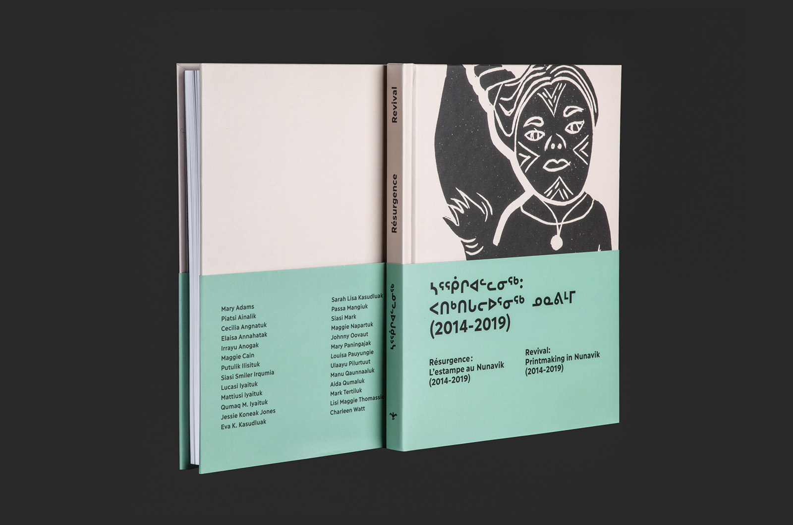 This beautiful 154 pages exhibition catalogue of Revival: Printmaking in Nunavik (2014–2019) [Inuktitut: ᓴᕐᖀᒋᐊᓪᓚᓂᖅ : ᐸᑎᒃᑎᒐᓕᐅᕐᓂᖅ ᓄᓇᕕᒻᒥ (2014–2019); French: Résurgence: l’estampe au Nunavik (2014–2019)] presented at the Musée d’art de Joliette in 2021, includes the 63 linocut prints done by 26 artists present in the exhibition along with a foreword of Lisa Koperqualuk, an essai of curator Lyne Bastien and an interview leaded by Olivia Lya Thomassie with curators Maggie Napartuk and Qumaq M. Mangiuk.