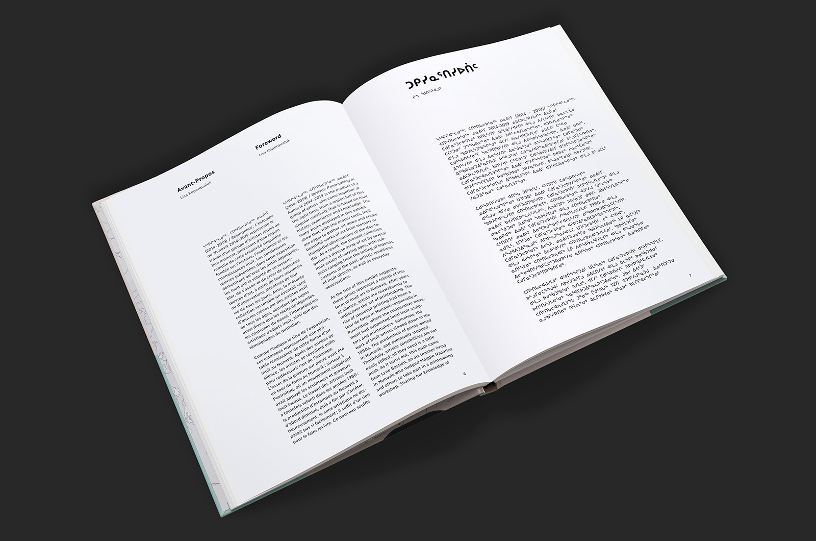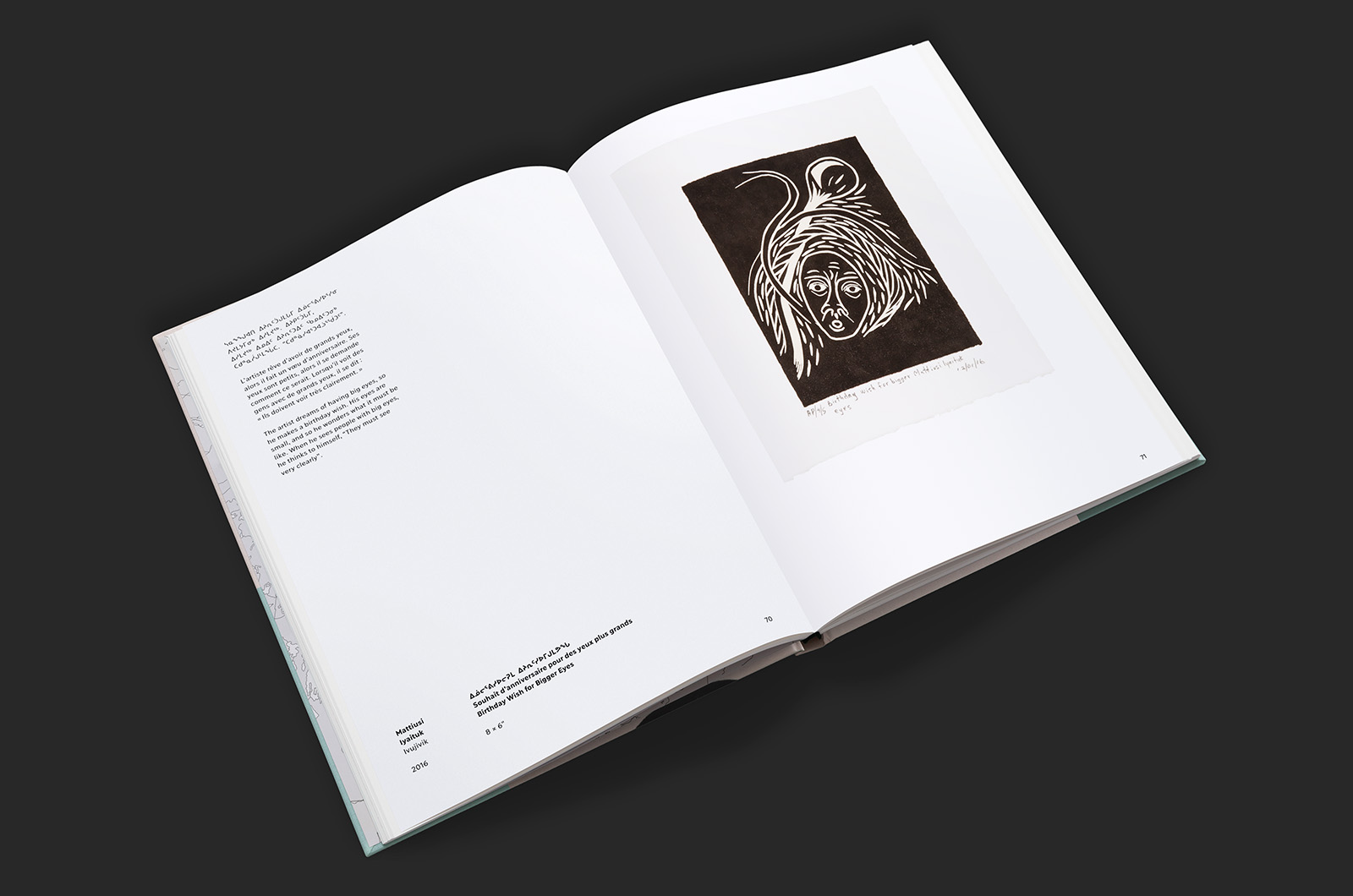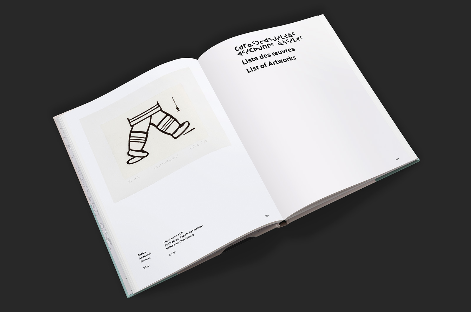This beautiful 154 pages exhibition catalogue of Revival: Printmaking in Nunavik (2014–2019) [Inuktitut: ᓴᕐᖀᒋᐊᓪᓚᓂᖅ : ᐸᑎᒃᑎᒐᓕᐅᕐᓂᖅ ᓄᓇᕕᒻᒥ (2014–2019); French: Résurgence: l’estampe au Nunavik (2014–2019)] presented at the Musée d’art de Joliette in 2021, includes the 63 linocut prints done by 26 artists present in the exhibition along with a foreword of Lisa Koperqualuk, an essai of curator Lyne Bastien and an interview leaded by Olivia Lya Thomassie with curators Maggie Napartuk and Qumaq M. Mangiuk.