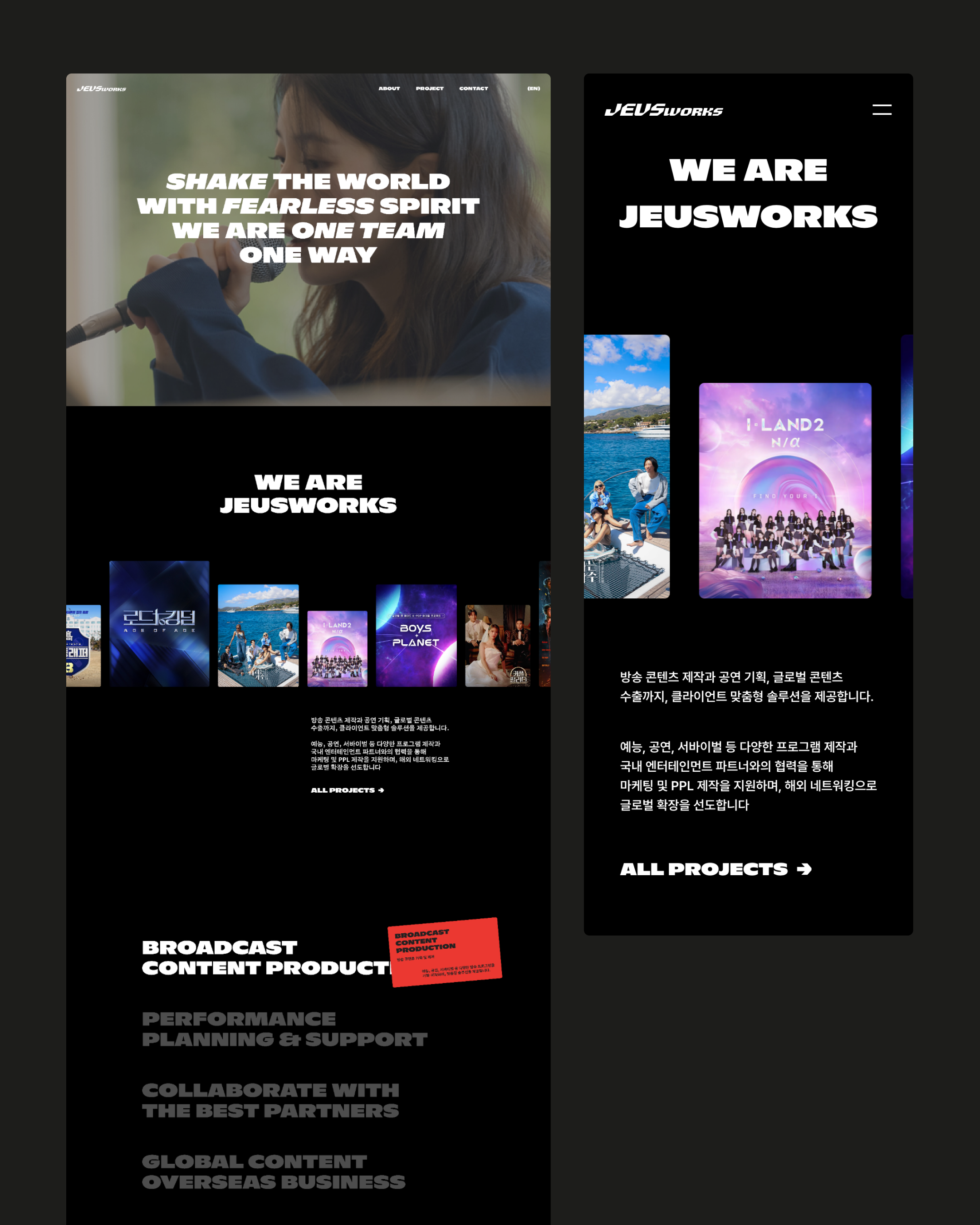 JEUSWORKS is a production group that plans and produces diverse content for domestic and international broadcasters, music, OTT platforms, and live performances.