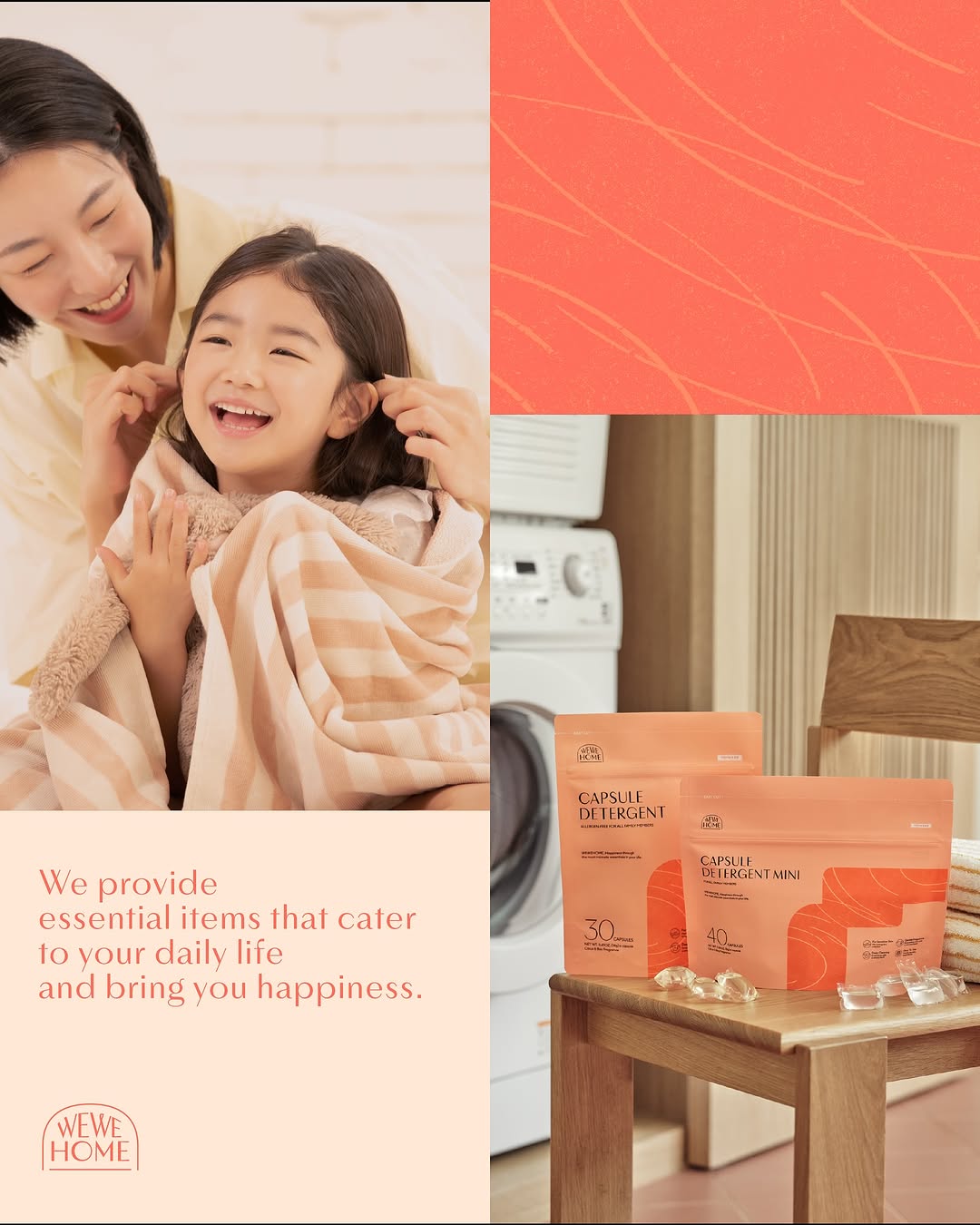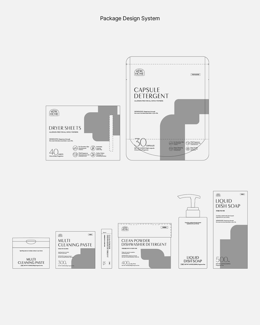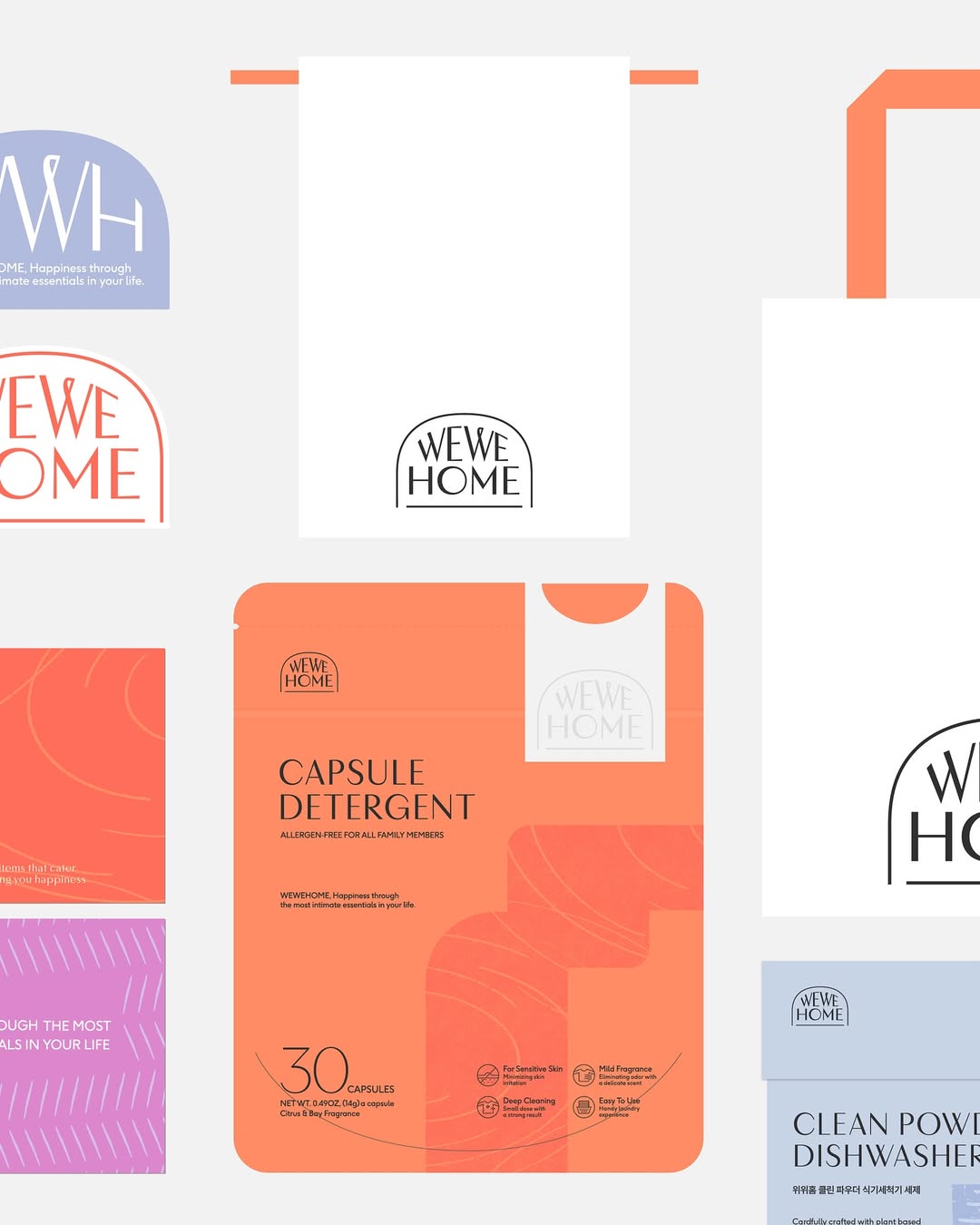 WEWEHOME’s visual elements consist of typography, a color palette, and pattern graphics. The main typeface, Layfort, conveys a modern yet soft image, while the secondary one, F37 Ginger, was chosen for its simple and contemporary style. The color palette and pattern graphics intuitively represent various activities that take place in the kitchen, laundry, bath, and living room, reinforcing the brand’s identity.
