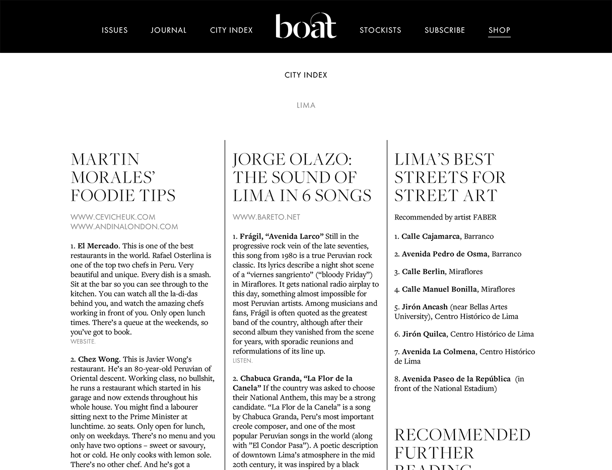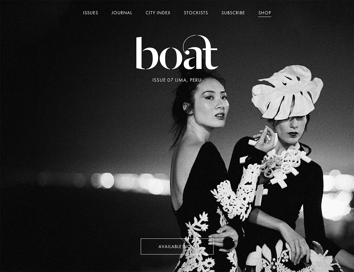 Boat Magazine Website Contributed by Stephen Coles on May 2nd, 2014. Artwork published in 2014. Source: www.boat-mag.com License: All Rights Reserved. “Boat magazine is an independent travel and culture publication that focuses on a different, inspiring city for each issue.” For its seventh issue, Boat asked She Was Only to redesign the magazine. This version of the website coincides with that change. Source: www.boat-mag.com License: All Rights Reserved. Source: www.boat-mag.com License: All Rights Reserved. Source: www.boat-mag.com License: All Rights Reserved. Typefaces More about Dala MoaGet Dala MoaMore about FuturaGet FuturaMore about Freight Display & BigGet Freight Display & BigMore about Freight TextGet Freight Text Formats Web (5630) Topics Travel (799) Local (1577) Designers/Agencies Extract Studio (5) Davey Spens (1) Tagged withculture (137)magazine websites (87)webfonts (449)Boat magazine (4) Artwork location United Kingdom (3294) London (1822) In Sets5 Fonts (Jill Greenwood) (4)Set 1 (fy_younghtings) (172)OCG (Seth Hoercher) (11)TGC - GTM Inspiration (Lara Frayre) (6) Post a comment Name Email – will not be published Website Your response Submit Comment More Dala Moa in use Boat Magazine, Issue 7: Lima2014Extract StudioContributed by Stephen Coles Staff Pick Ragnar Hartvig2016Commando GroupContributed by Richard Baird Staff Pick Essem Design brand identity2014BedowContributed by Love Lagerkvist Sponsor More in Local Teatro Nacional Dona Maria II2019R2 DesignContributed by Feliciano Type Staff Pick Münster Urban, issue 22016Heithoff & CompanieContributed by Jakob Runge Musiques de ruesc. 2008Thomas Huot-MarchandContributed by 205TF Staff Pick Benzin Young Swiss Graphic Design2001Thomas BruggisserMichel FriesContributed by KontourMacaroni(Sample unavailable) More in Web Grand Cuisine2019LargeContributed by Formagari Lewa House2013Stuff & NonsenseContributed by Florian Hardwig Public Square2018unknownContributed by Emtype Foundry Loro restaurant website2023The Graphic StandardContributed by Shane Bzdok Staff Pick More Fonts In Use Roland TR-909 Rhythm Composer1983Tadao KikumotounknownContributed by Patrick Concannon Staff Pick Heerlijke haring in tomatensaus1956BauerContributed by Florian Hardwig Staff Pick Taste of Chicago 20202020Nick AdamSpanContributed by Nick Adam Staff Pick Prague Quadrennial: The Performance Space Exhibition2019Matěj ČinčeraJan KlossContributed by Blaze Type Staff Pick
