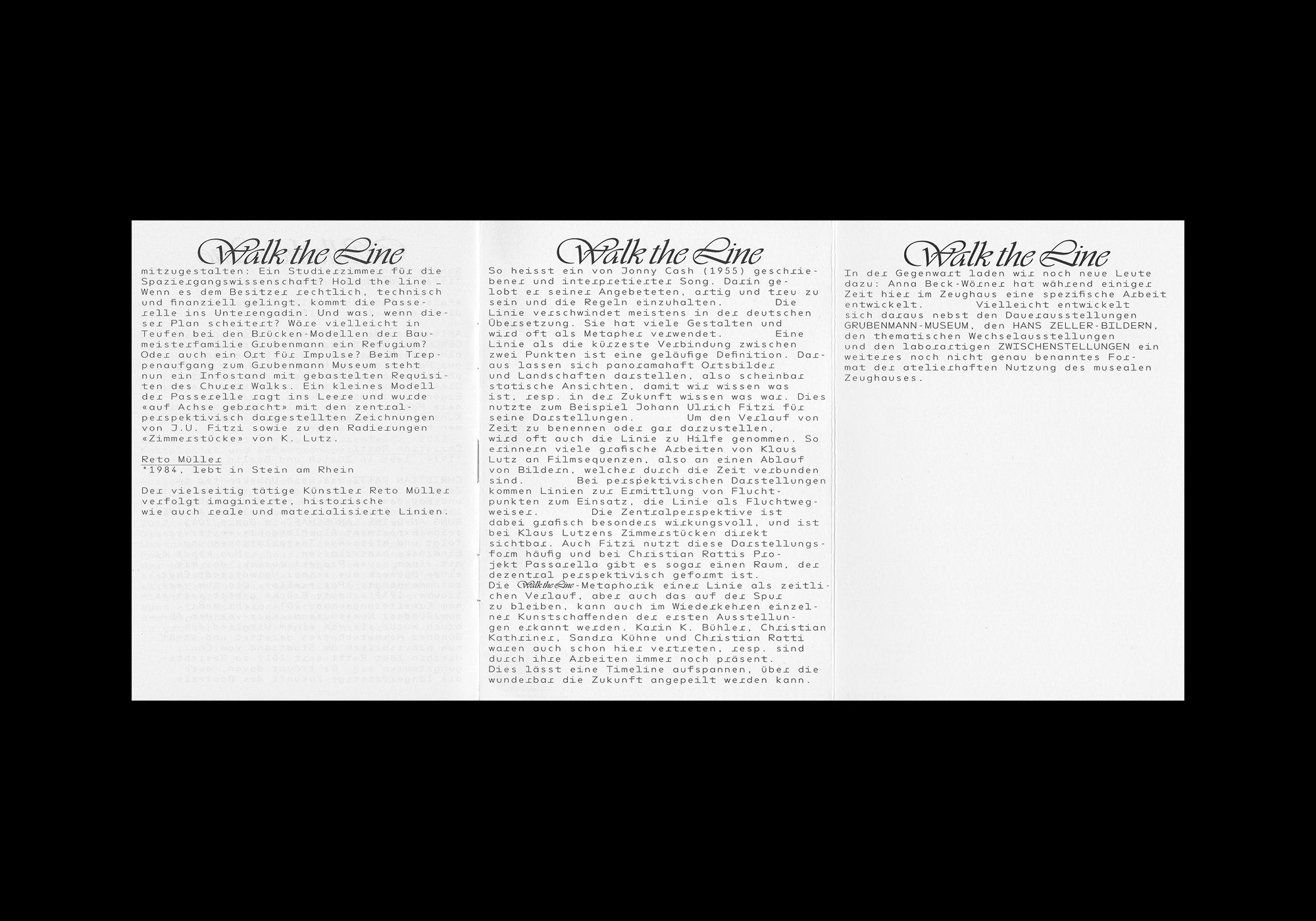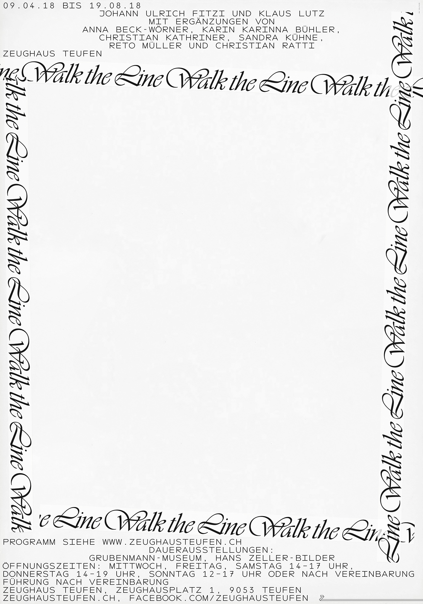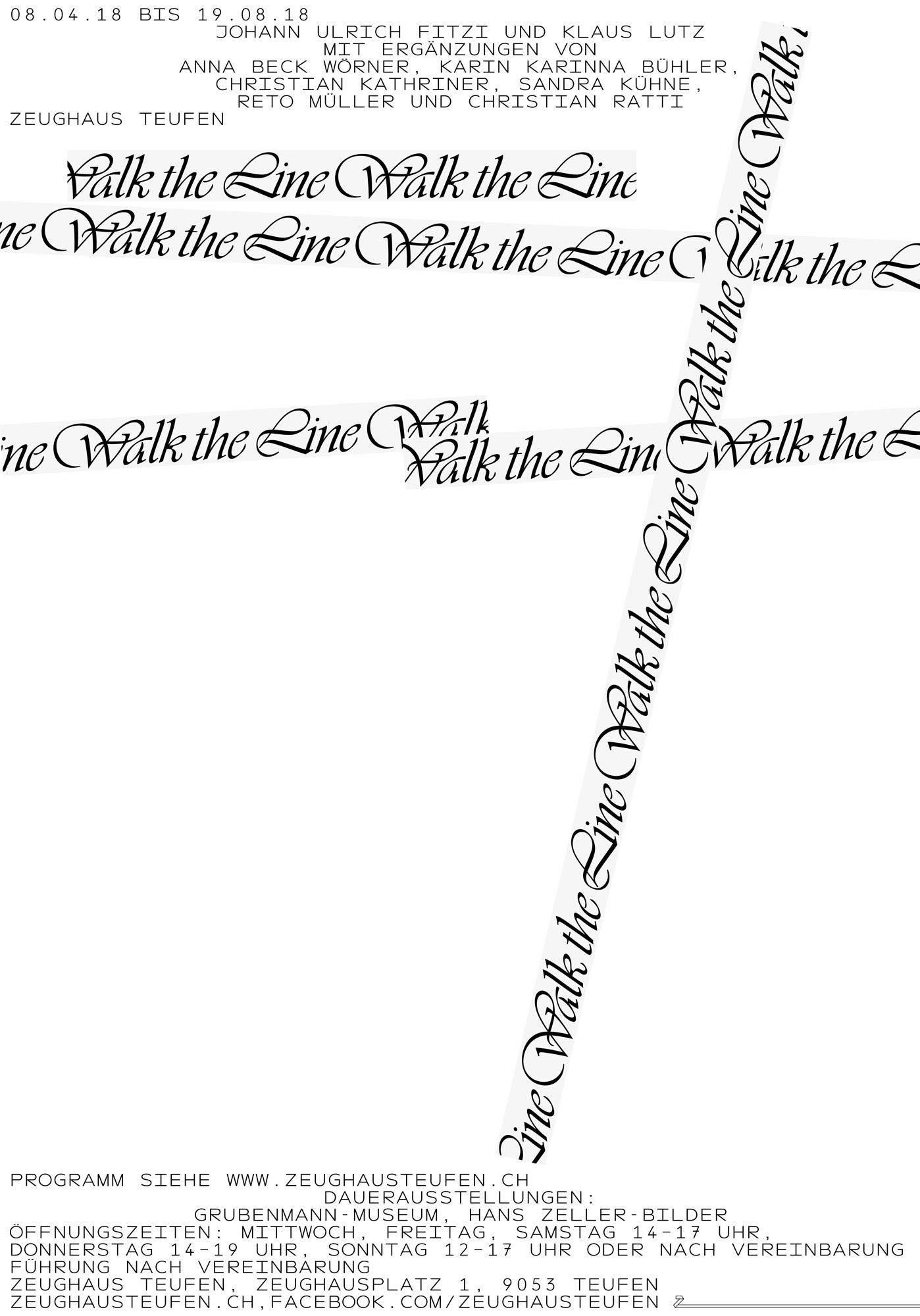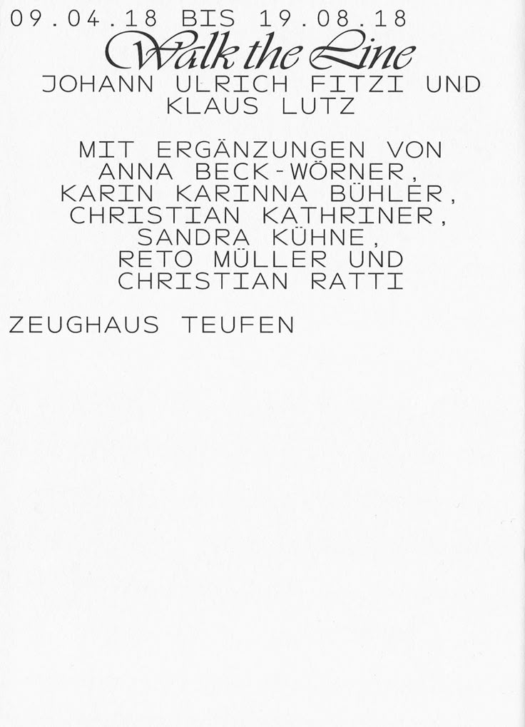 Poster series and brochure for the exhibition Walk the Line at Zeughaus Teufen, set in NEXT Mono andVivaldi. The exhibition featured works by Johann Ulrich Fitzi (1798–1855) and Klaus Lutz (1940–2009).