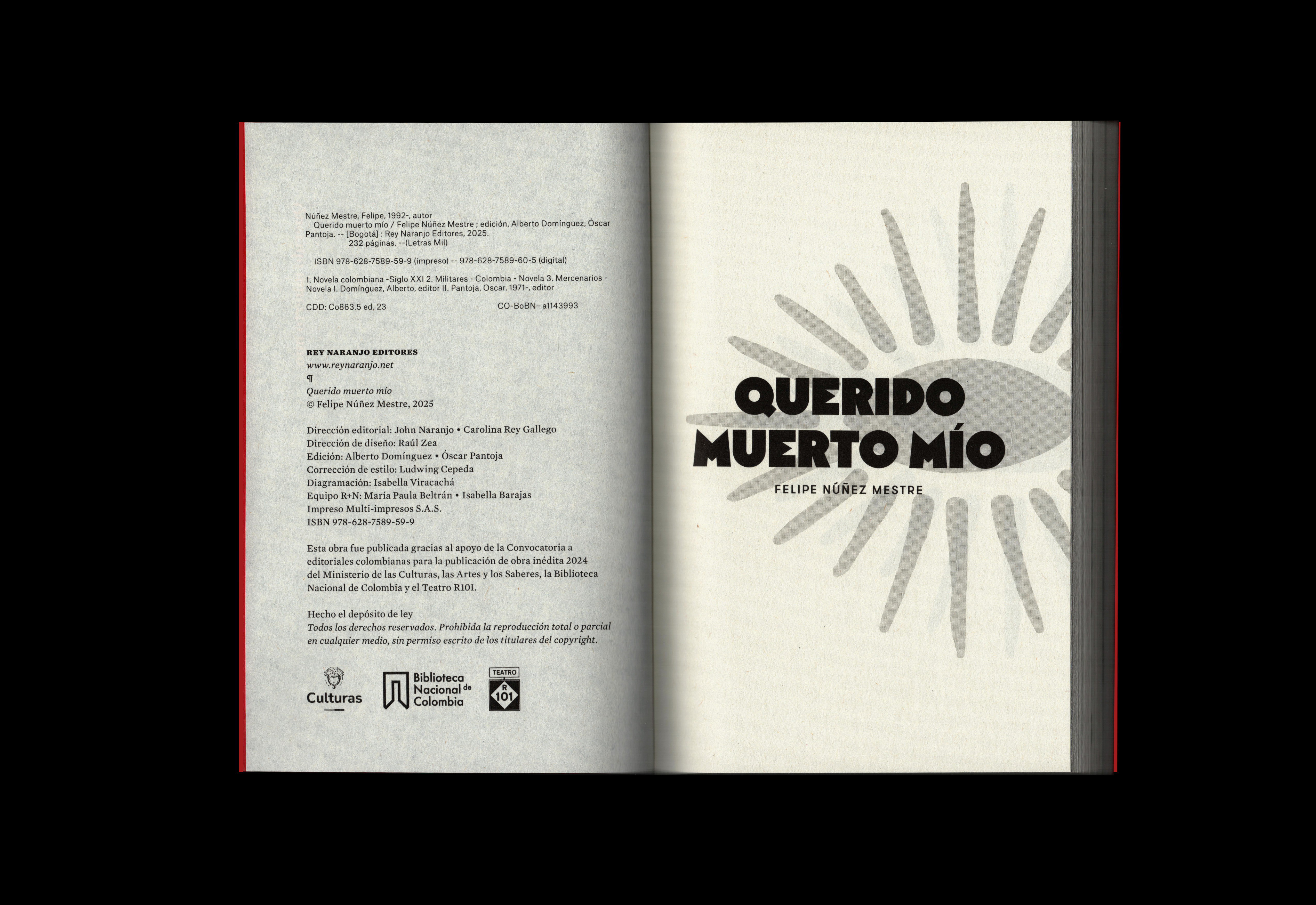 Querido muerto mío is a novel by Felipe Núñez Mestre, published by Rey Naranjo Editores, that delves into the complexity of the willingness to go to war and the fragility of bodies shaped for combat, set in an opaque Caribbean with shifting borders and a threatening sea. The story contrasts the weight of a childhood among corpses, a furious adolescence, and an adult life trying to find meaning amid the military, the pursuit of fortune, and death. The book’s visual concept was created by Raúl Zea, Isabella Viracachá, and Isabella Barajas as part of the Rey Naranjo Editores design team.