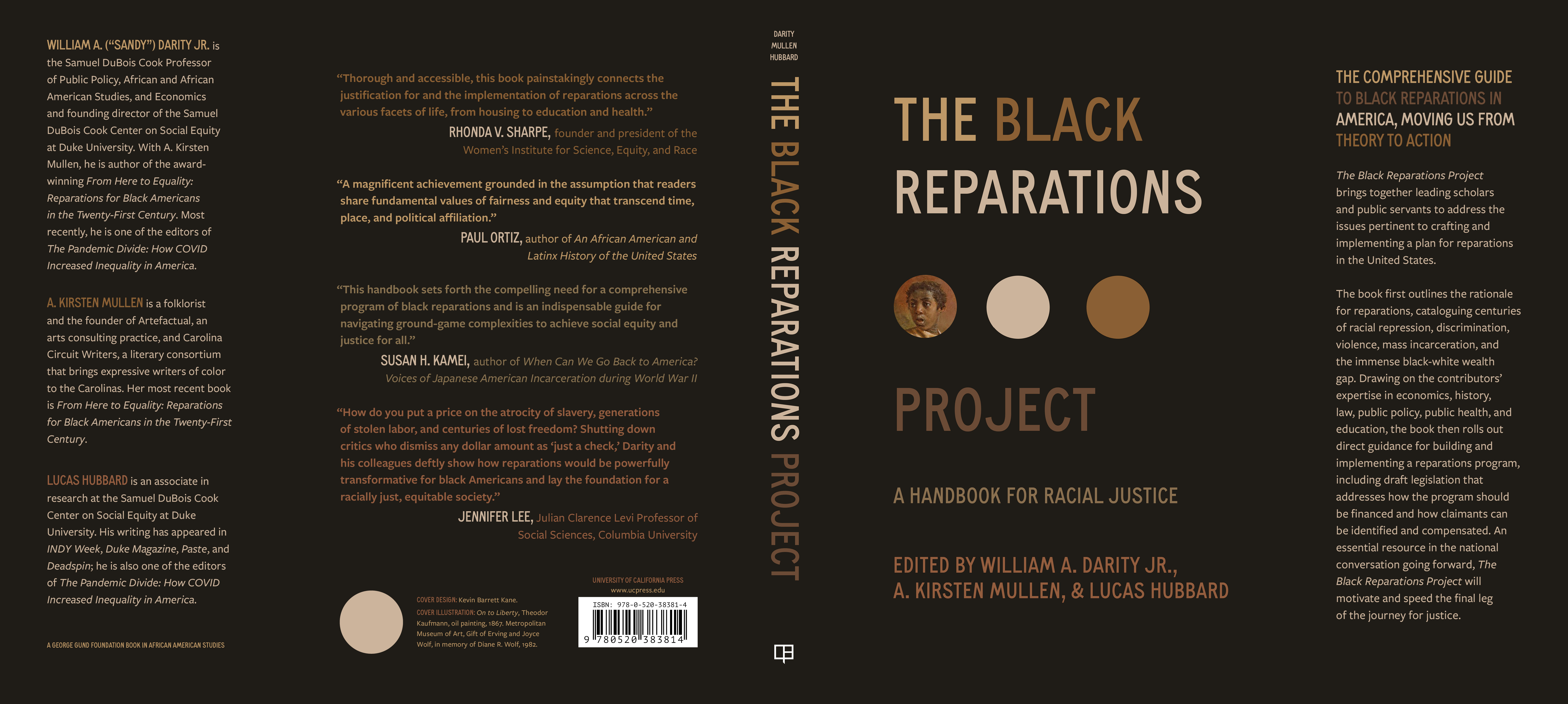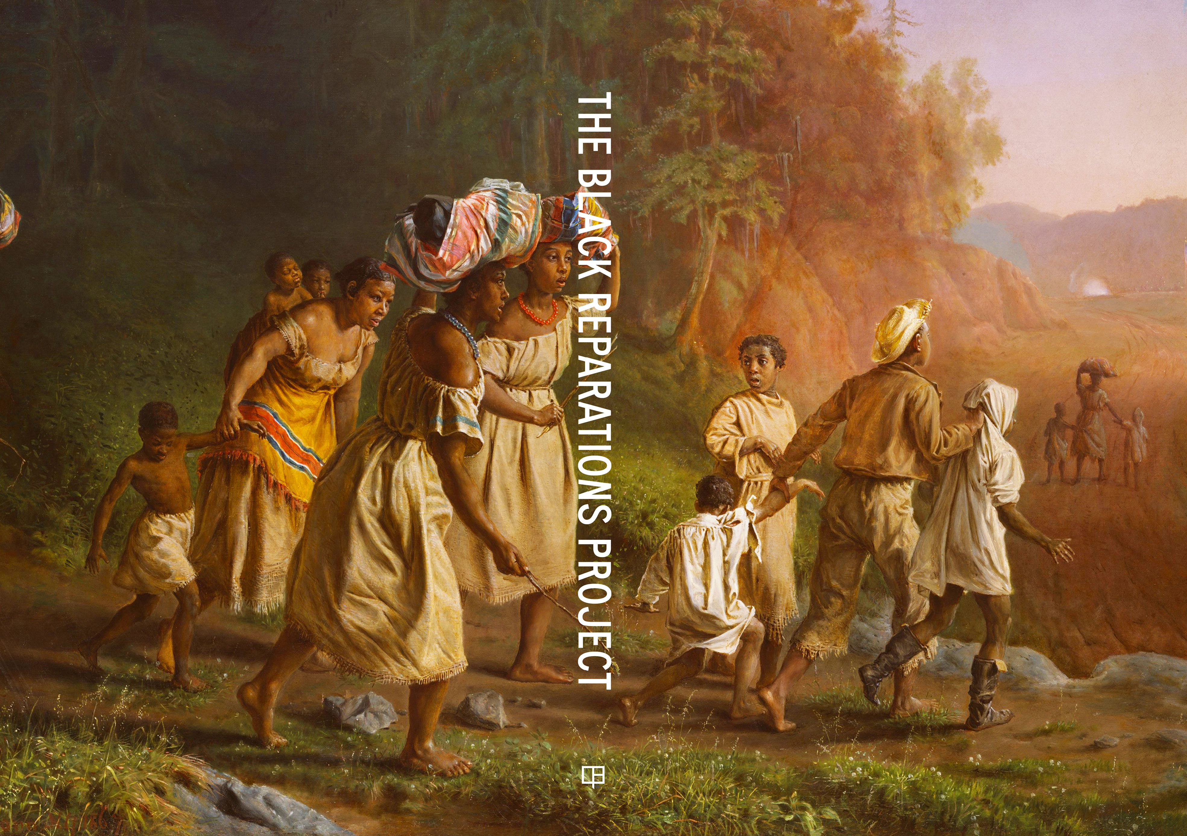 Working on a project like The Black Reparations Project is always a difficult task of marrying concept with content. The editors were keen to use Theodor Kaufmann’s 1867 painting On To Liberty, which depicts a group of recently enslaved black Americans navigating an uncertain path to freedom. The publisher wanted something typographic. I opted for a combination of the two in the extreme, with a minimal jacket design that features only an ellipse (indicating the notion of “we’re still waiting [for reparations]”), but instead of the first period is a die cut that reveals one boy’s face as he looks backwards rather than forwards—again, an illusion to what the book’s content is doing as well. The printed case underneath features On to Liberty in its entirety.