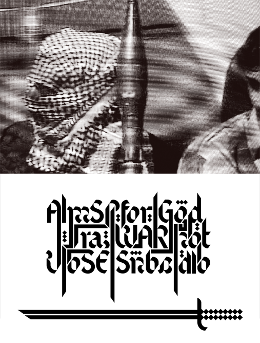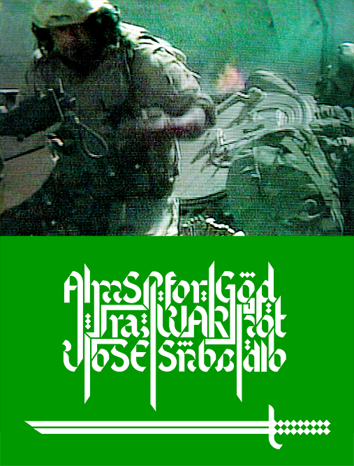 The Nationalist and Patriot find common ground in the face of the Flag which flies above their homeland. I present you with a new interpretation of civility and faith; a re-working of the flag of the House of Saud. The calligraphic work is my interpretation of the Shahada or the Islamic declaration of faith, which reads: La Ilaha Ila Allah Muhammada Rasulu Allah. That translates to: There is no god but Allah; Muhammad is the Messenger of Allah. My reworking reads differently but still professes a proud reverence for a Faux Theocratic State.