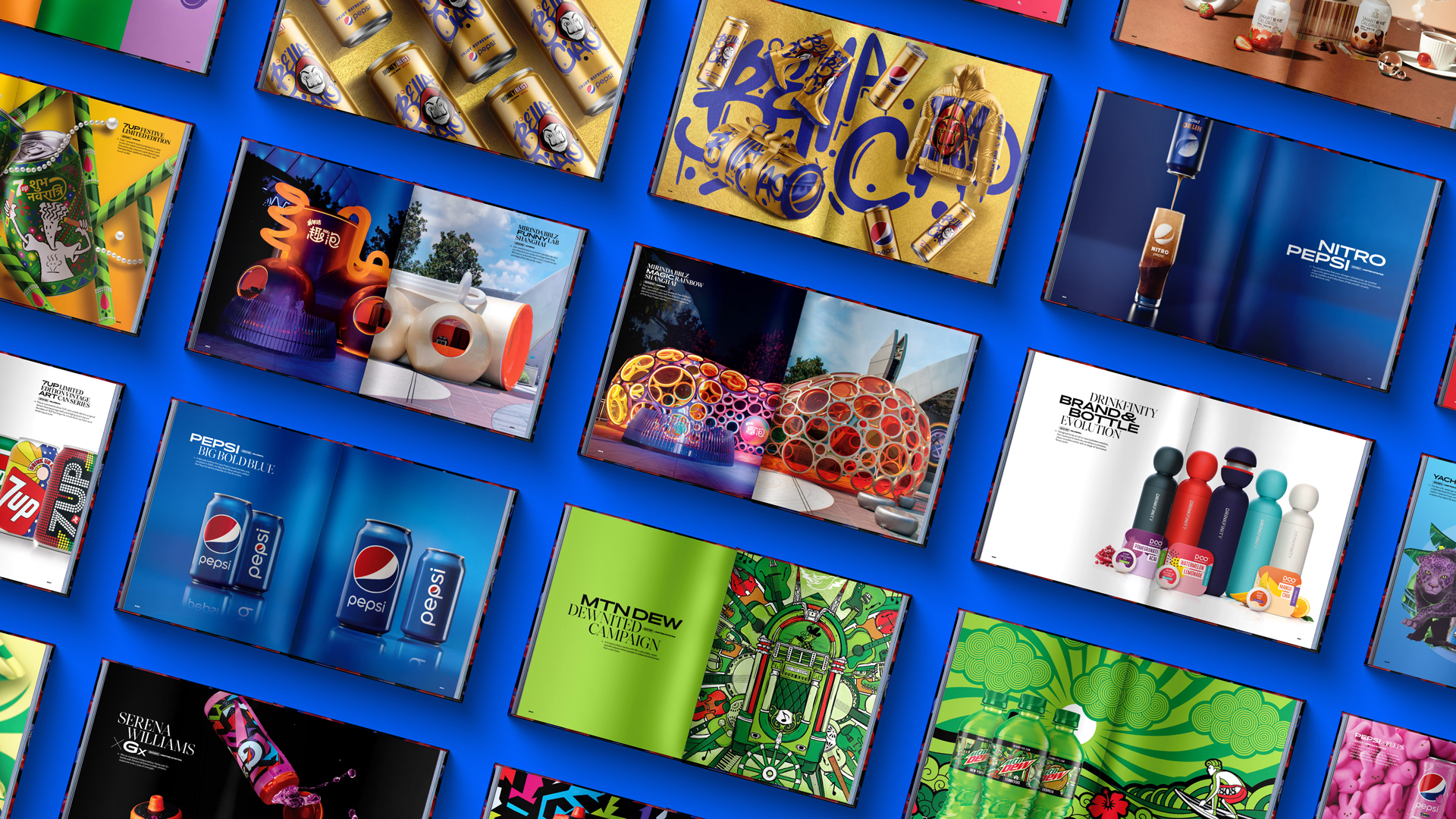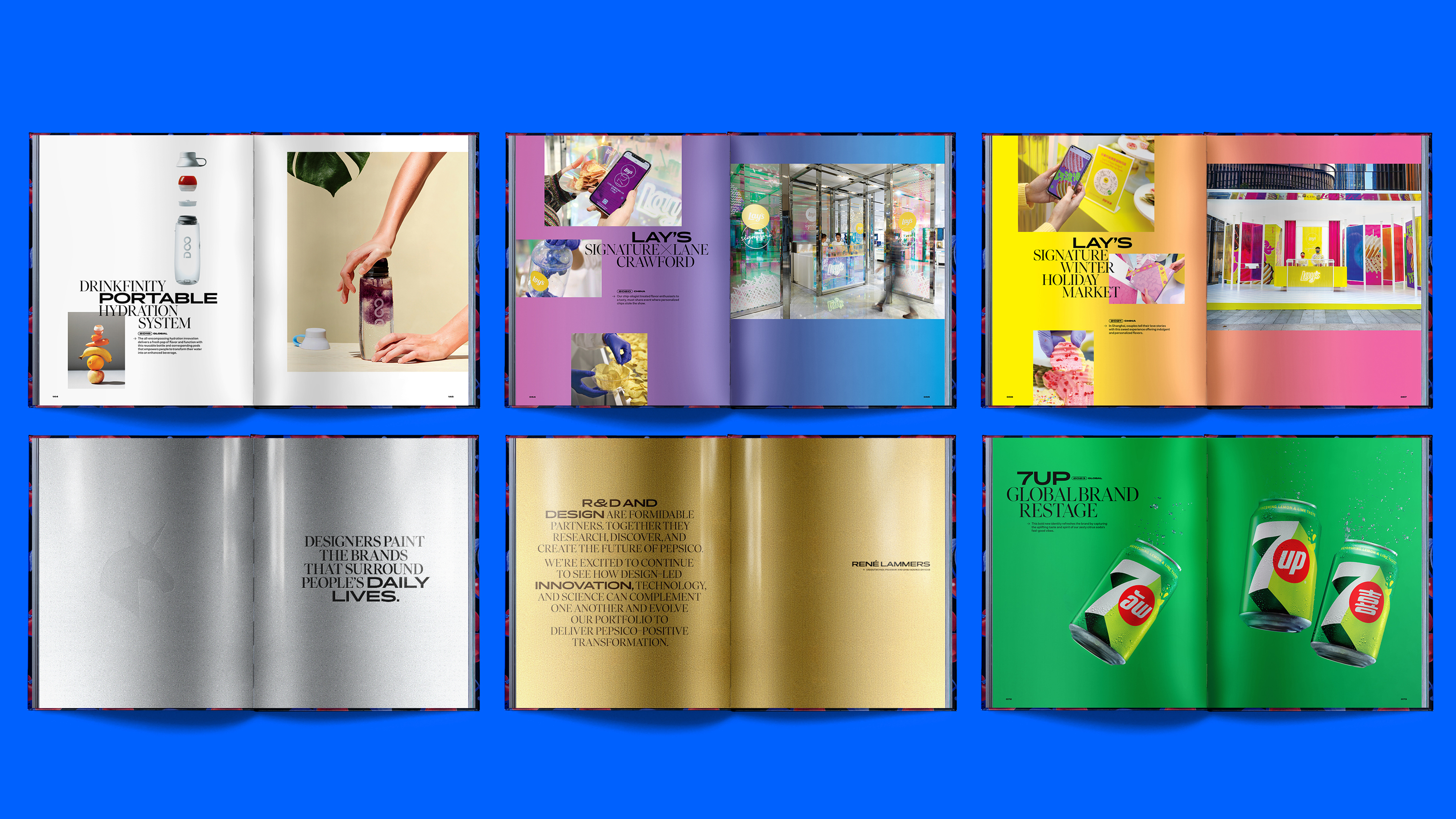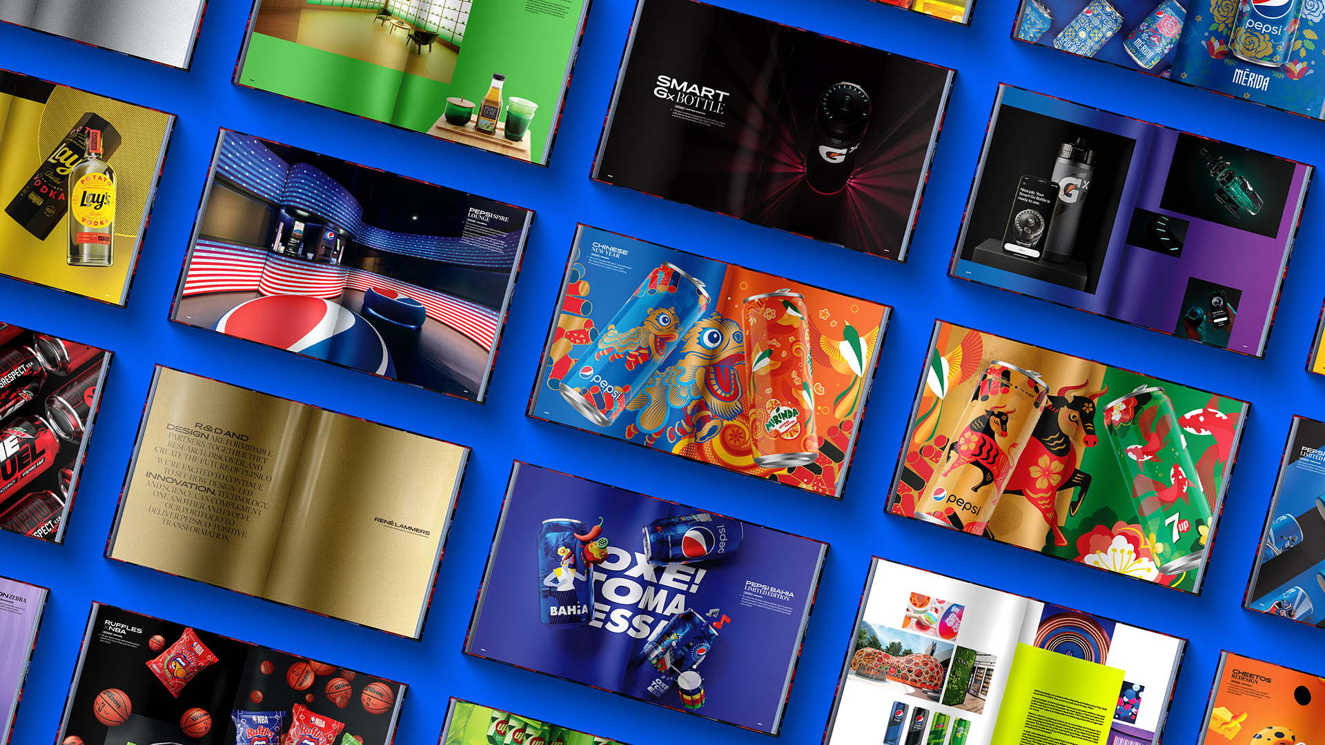 The PepsiCo design team envisioned an anniversary book that honors a decade of creative excellence in brand design. Each page showcases revolutionary products and services brought to life through dynamic cropping, thoughtful composition, and a vibrant color palette, capturing PepsiCo’s bold and influential presence over the past ten years.