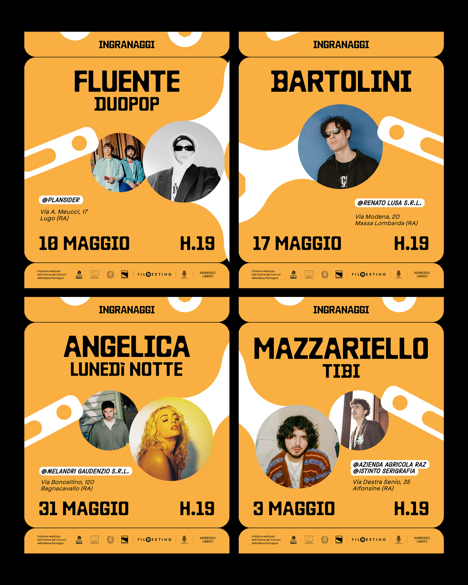 Ingranaggi is a cultural festival organized by Radio Sonora and Filmeeting that brings music and art into the companies of the Bassa Romagna region. It features stages immersed in workplaces and performances that transform production spaces into artistic settings.