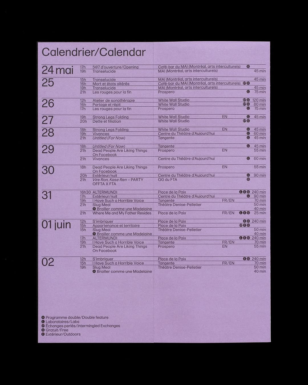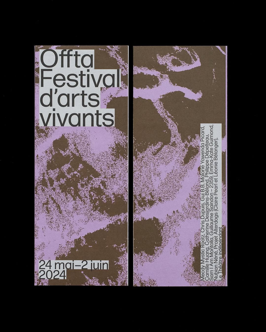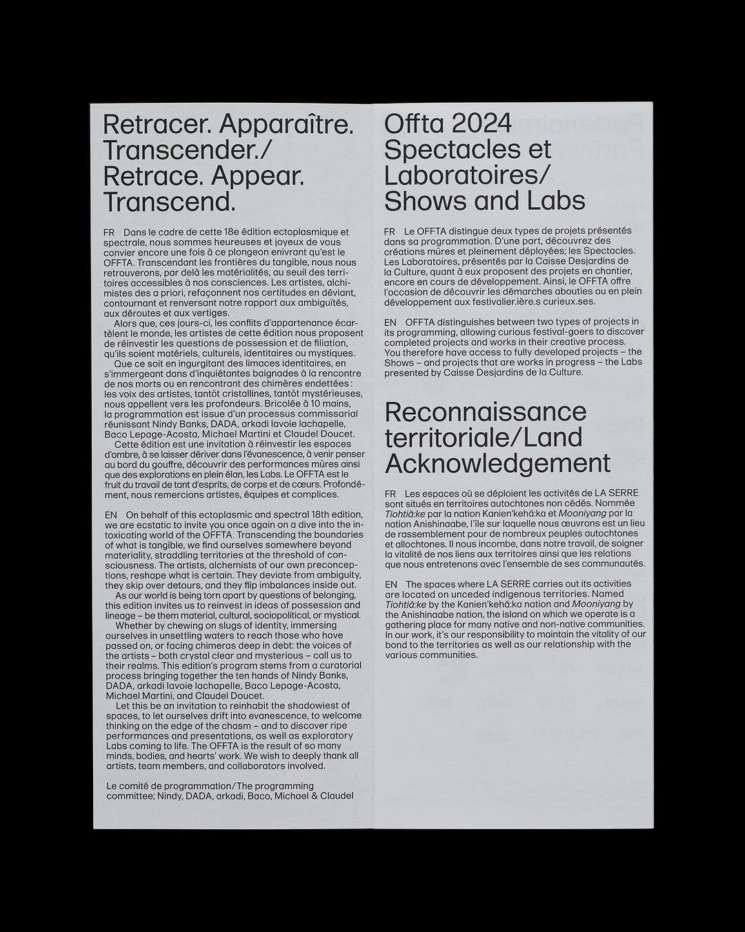 Visual identity and website design for the 17th edition of OFFTA. OFFTA is a festival dedicated to the creation of avant-garde live art. Throughout the year, it surveys the local artistic landscape in an effort to put forward creators whose practices trace new avenues in theatre, dance and performance. Programming by Patrick Thériault.