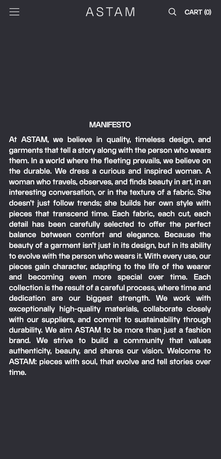 At ASTAM, we believe in quality, timeless design, and garments that tell a story along with the person who wears them. In a world where the fleeting prevails, we believe on the durable. We dress a curious and inspired woman.