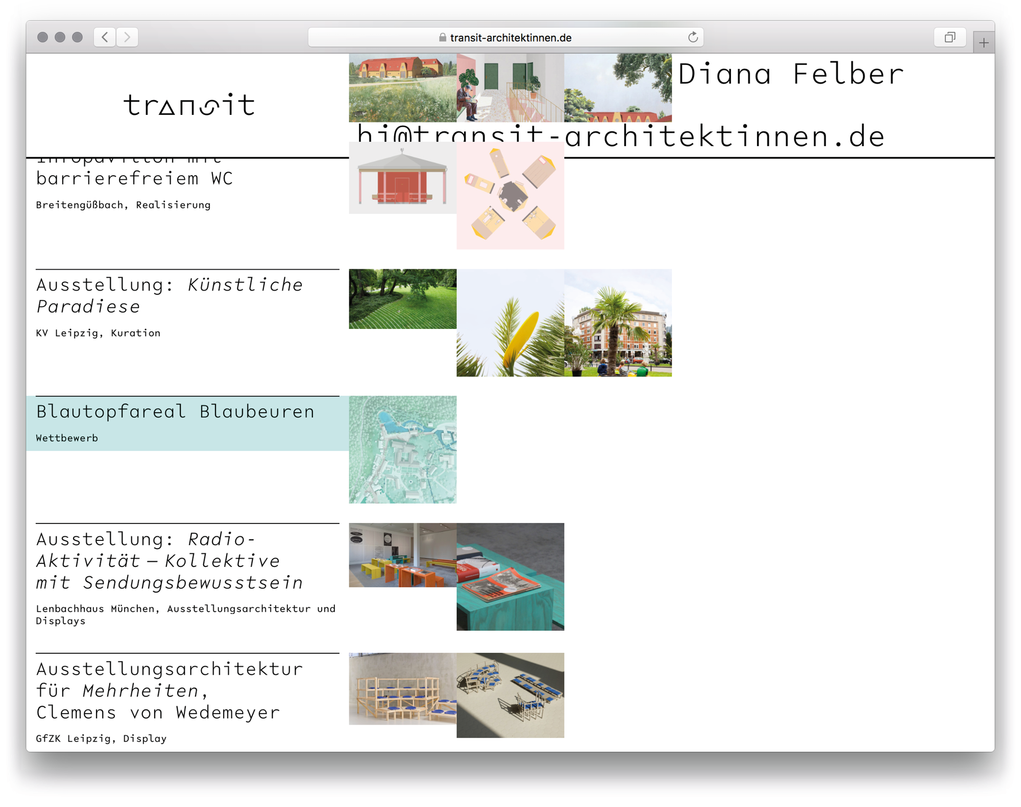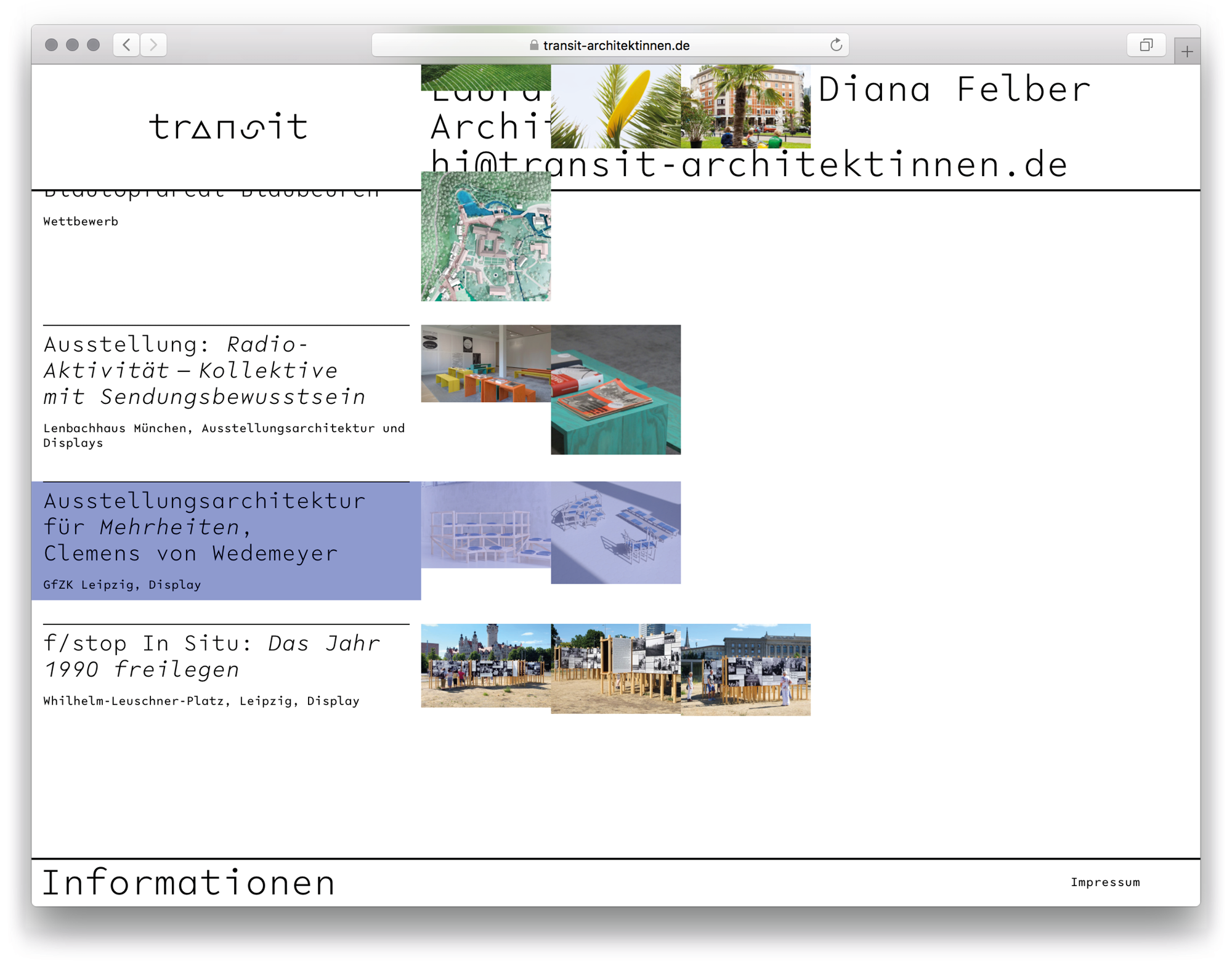 A project index helps to find a specific project. The project pages can be composed of images and white space using grid structure in a custom backend, running Kirby as a content management system.