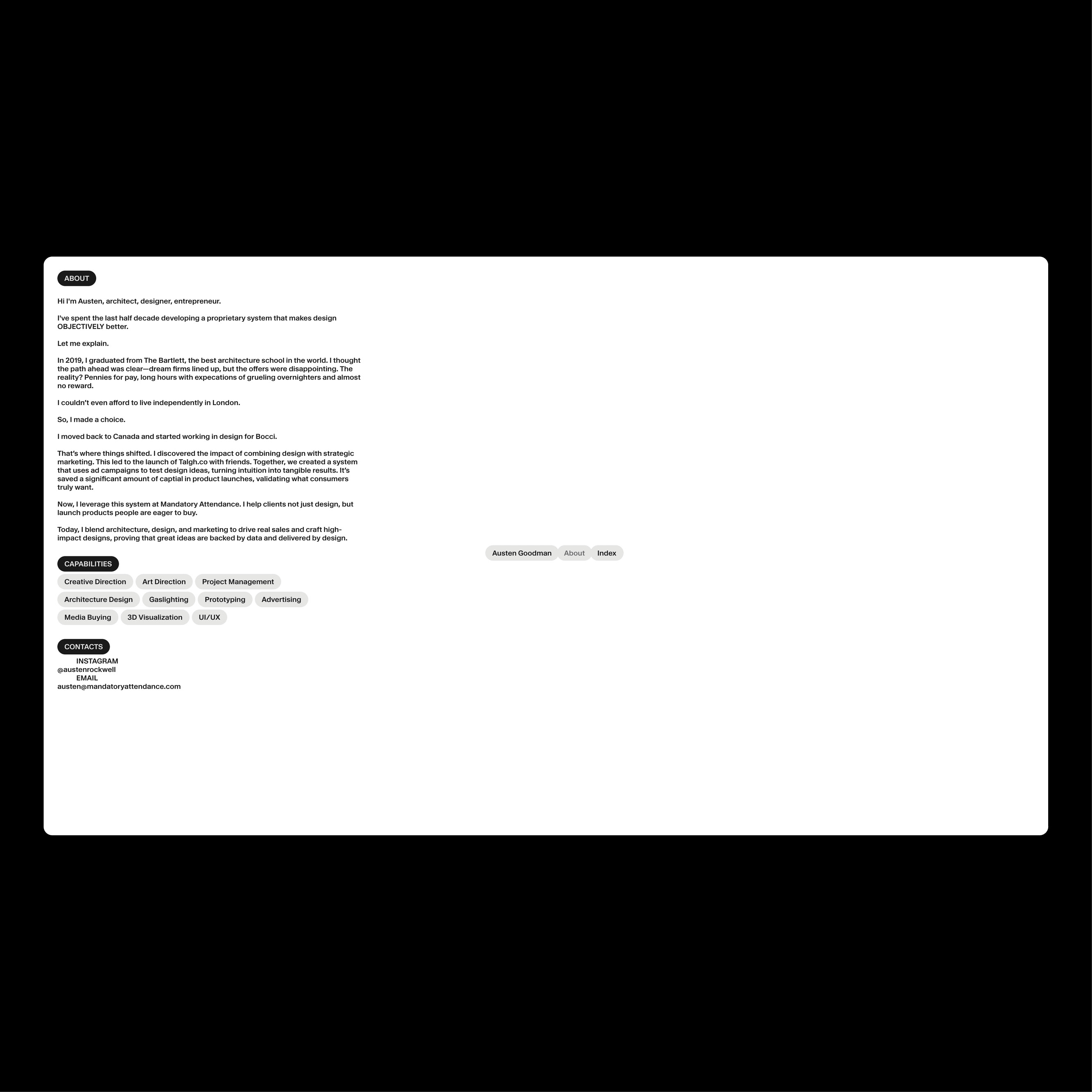 Austen (Goodman) is an architect, designer, and entrepreneur. After graduating from The Bartlett, he shifted from traditional architecture to explore the intersection of design and marketing. He co-founded Talgh.co, building a system that tests design ideas through ad campaigns, turning instinct into data. Now, through Mandatory Attendance, he helps clients launch products that are not just well-designed, but truly wanted.