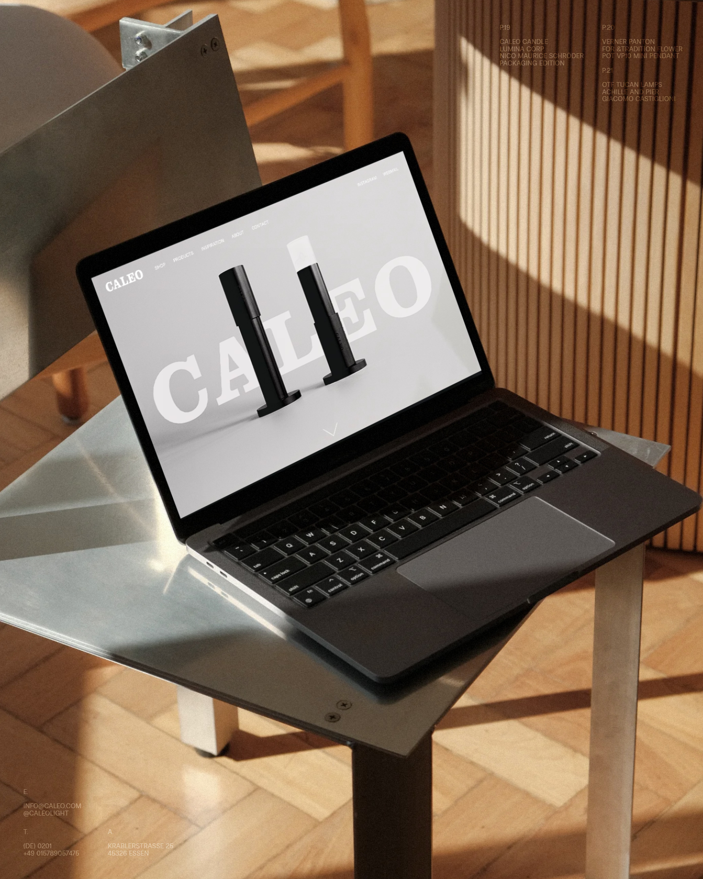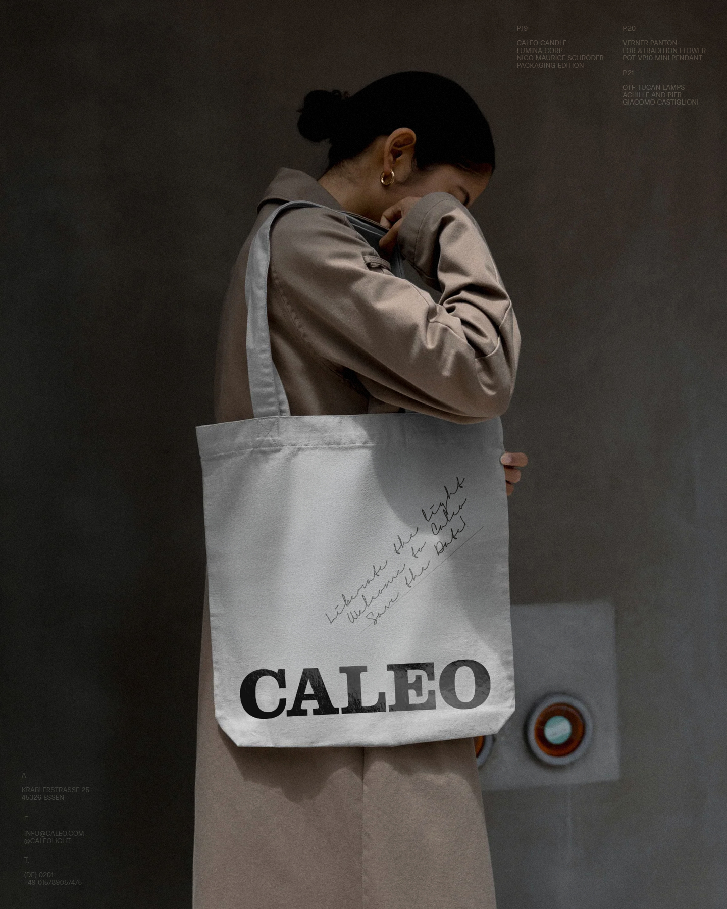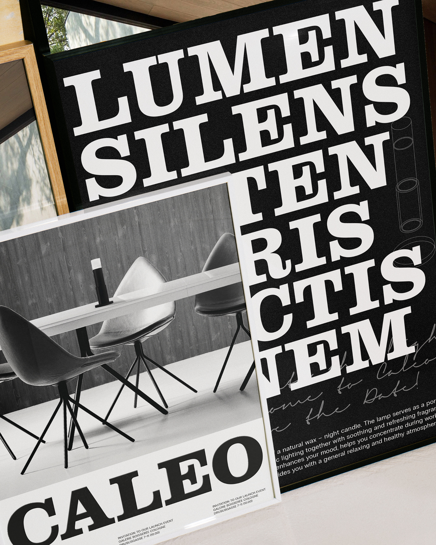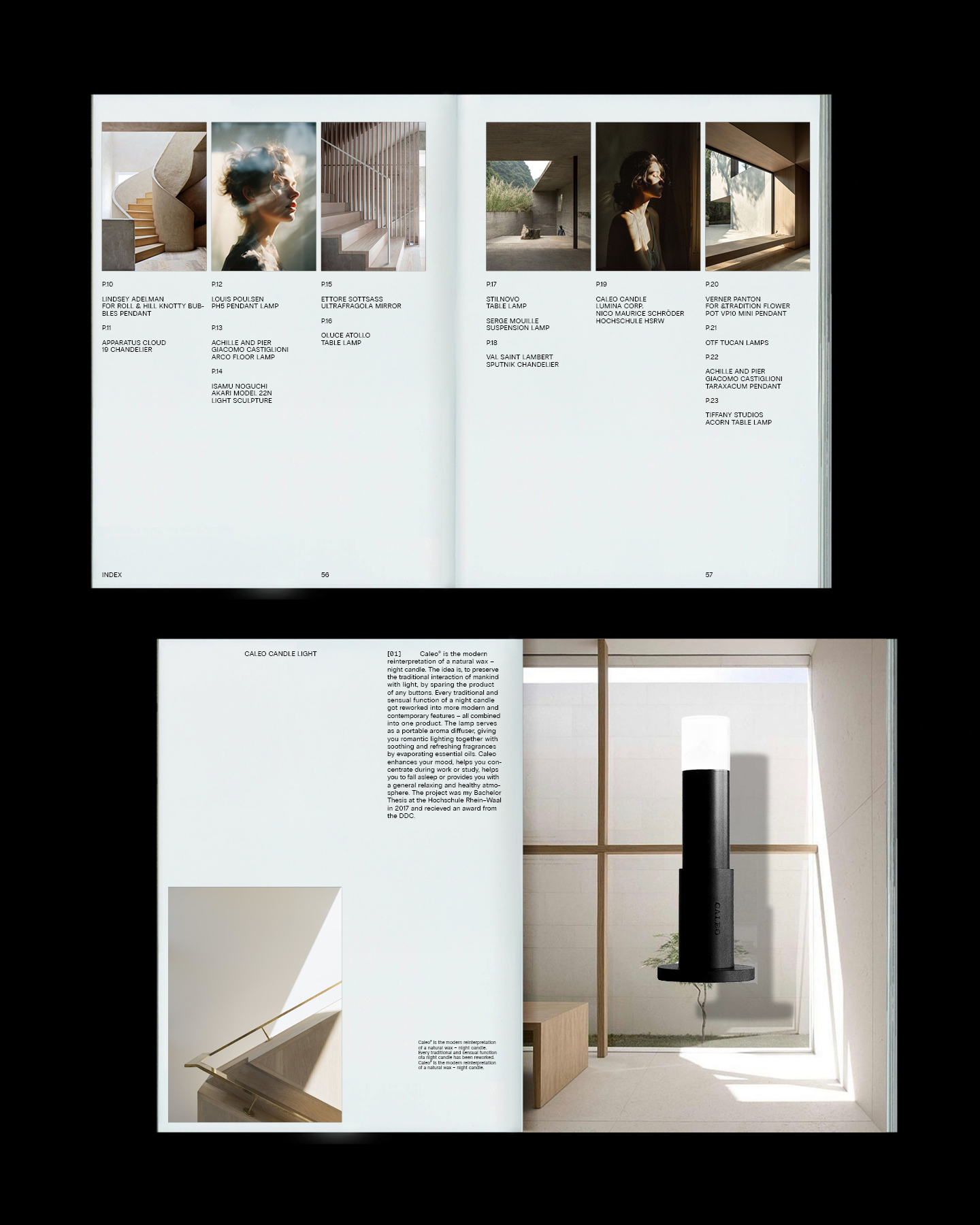 Originally designed in 2017, I redesigned the project in 2025. Clarendon and Radio Grotesk are the two typefaces I’ve chosen. The bold Clarendon (with roots in the mid-1800s) was used for the wordmark. Radio Grotesk was used for the basic lamp component and every other typographical layout. Both typefaces carry tradition and originality and the concept of old and new. The naming of the wordmark and the subproducts uses the Latin language. Since I am referencing abandoned traditions, I thought to also use an old and abandoned language for the naming of the producer. Caleo is the latin word for glow and lumina is the Latin word for lights. In the project presentation, Signerica is used to emulate handwritten notes.