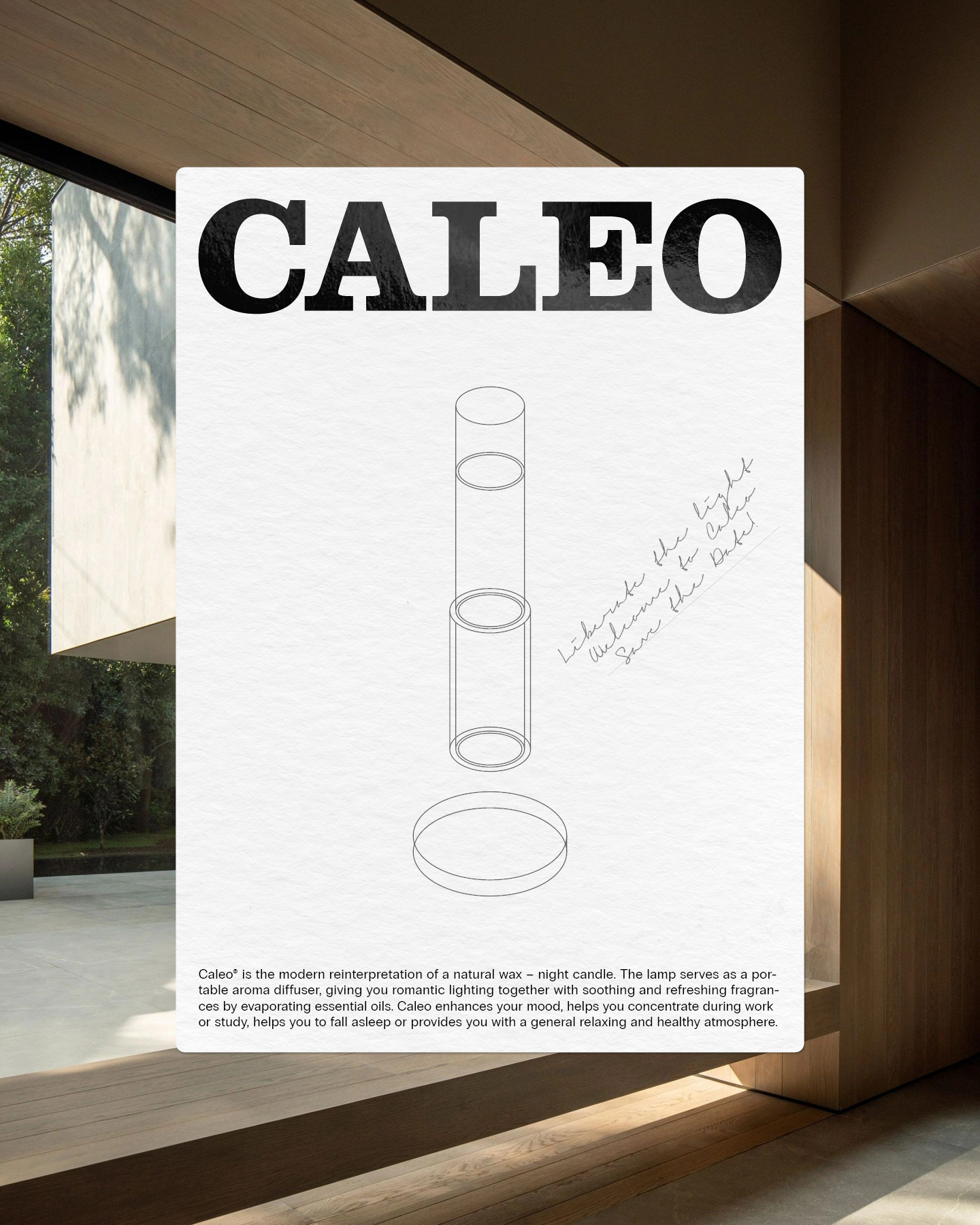 Caleo is a modern reinterpretation of the traditional night candle with a candle snuffer. The project was my Bachelor thesis at the Hochschule Rhein-Waal. The idea is to preserve the traditional interaction of man with light by sparing the product of any buttons. Every traditional and sensual function of a night candle got reworked into modern features. Additionally, the lamp serves as a portable aroma diffuser.