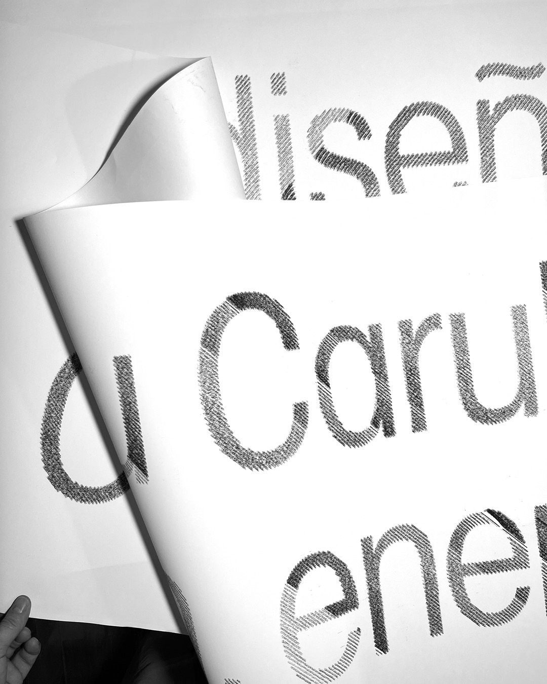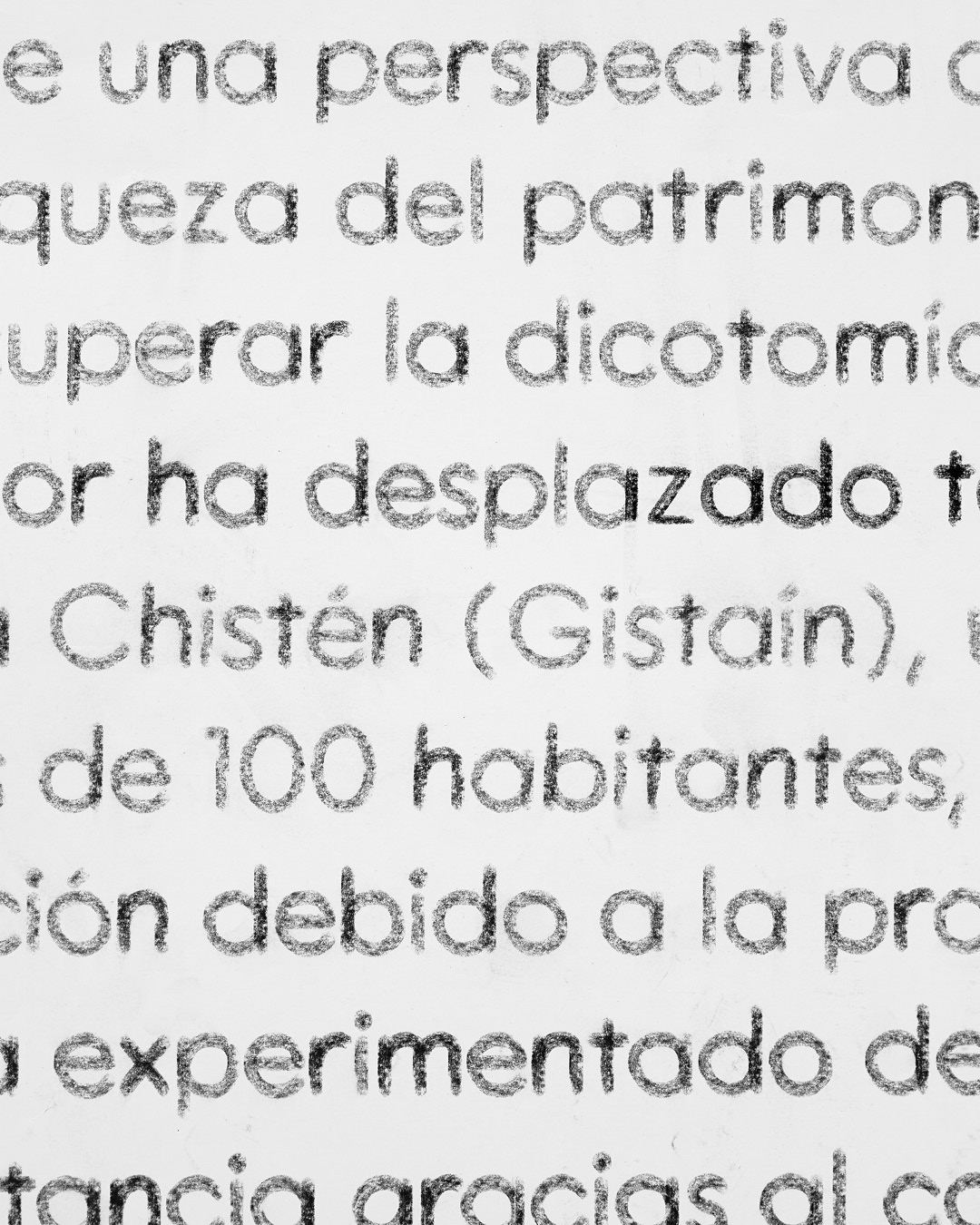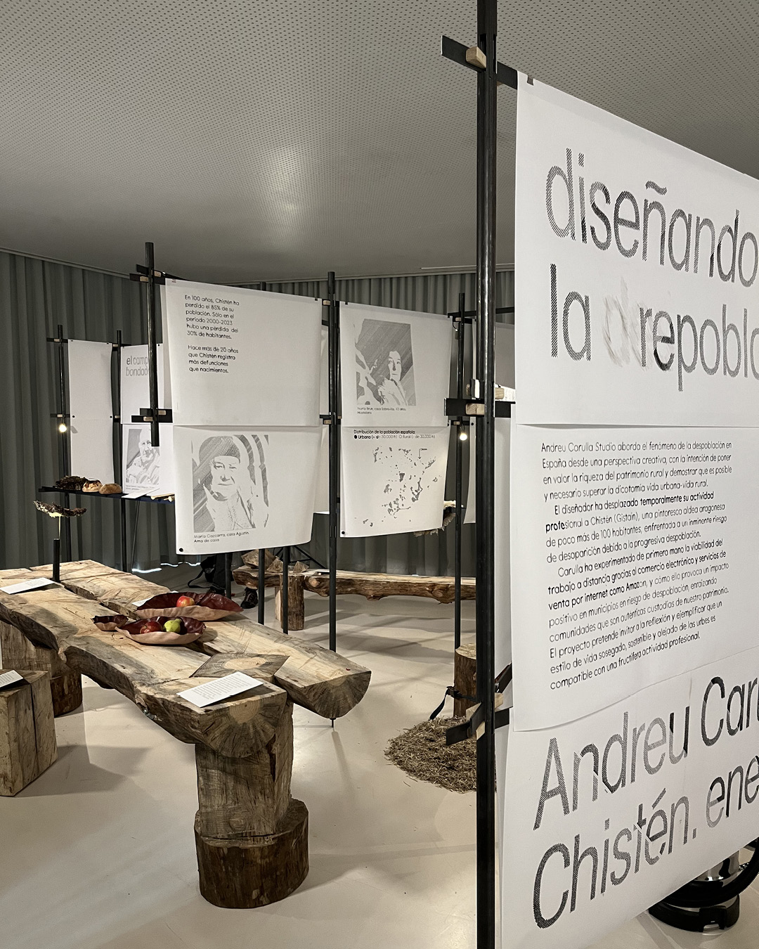 Exhibition graphics for the residency of designer Andreu Carulla in Chistén, a little village in Pyrenees Mountains, Spain. With fewer than 100 inhabitants, its aging population keeps traditional crafts, forestry, and livestock farming alive, while a small rural school survives with just three students. For ten days in January, Carulla moved his studio to Chistén to experience this reality firsthand. The result was a collection of wooden and leather pieces, designed and produced in the village using materials sourced from its surroundings.
