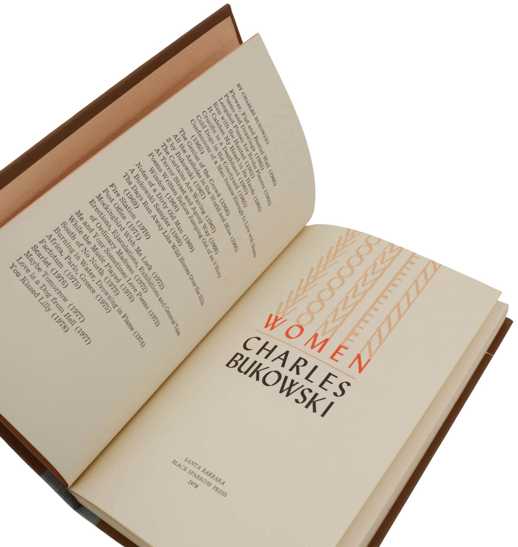 What a joy and delight it is find fine books covers using Lydian. The first edition of Charles Bukowski’s Women uses Lydian for author and title on the cover (in all caps, naturally). And also, at least judging by photos found on Abebooks, Lydian is used for the interior title page, with the title in red, repeated several times above in gold.