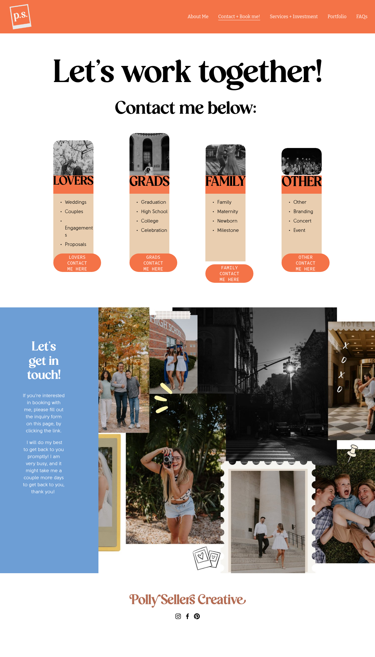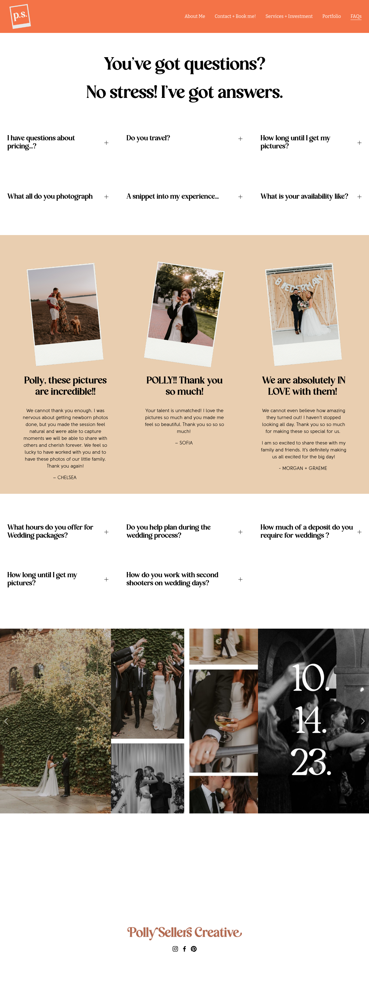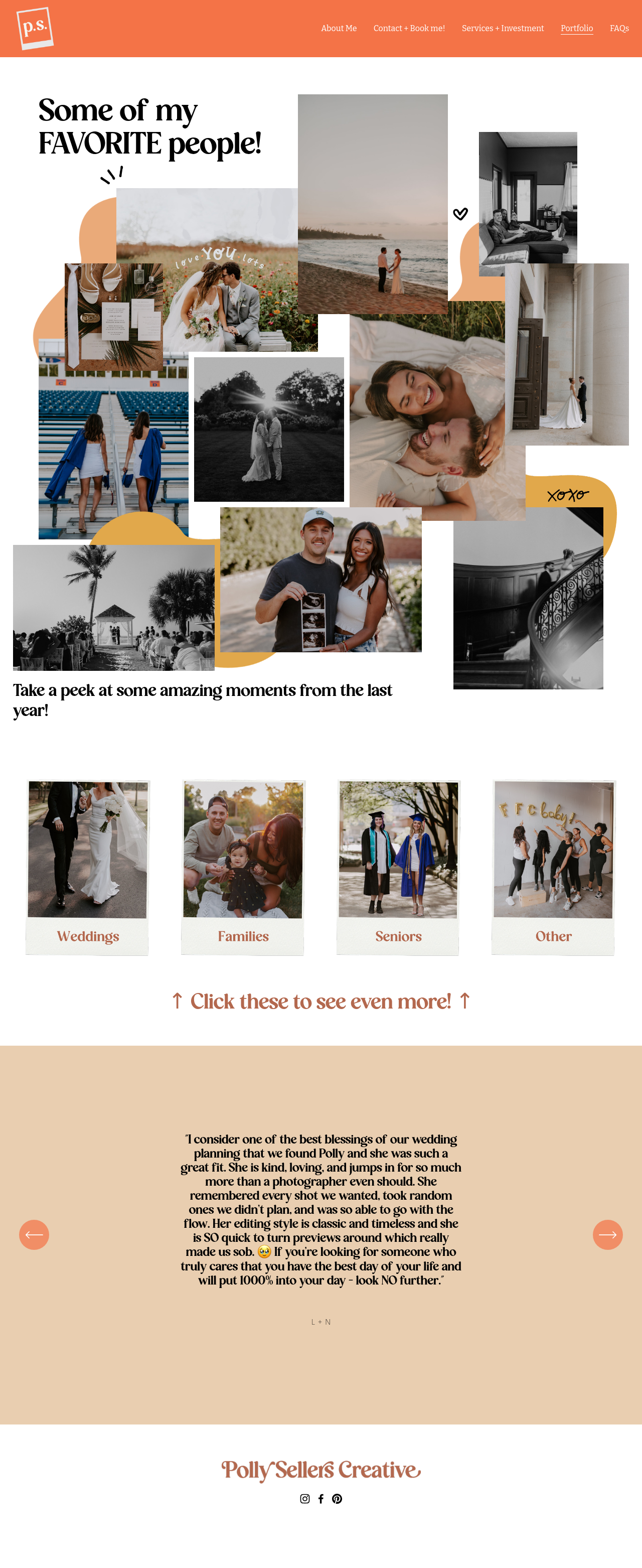 The branding for Polly Sellers Creative, designed by Janna K Creative, features Orange Squash from Pixesia Studio as the core typeface for the logo and primary headlines. Bitter by Huerta Tipográfica is utilized for the navigation elements, while Adobe’s Source Code is used for the text buttons.