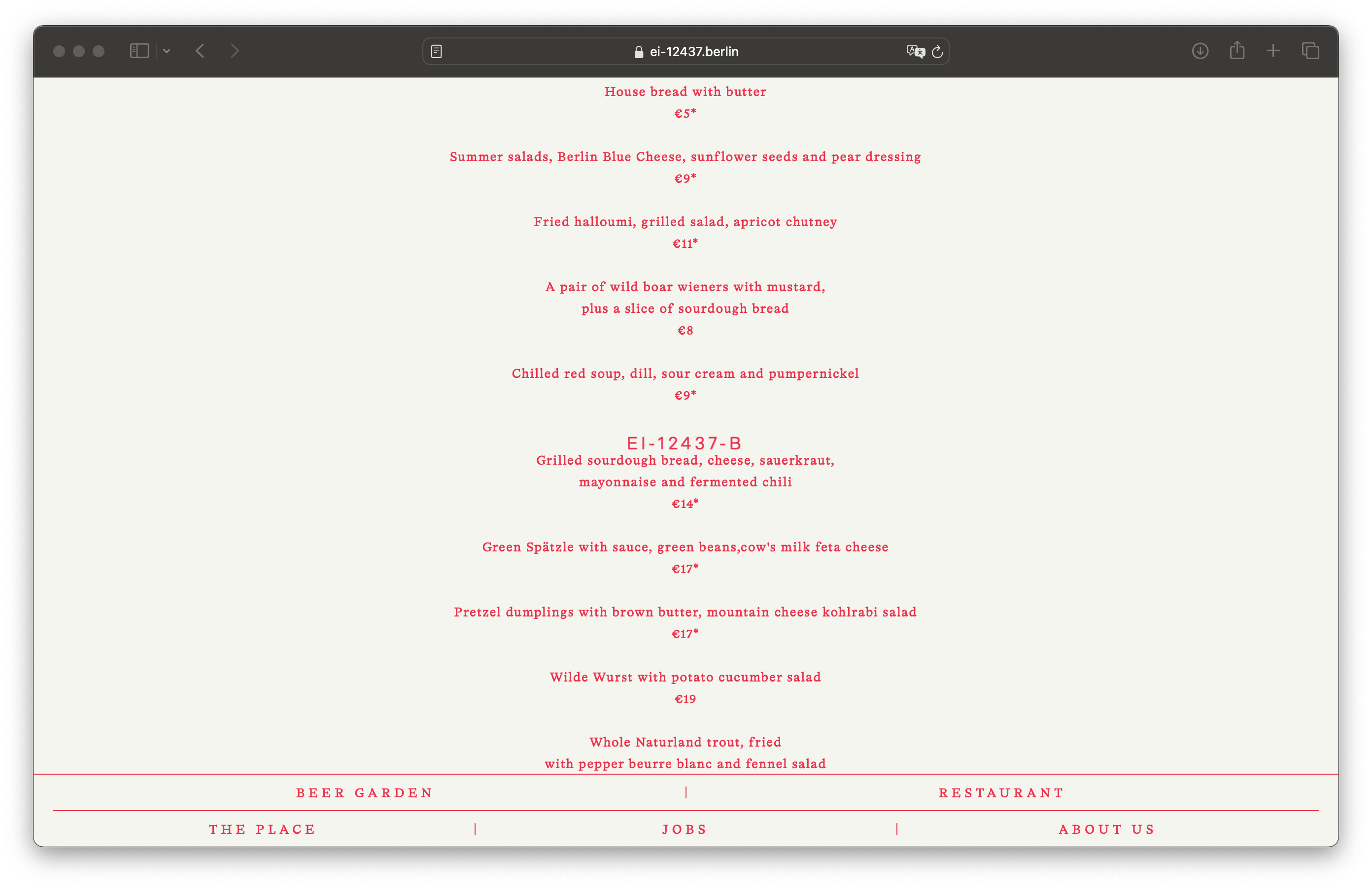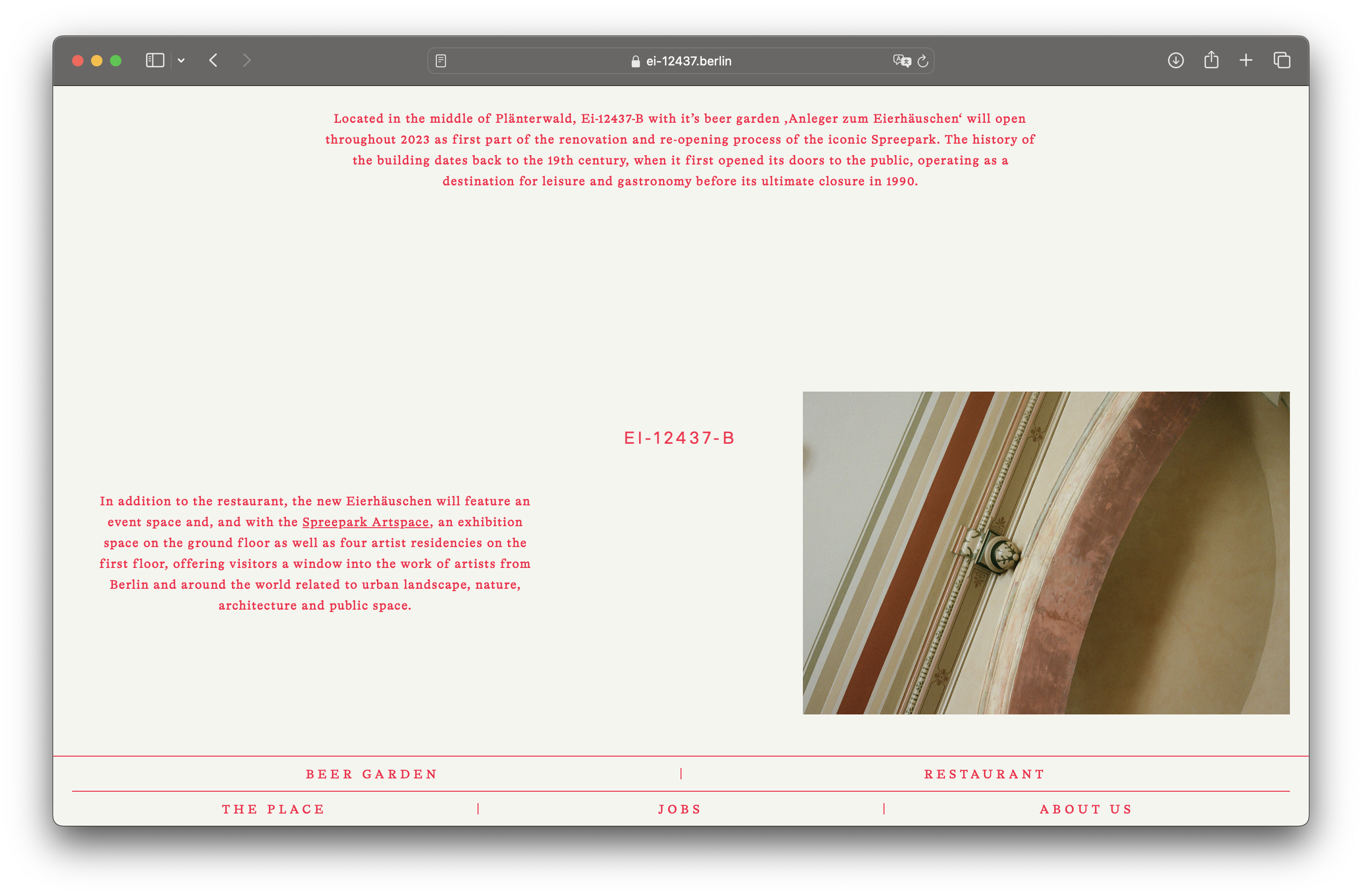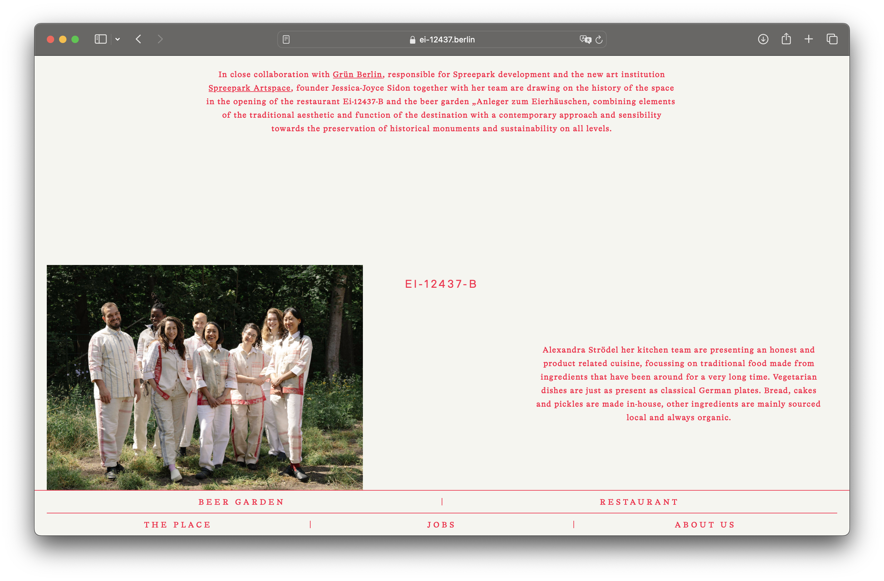 Since 2023, restaurant EI-12437-B has been serving “a modern take on German classics” in a historical, refurbished building called the “Eierhäuschen” (Egg House). It was built in the early 1890s and was a popular destination for leisure and gastronomy, especially during the GDR era, before its ultimate closure in 1990. In addition to the restaurant, the renovated country-style structure features an event and exhibition space, as well as a beer garden. The restaurant’s identity and website were designed by Hei Agenda, typeset in Scto Grotesk A by Schick Toikka and HAL Timezone by HAL Typefaces.