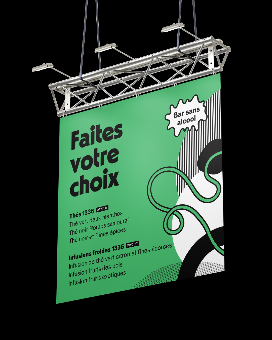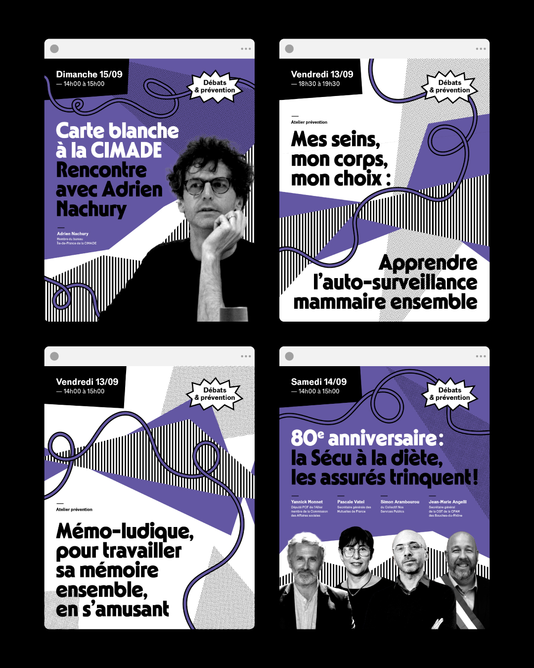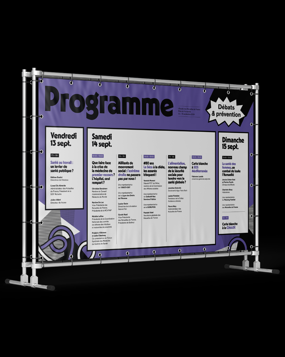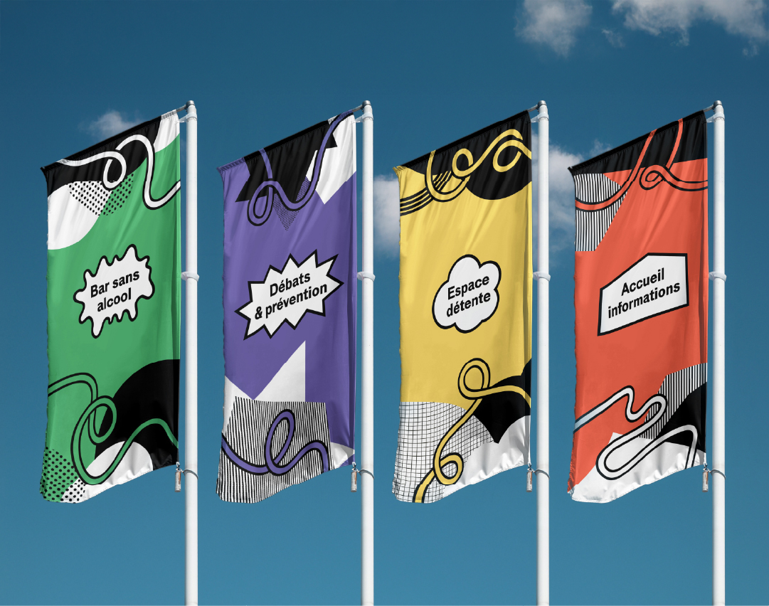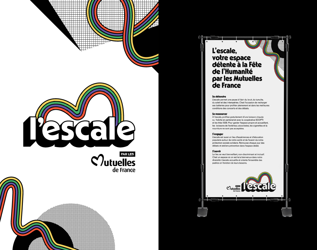 Graphic identity for L’Escale, a space for relaxation, revitalization, and civic engagement hosted by Mutuelles de France at Fête de l’Humanité.